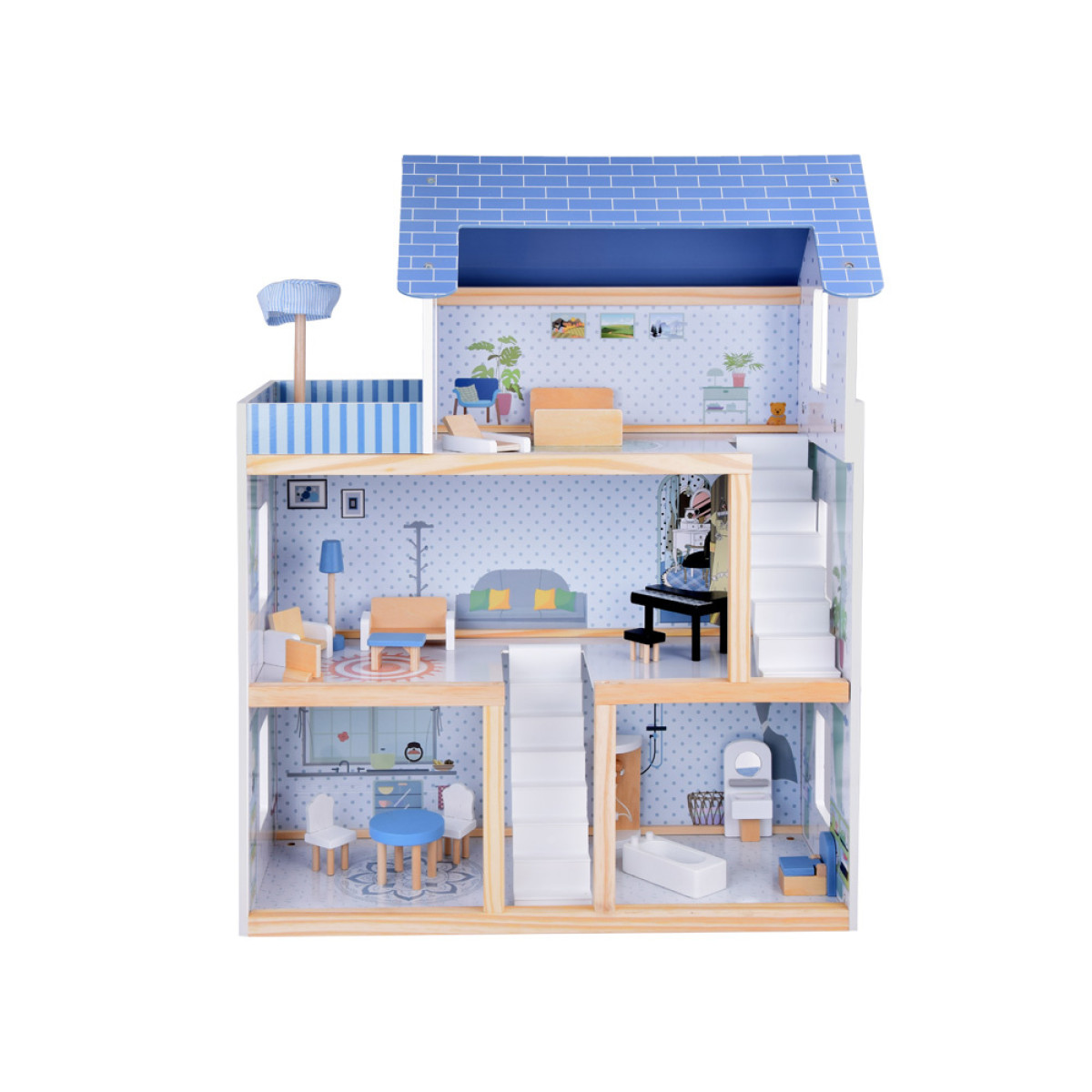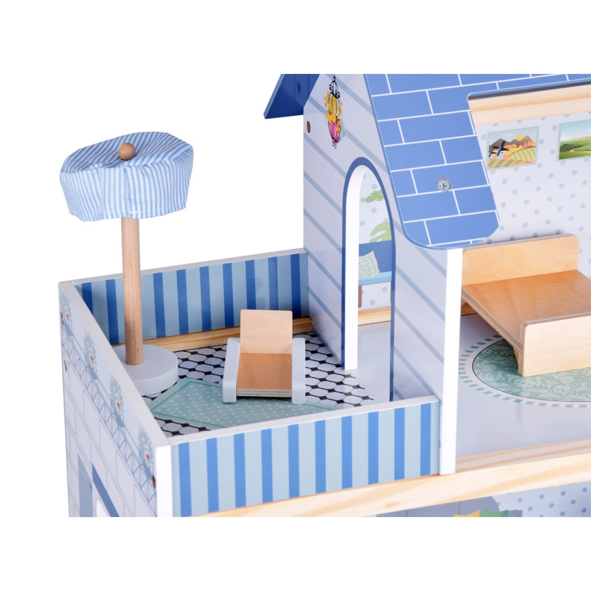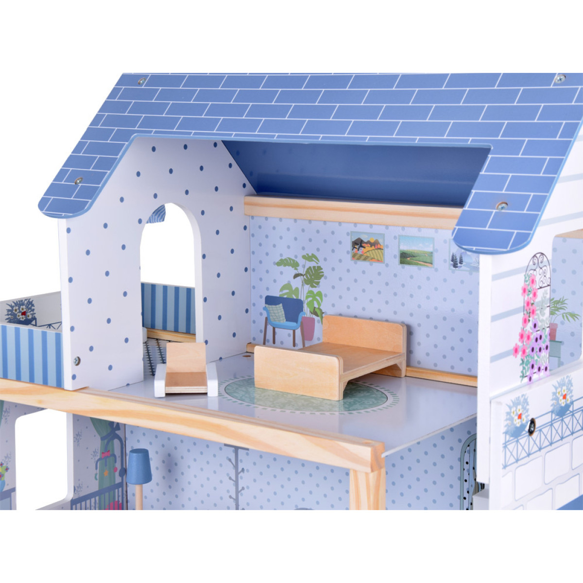 Medinis mėlynas lėlių namelis su baldais, 3 aukštai, terasa