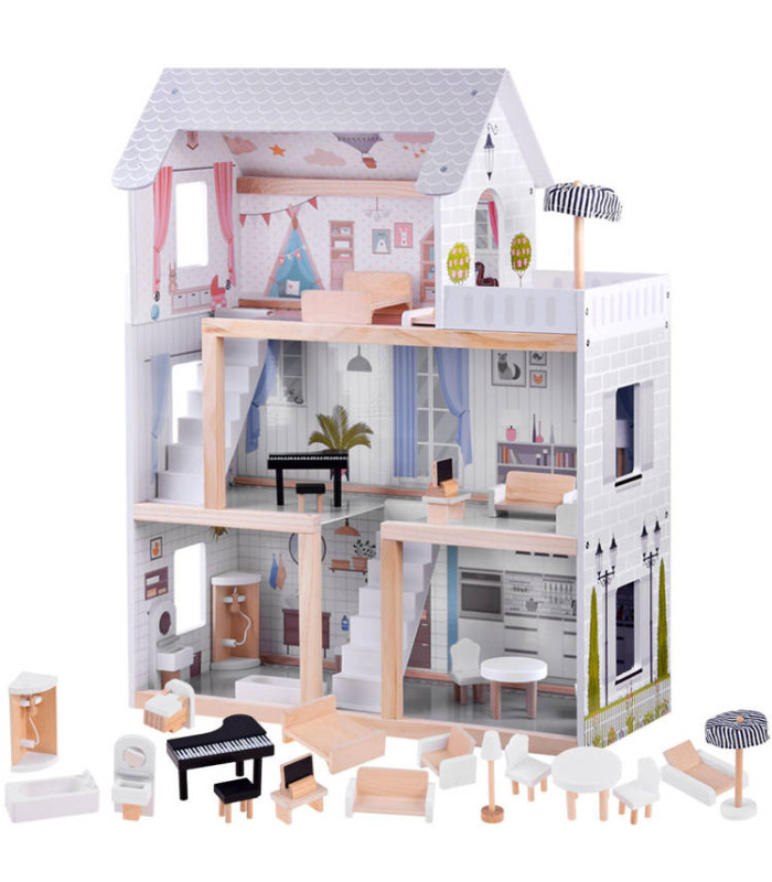 Medinis lėlių namelis su baldais – tai itin stilinga vila Boho stiliuje. Ši trijų aukštų vila turi keturias erdvias patalpas, terasą ir laiptus. Namelio spalvų paletė yra labai subtili ir stilinga, kviečianti gyventi. Patalpų baldai išlaikyti balto ir medžio atspalvių, kas dar labiau pabrėžia patalpų stilingumą. Erdvės apšviestos ramia LED šviesa, todėl kiekvienas jausis komfortiškai.