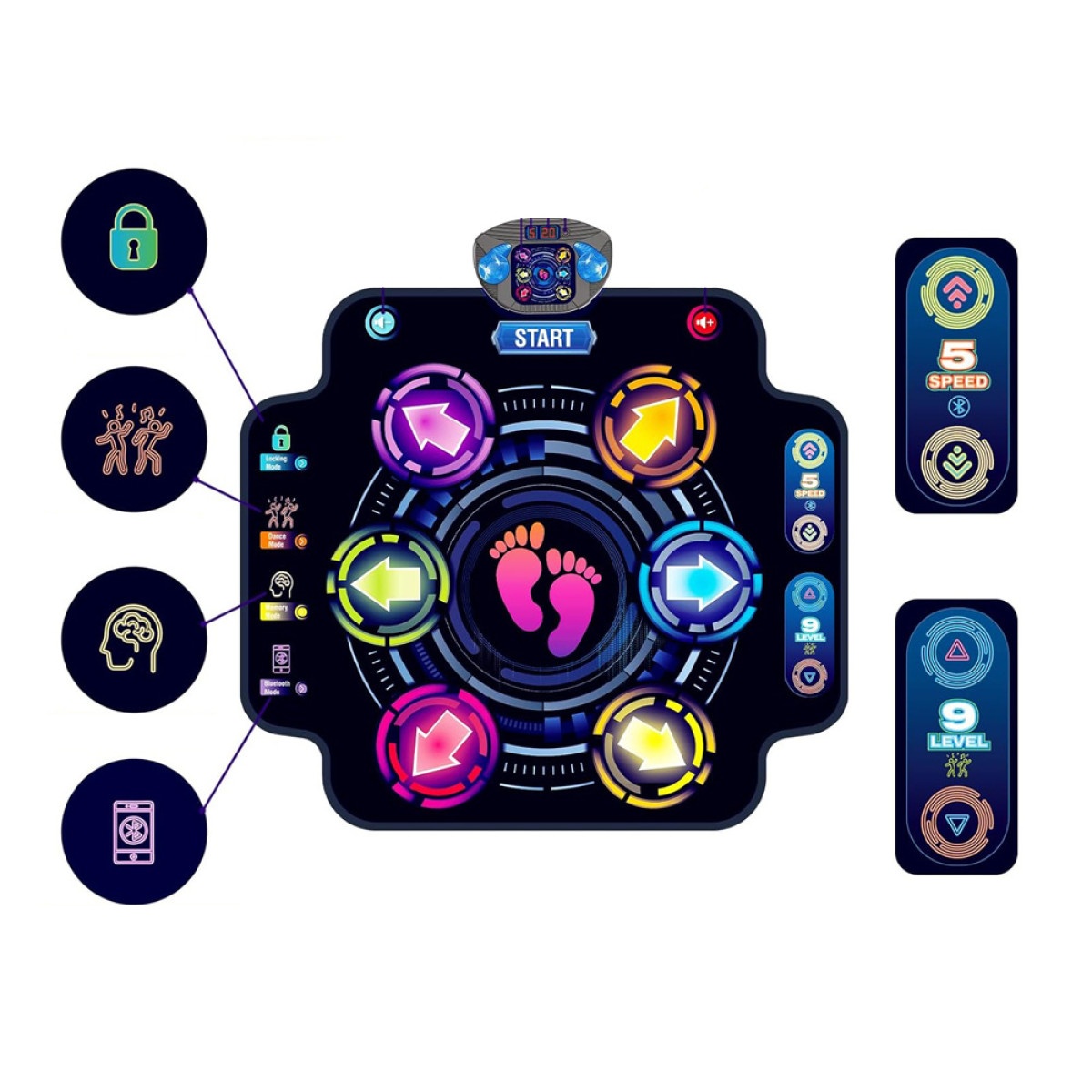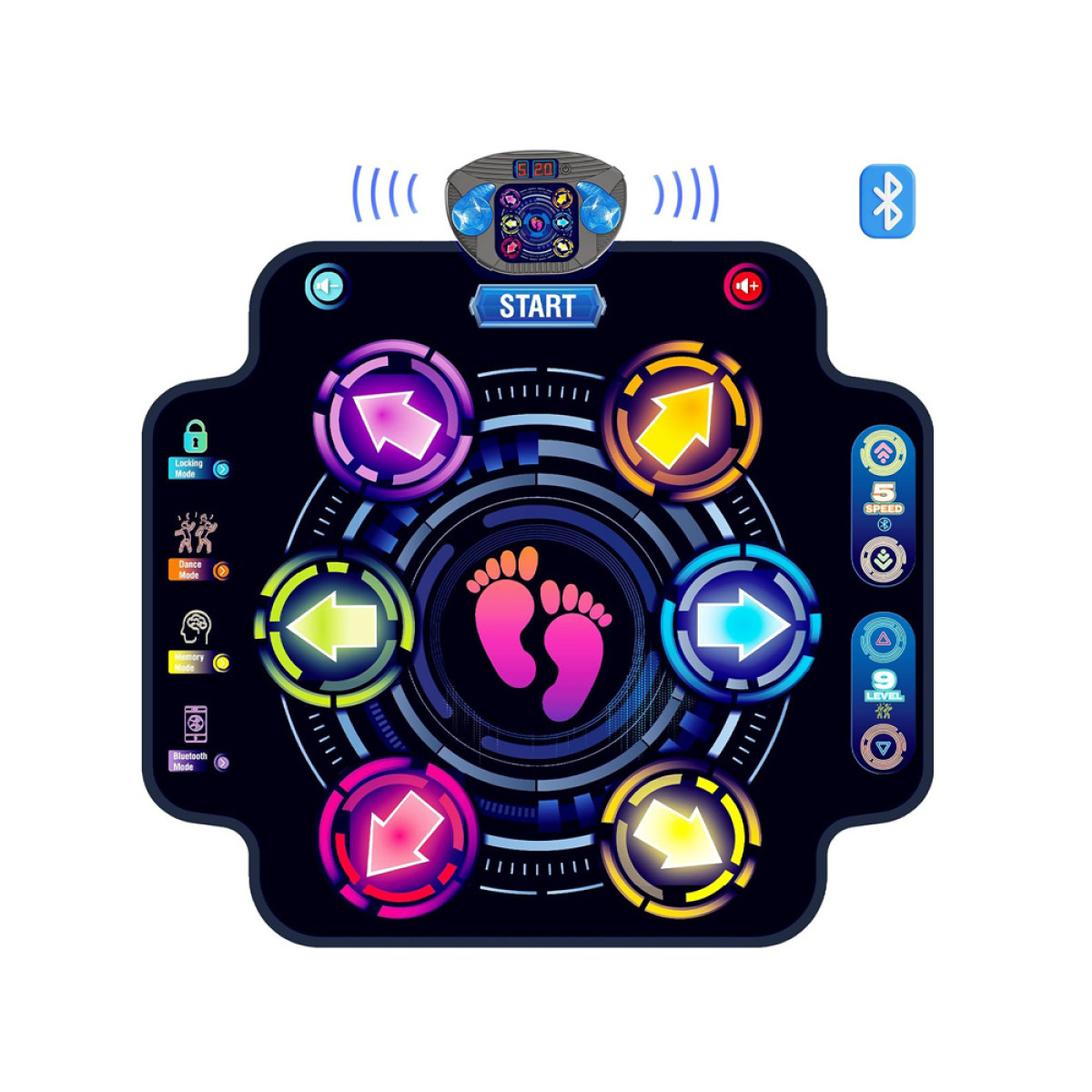 - „Bluetooth“ režimas: Prijunkite savo mobilųjį įrenginį ir pasirinkite dainą, pagal kurią šoksite. Galite reguliuoti penkis greičio lygius.