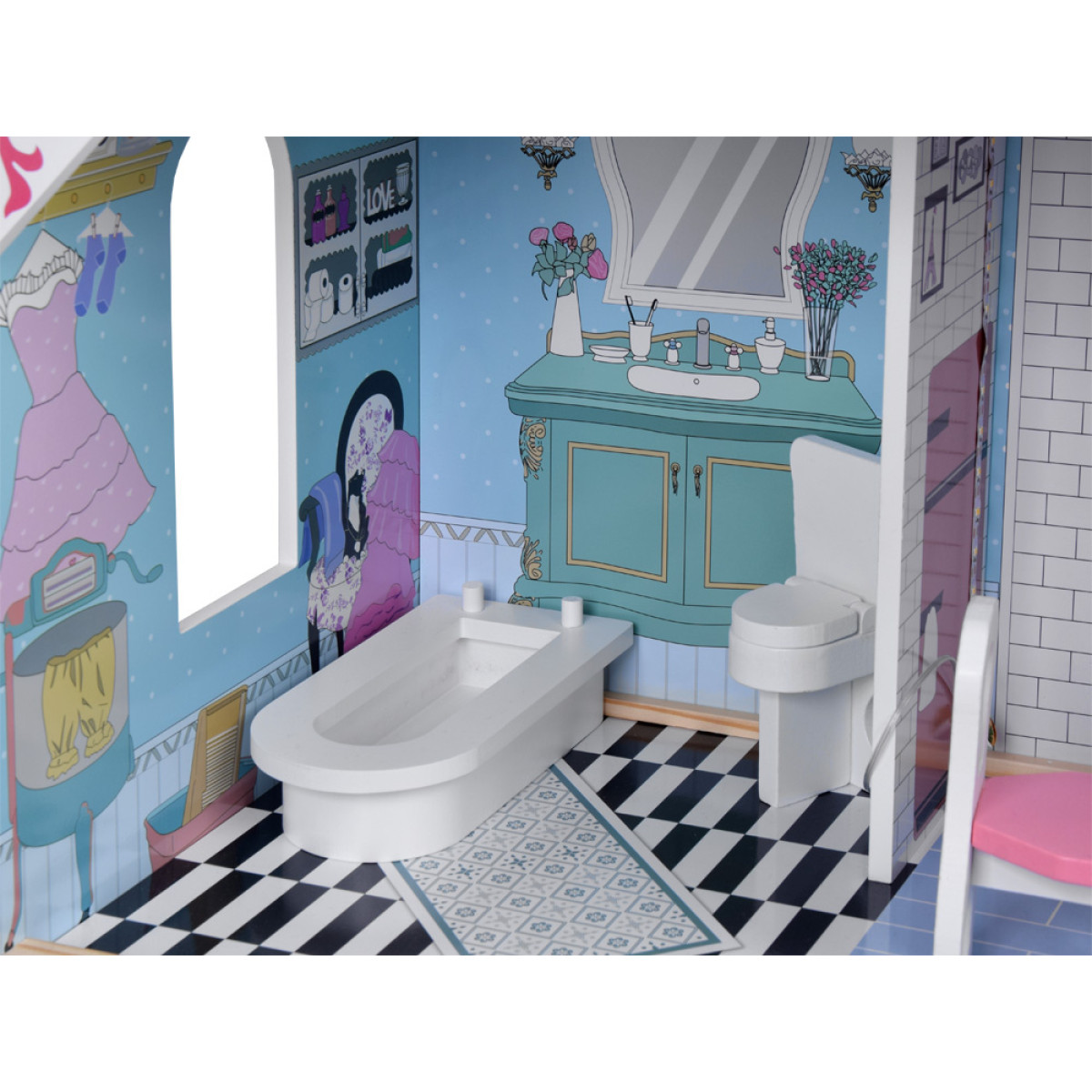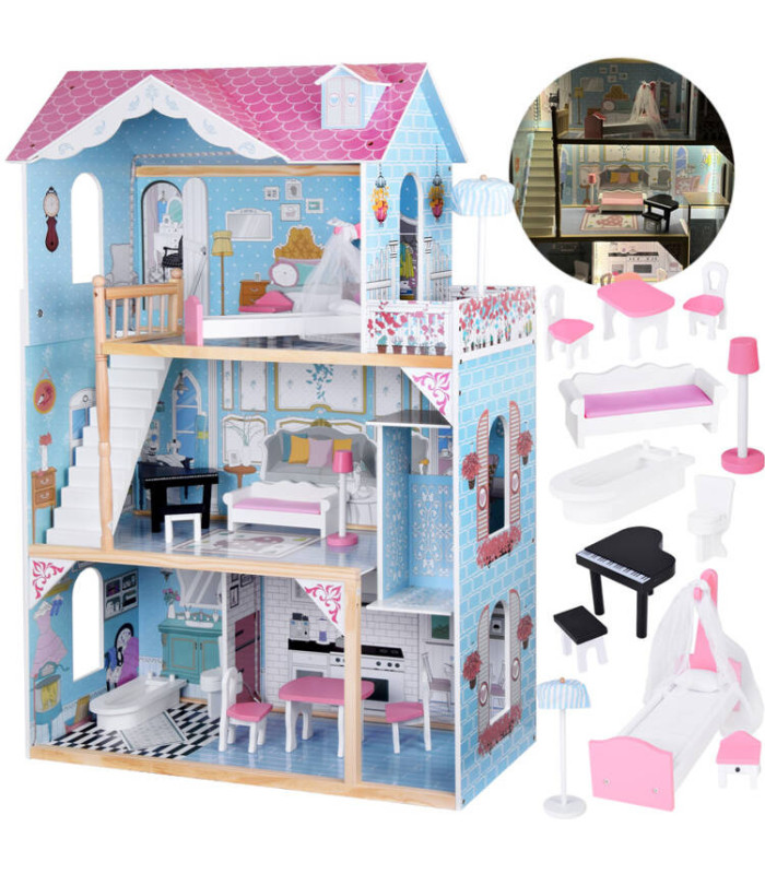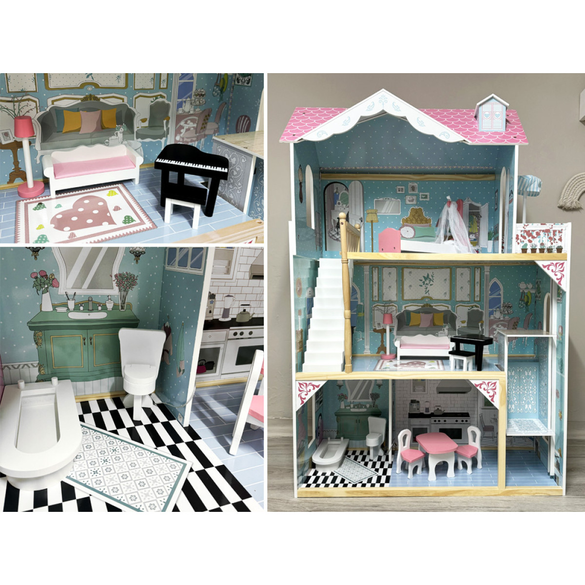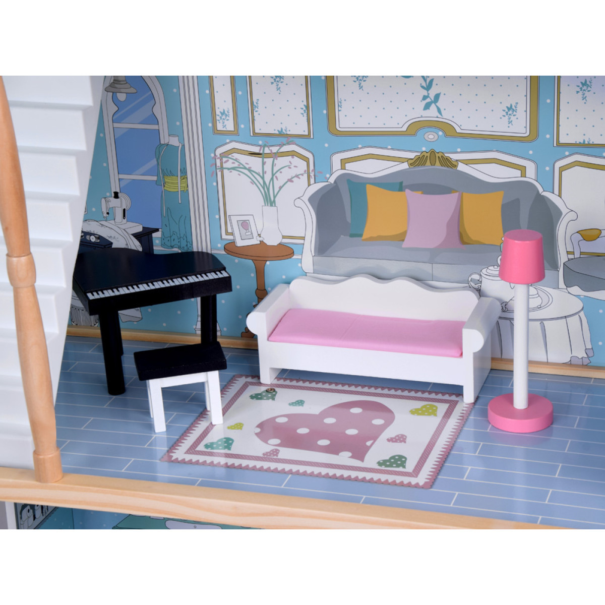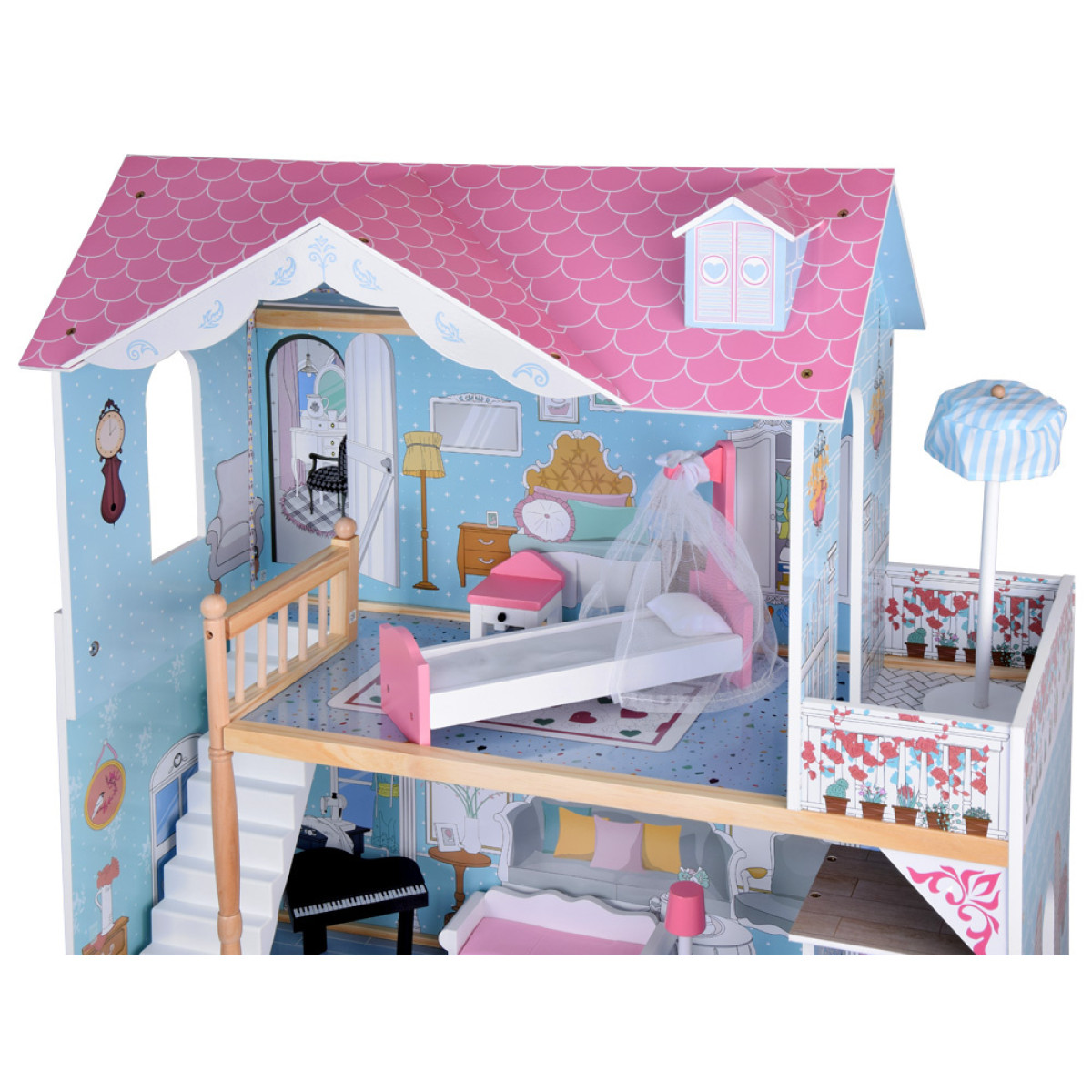Didelis medinis lėlių namelis su baldais pastelinėmis spalvomis