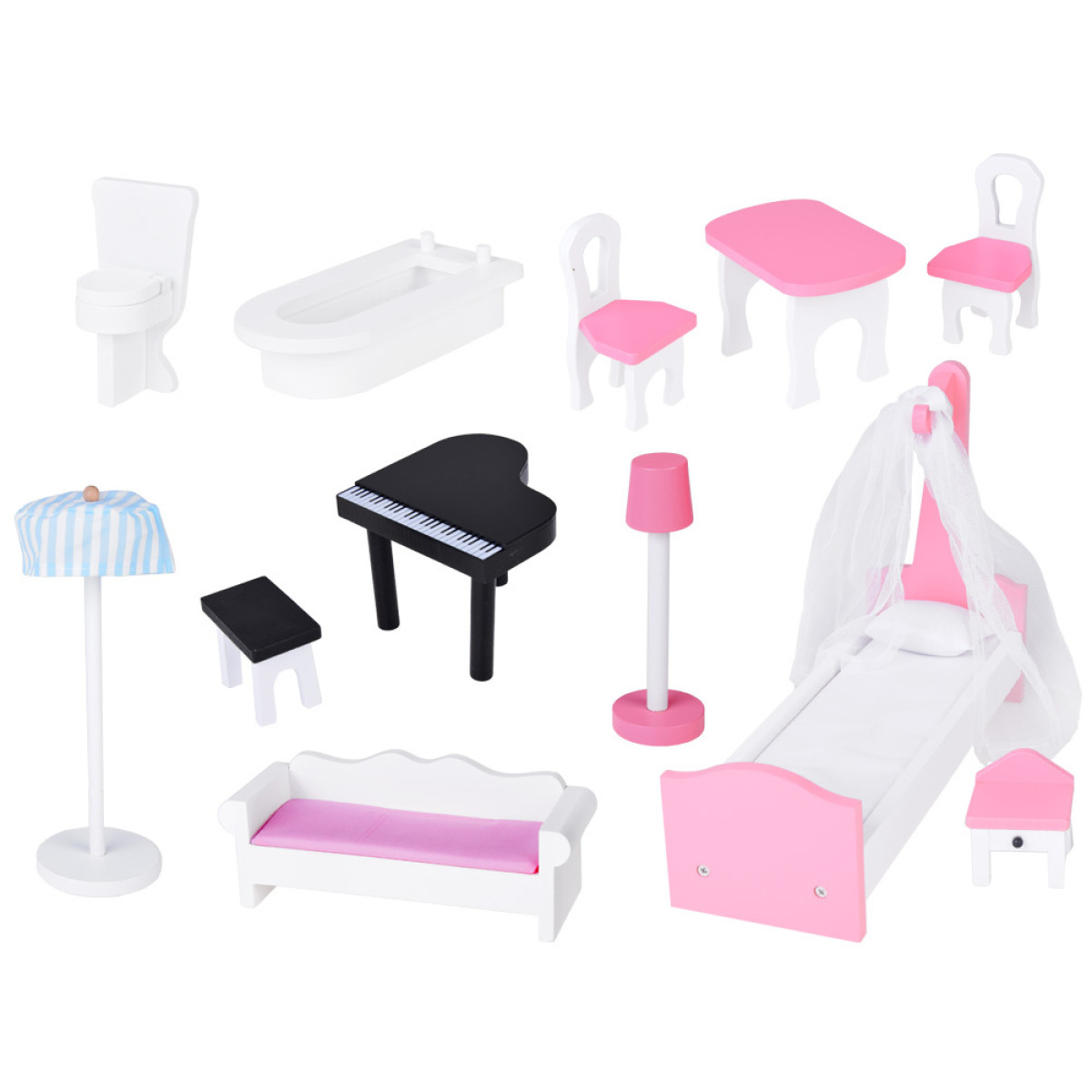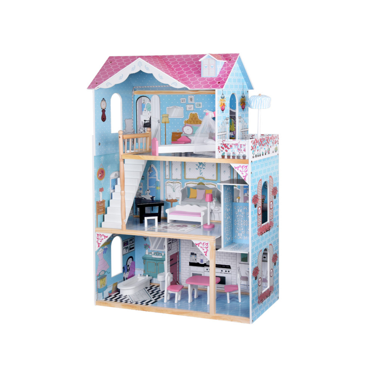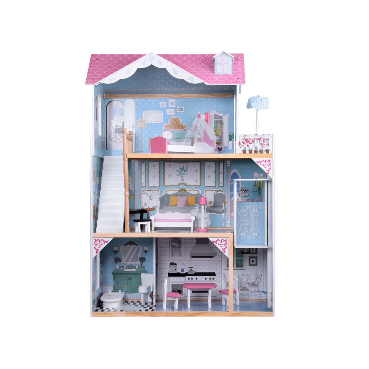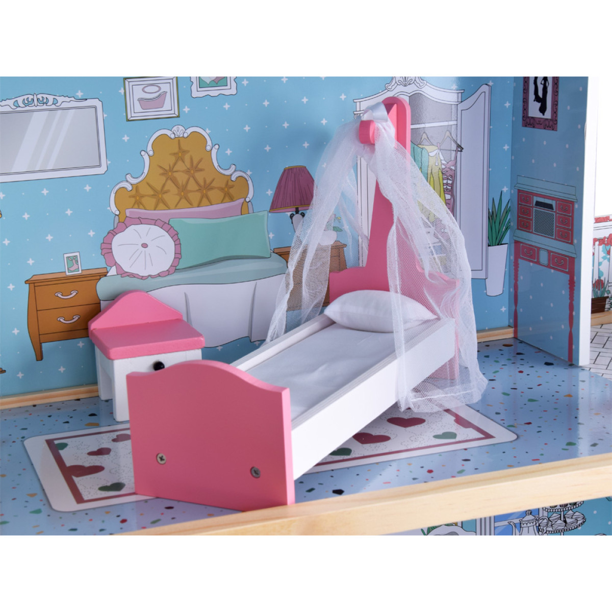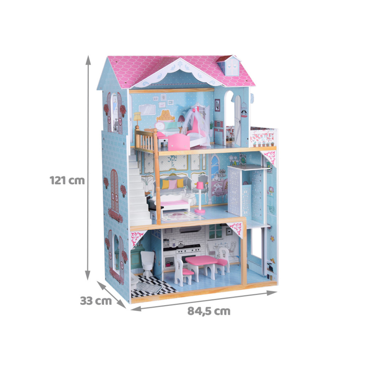 Didelis medinis lėlių namelis su baldais pastelinėmis spalvomis