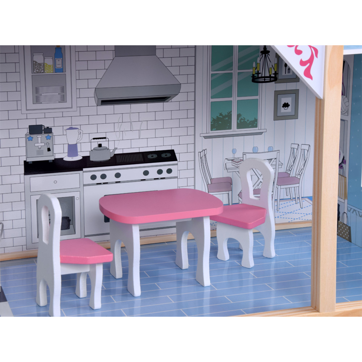 Namelis yra tvirta medinė konstrukcija, kuri žavi savo švelnių spalvų palete. Jis puikiai tiks mažosios princesės kambariui! Namelis turi du aukštus ir pirmąjį aukštą, kur rasite daugybę patogumų gyventojams. Namelis turi langus, pro kuriuos gali žvelgti lėlės.