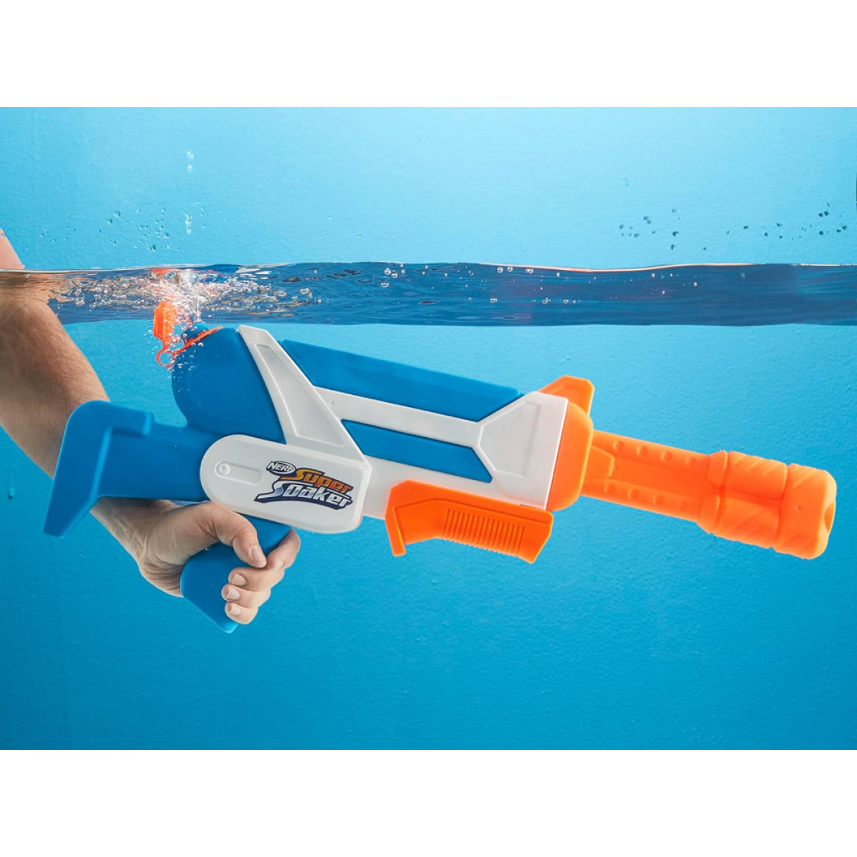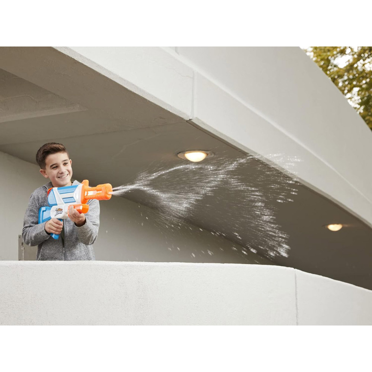 Kuo jis išsiskiria? - žinoma, savo dydžiu ir talpa! Tačiau tai dar ne viskas! Nepaisant savo gabaritų, jis yra labai patogus laikyti. Šaudant galima jį laikyti ant dešinio arba kairio peties, taip atpalaiduodami vieną ranką. Be to, Nerf išspaudžia vandenį iš dviejų skylučių kelių metrų atstumu, sukuriant vėjuojančias sroves. Tai įspūdingas efektas, kurį įvertins kiekvienas naudotojas. Tereikia atidaryti dangtelį, esantį viršutinėje ginklo dalyje, įpilti vandens ir šaudyti, pompuojant pailgą gaiduką. Su šiuo modeliu tikrai būsi geriausias žaidėjas!