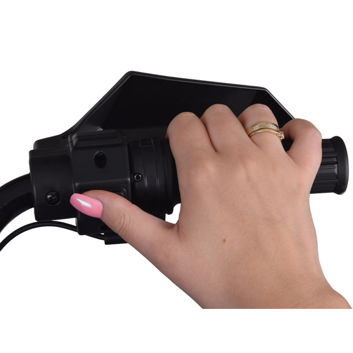 Šalia yra jungiklis važiavimo krypties (pirmyn-stop-atgal) keitimui. Norint pradėti važiuoti, reikia pasukti manetę ant vairo, o norint sustabdyti - atleisti manetę arba paspausti stabdžio pedalą su koja.