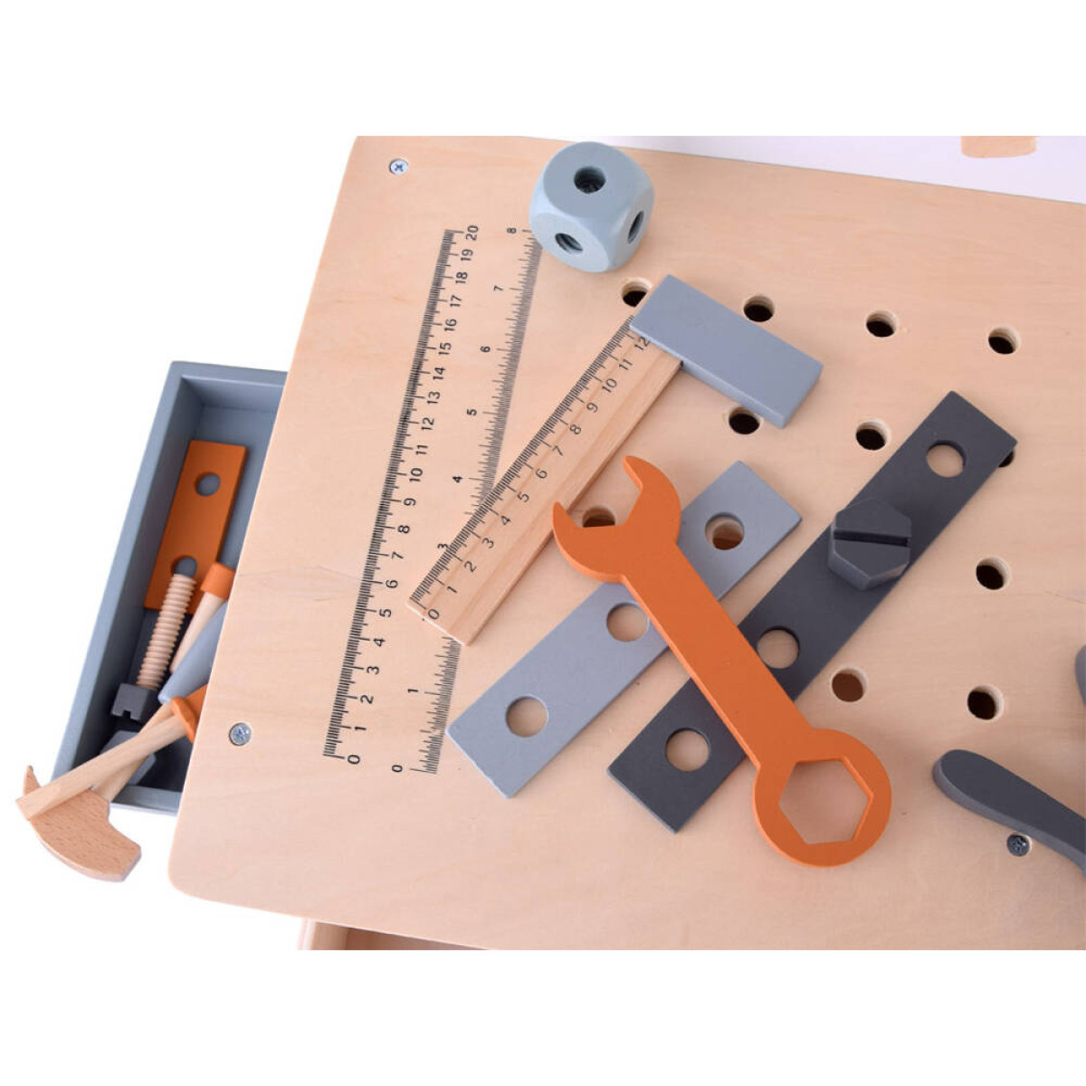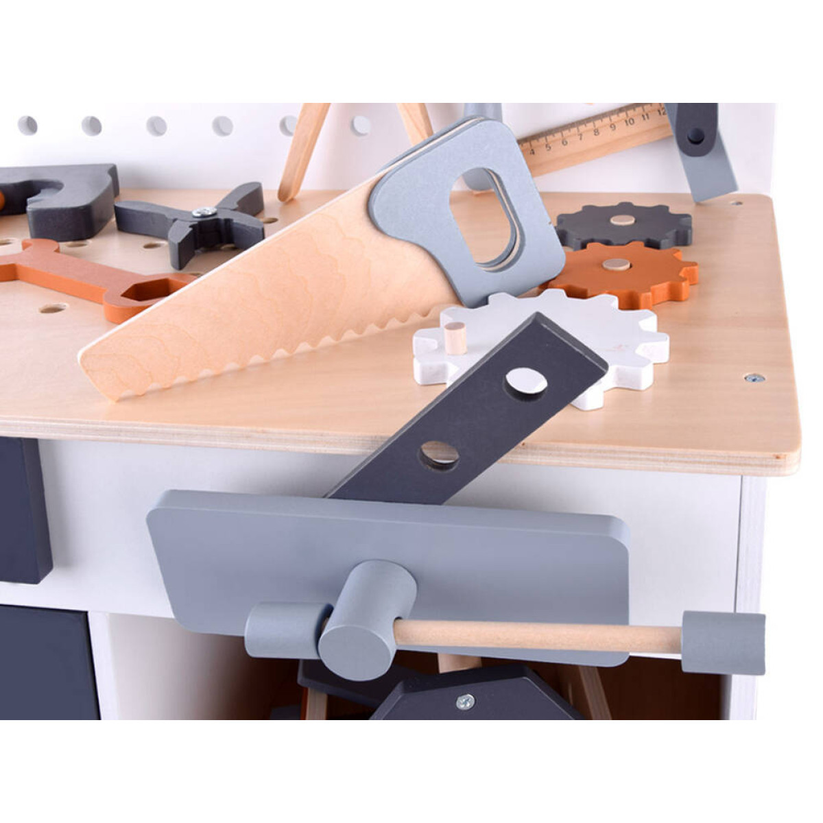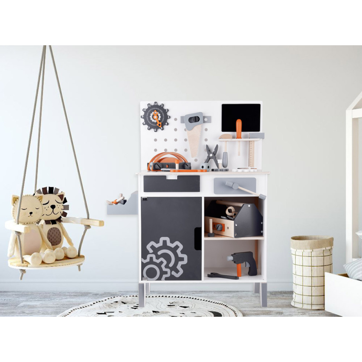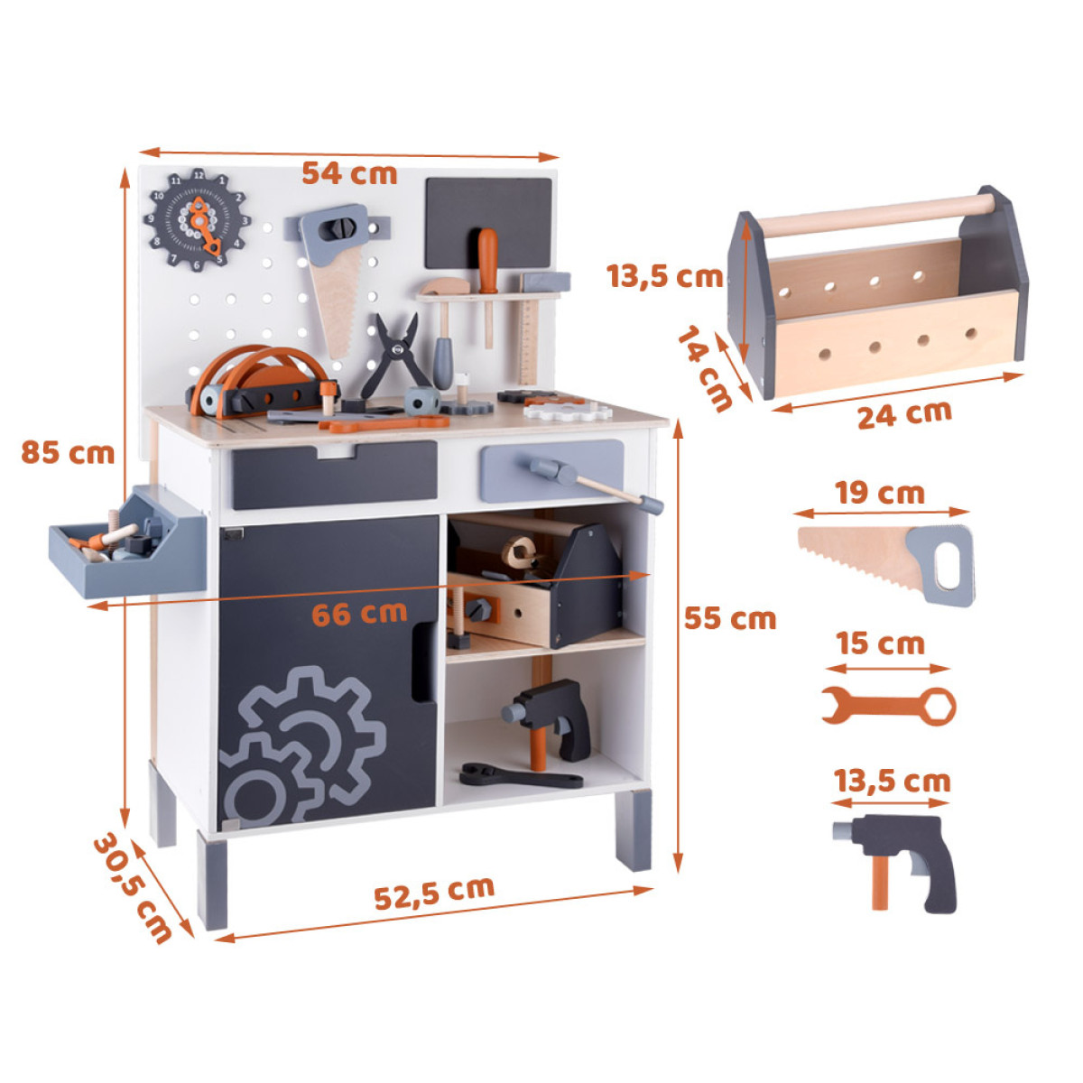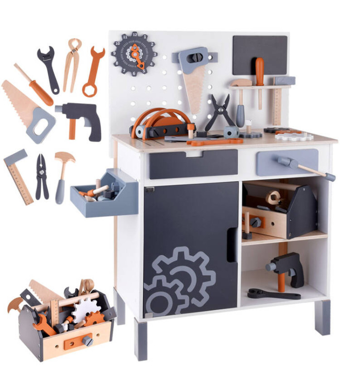 Šis didelis medinis dirbtuvių rinkinys yra puiki žaislų kolekcija, kuri tikrai nudžiugins kiekvieną vaiką. Rinkinį sudaro daugybė medinių dalių ir net 55 aksesuarai, kuriuos galima rasti profesionaliame dirbtuvėje. Čia yra visi būtini įrankiai, tokie kaip atsuktuvas, plaktukas, varžtai, pavaros, veržlės, matavimo juostos, replės, pjūklas, raktai ir kt., taip pat talpi įrankių dėžė, juoda lenta rašymui su kreida bei laikrodis su judančiomis rodyklėmis.