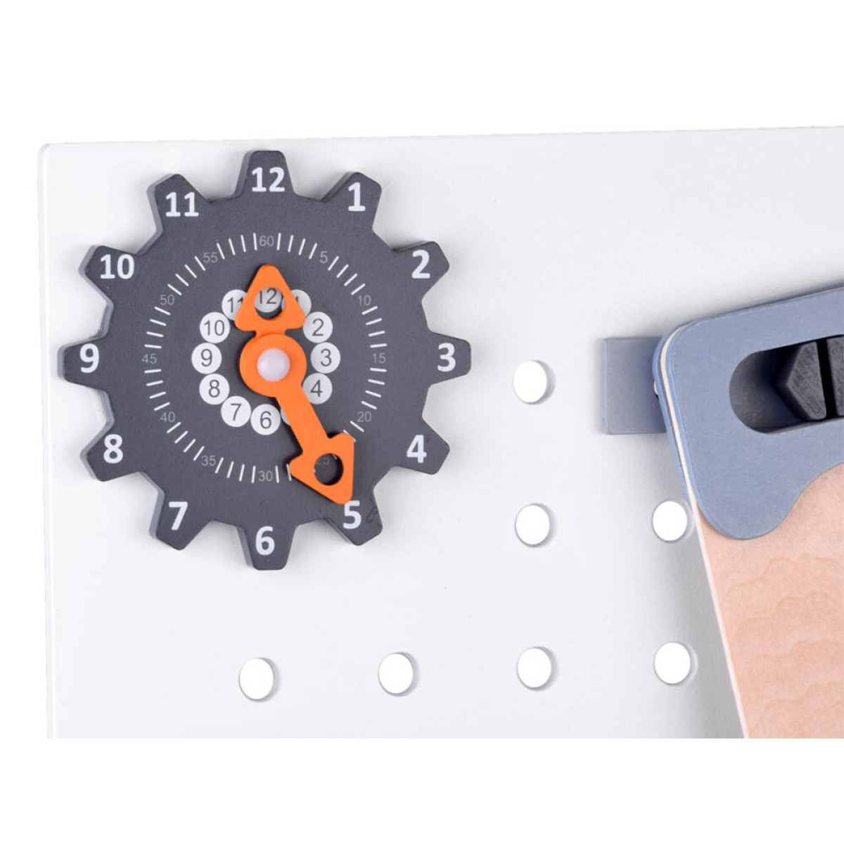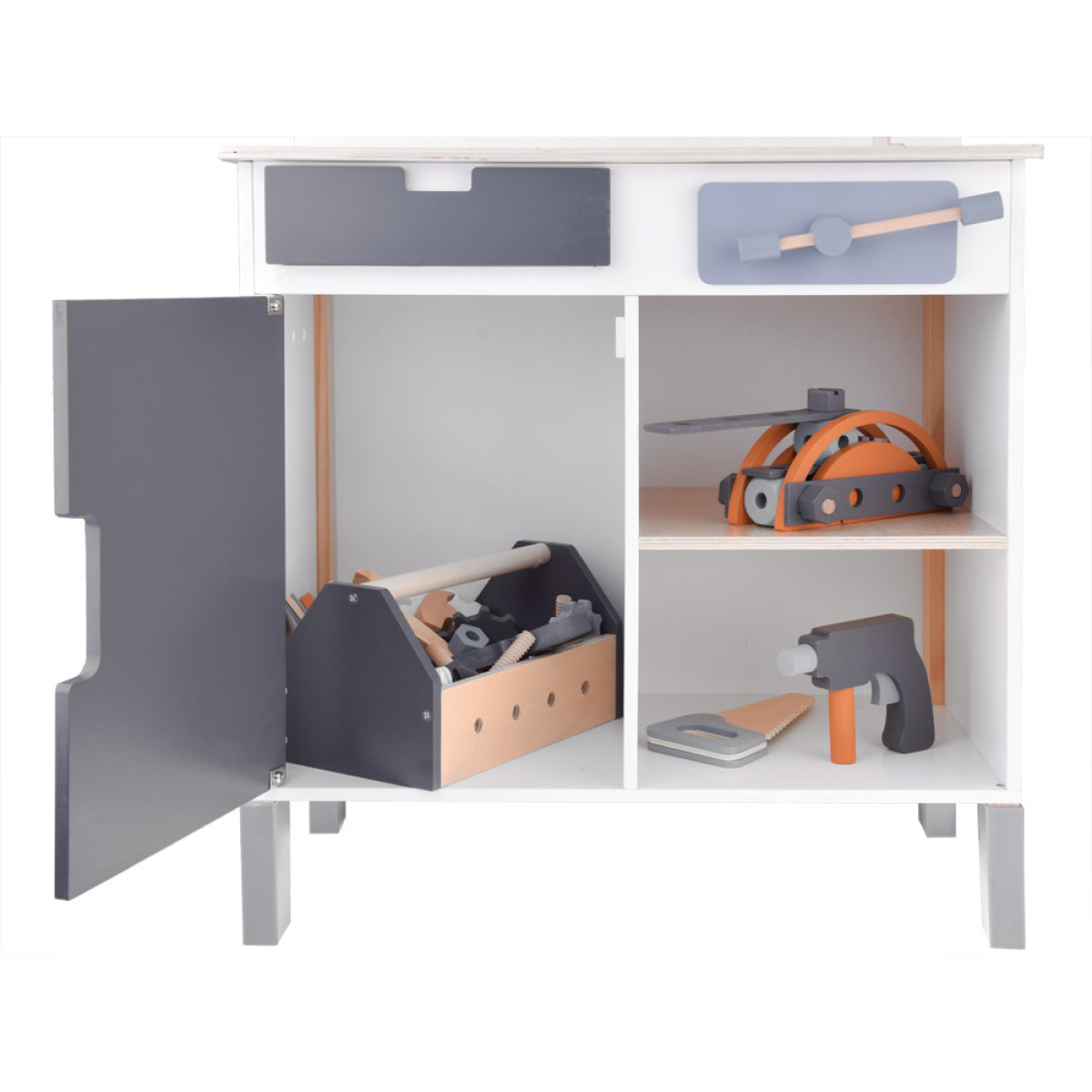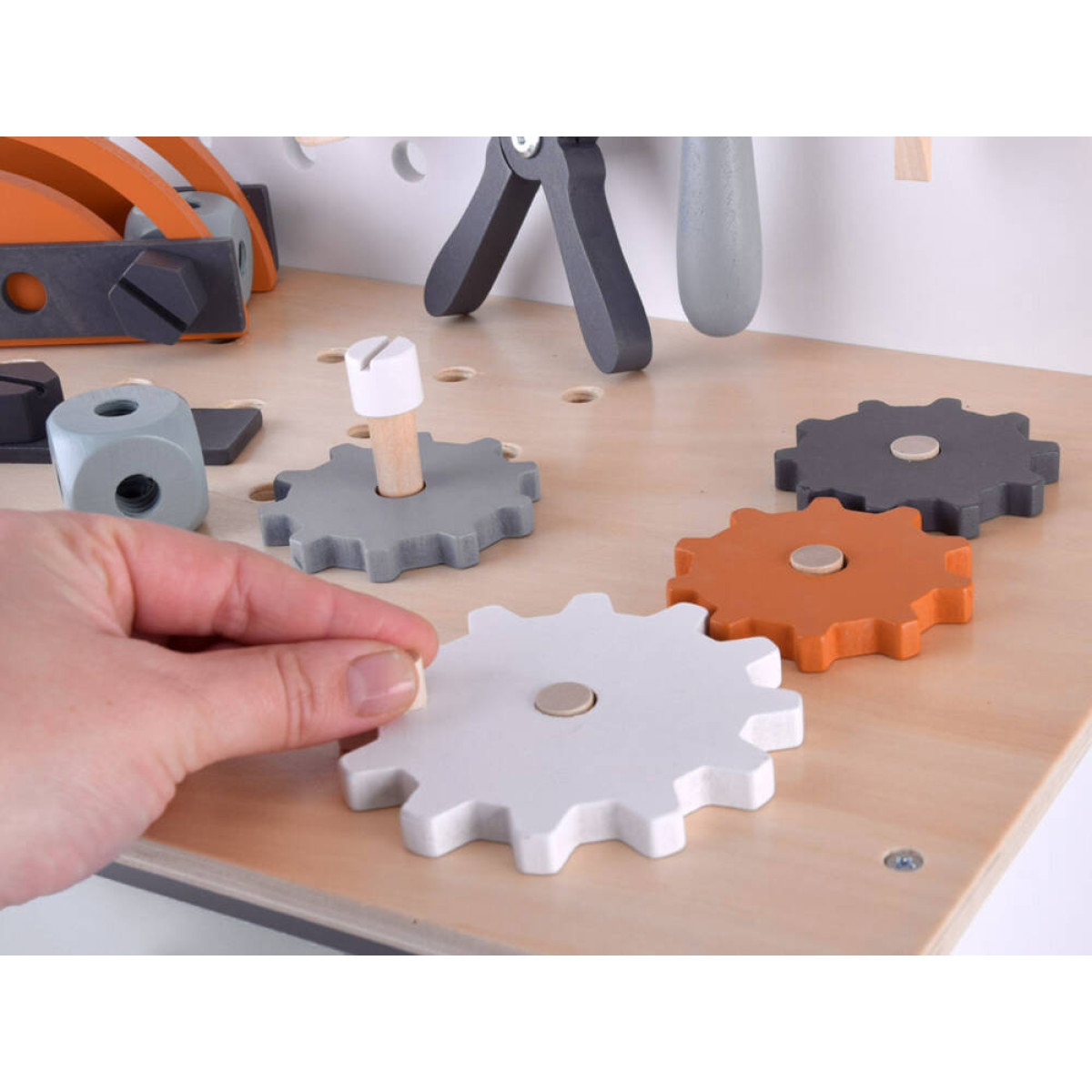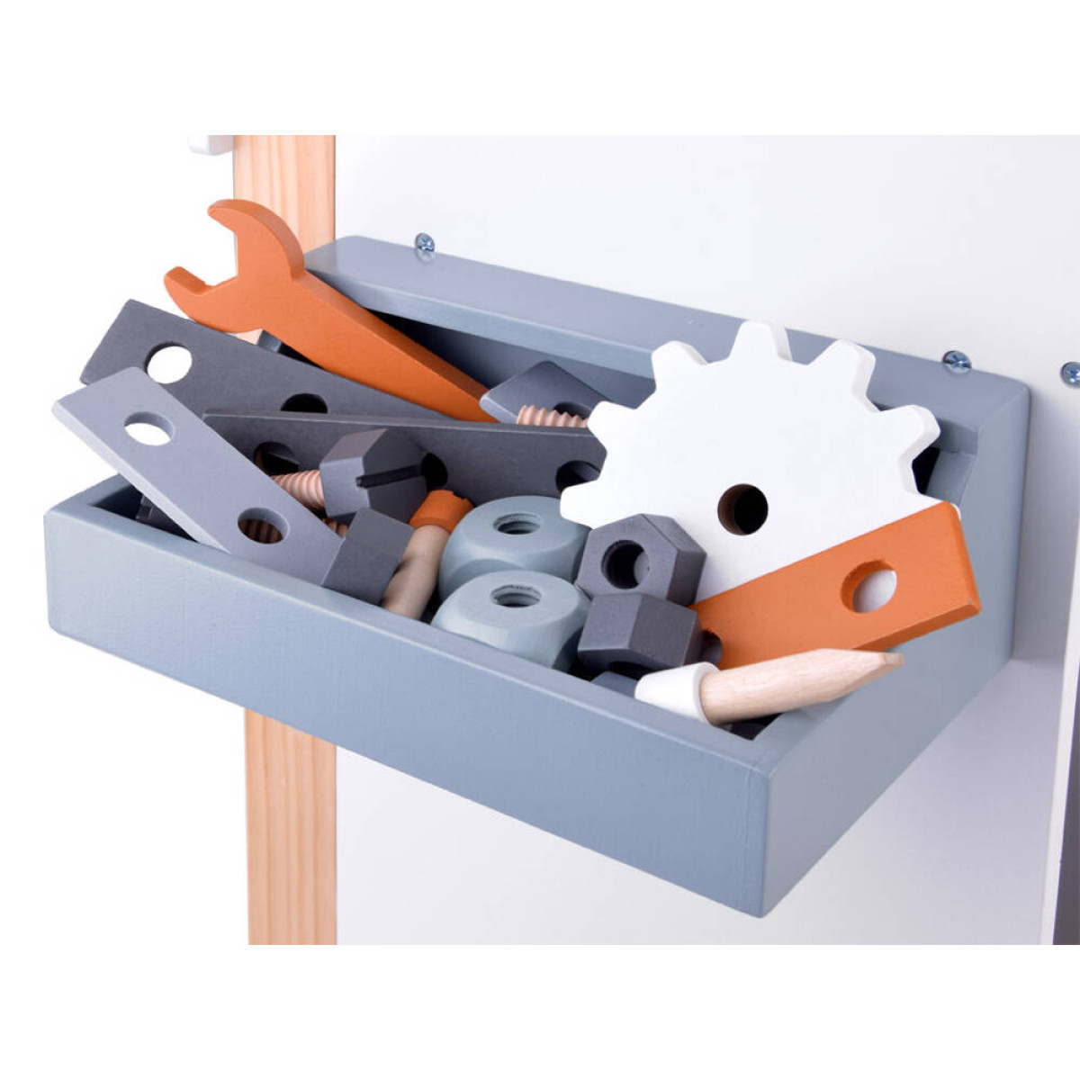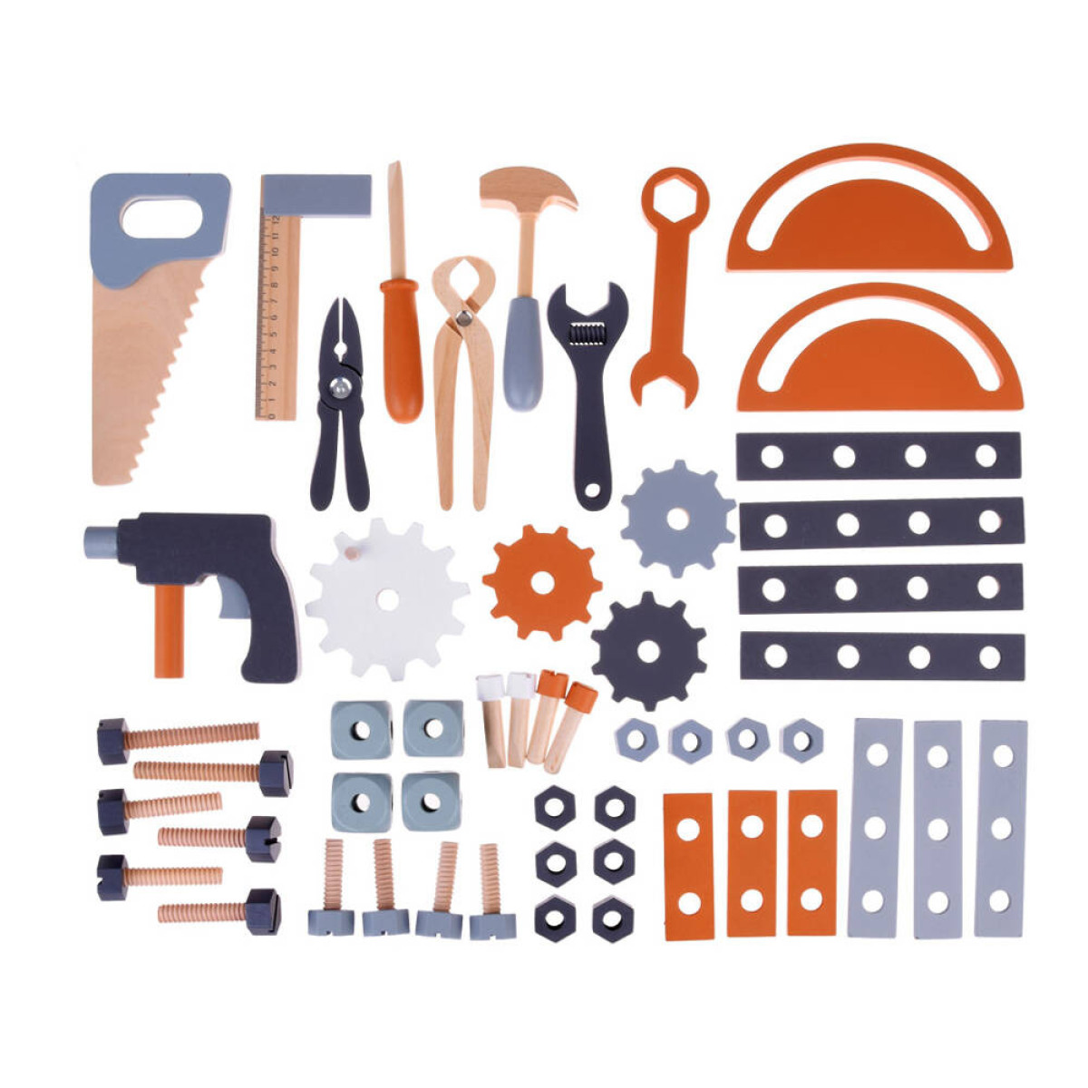 Šis didelis medinis dirbtuvių rinkinys yra puiki žaislų kolekcija, kuri tikrai nudžiugins kiekvieną vaiką. Rinkinį sudaro daugybė medinių dalių ir net 55 aksesuarai, kuriuos galima rasti profesionaliame dirbtuvėje. Čia yra visi būtini įrankiai, tokie kaip atsuktuvas, plaktukas, varžtai, pavaros, veržlės, matavimo juostos, replės, pjūklas, raktai ir kt., taip pat talpi įrankių dėžė, juoda lenta rašymui su kreida bei laikrodis su judančiomis rodyklėmis.