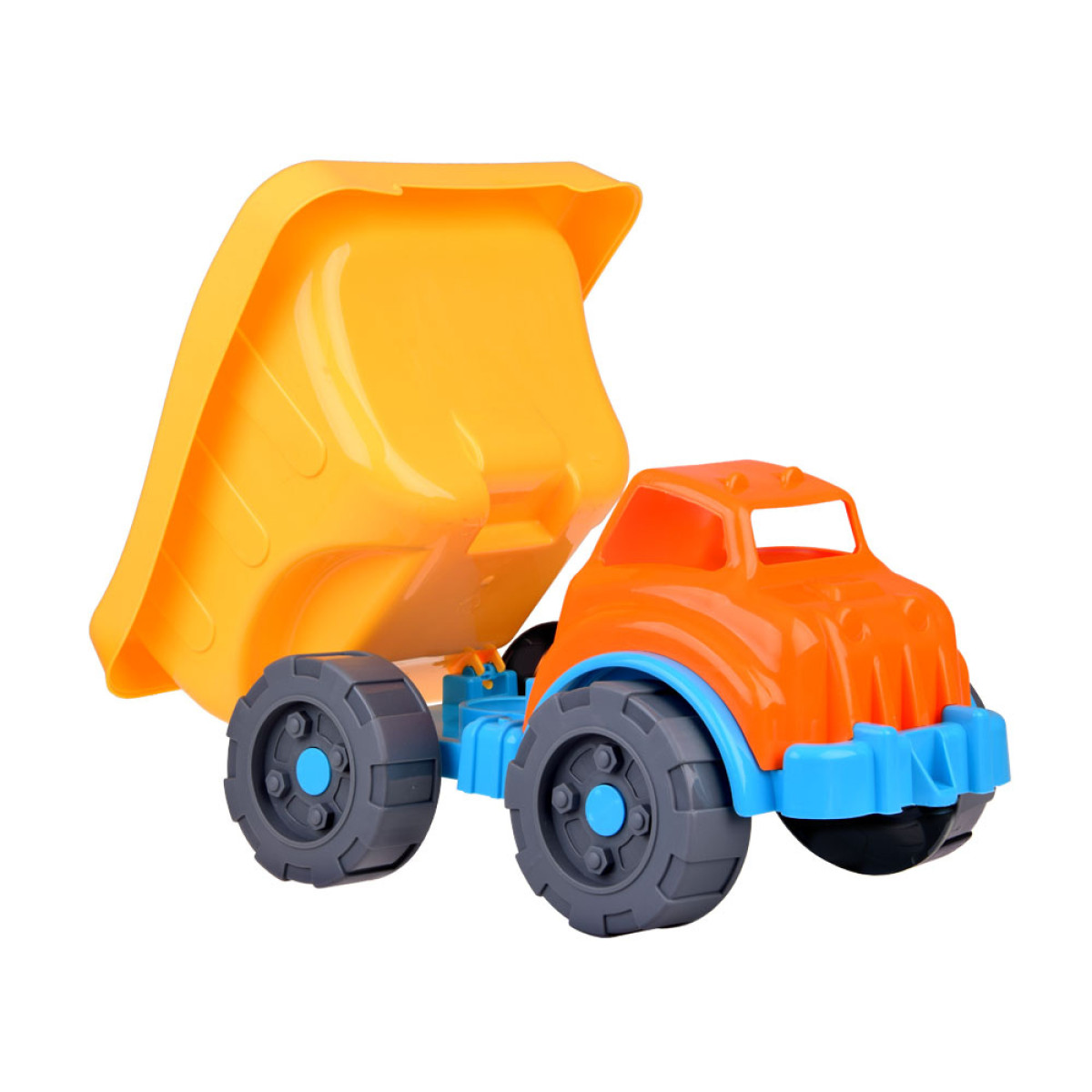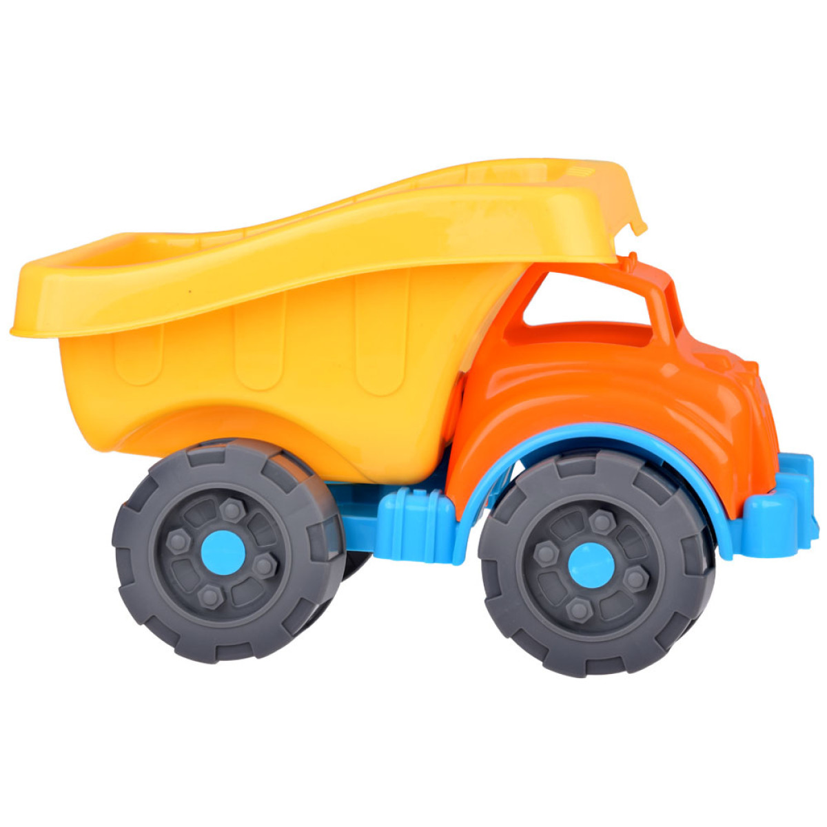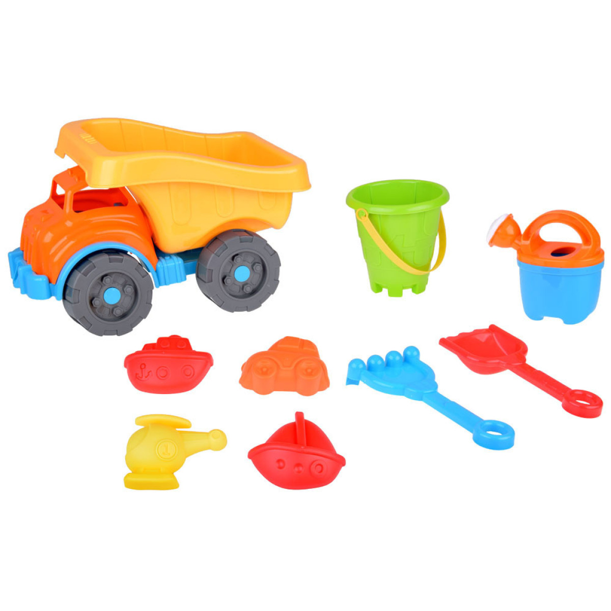 Didelis smėlio dėžės rinkinys su sunkvežimiu savivarčiu, formelėmis, kastuvėliu ir grėbliuku