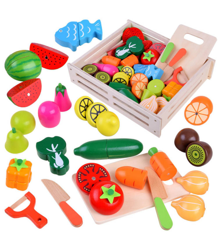 Kiekvienas rinkinio elementas yra kruopščiai pagamintas iš medžio ir padengtas saugiomis, netoksiškomis dažais. Daržovės, vaisiai ir žuvis turi magnetus, todėl juos lengva padalinti į puseles, o arbūzą net į ketvirčius. Vaikas gali "pjaustyti" produktus, naudodamas medinius peilius ir pjaustymo lentą, kas suteikia itin realistišką ir įtraukiančią patirtį.