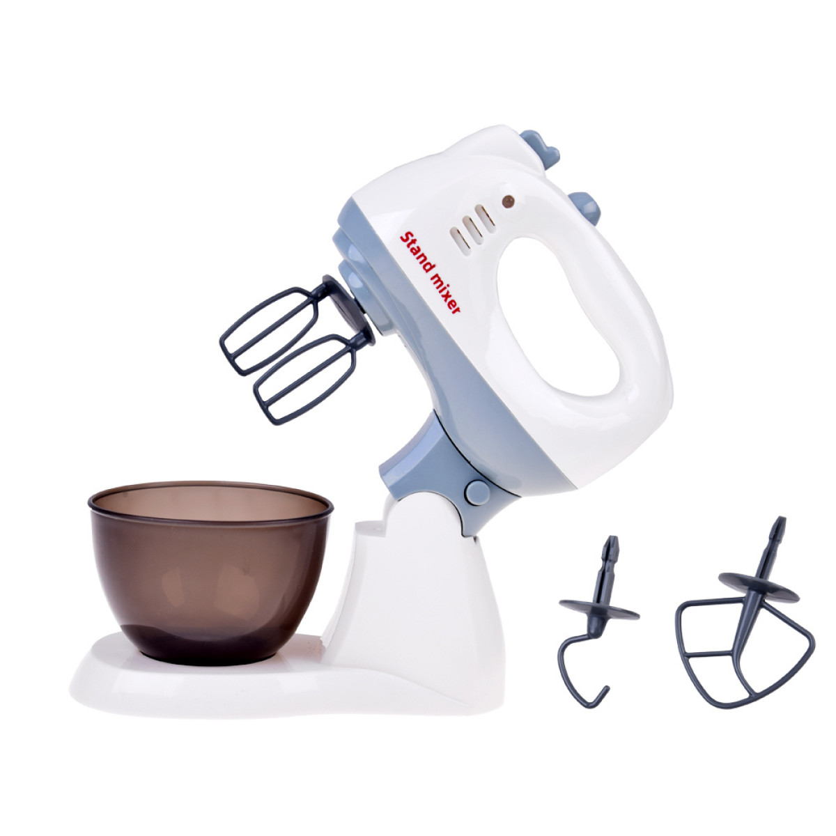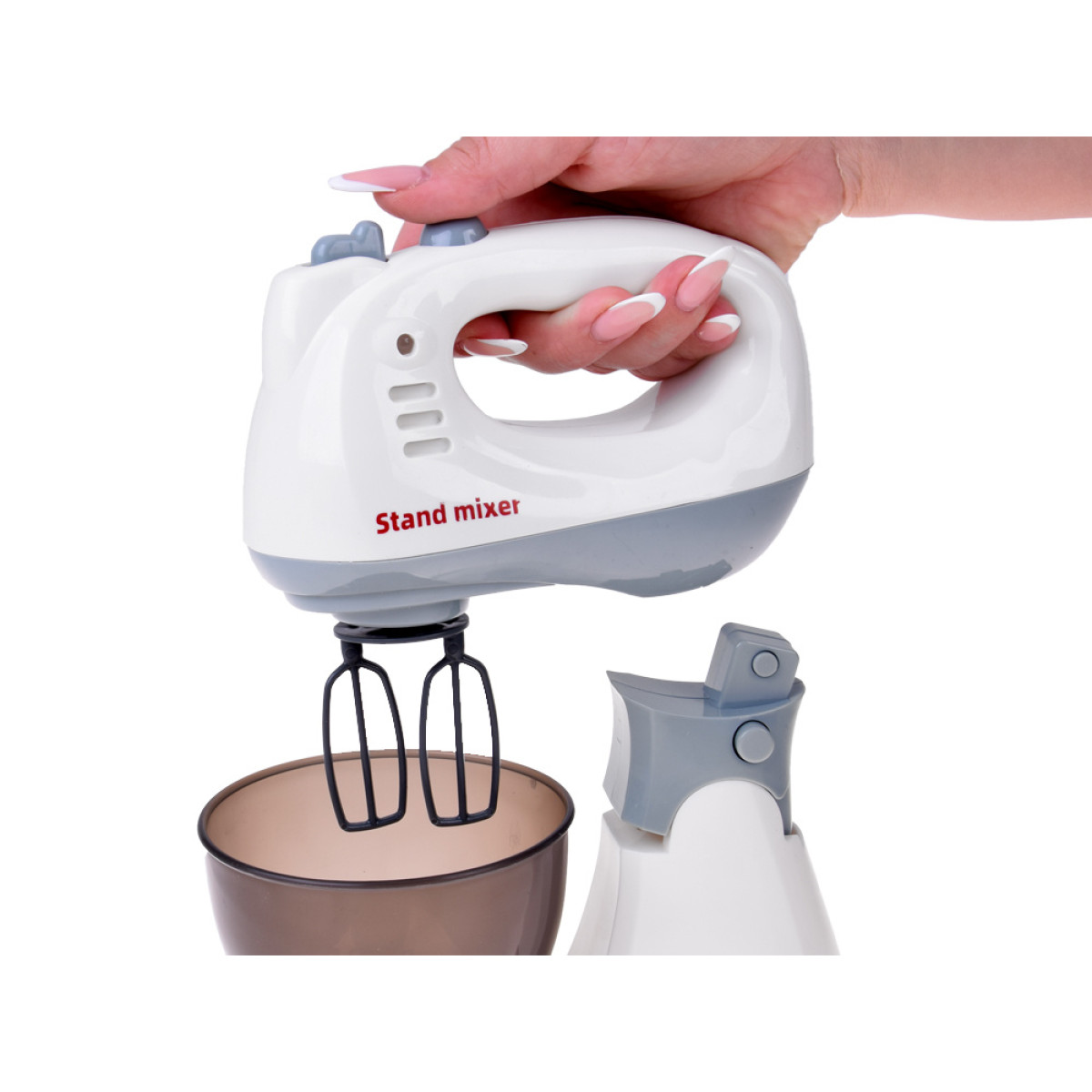 mikseris puikiai atkartoja tikrą virtuvės prietaisą. jį galima naudoti kaip planetarinį kombainą, o vienu judesiu atskyrus nuo pagrindo – kaip rankinį mikserį. pakeliamas korpusas leidžia patogiai išimti dubenį. rinkinyje yra net 3 skirtingi antgaliai.