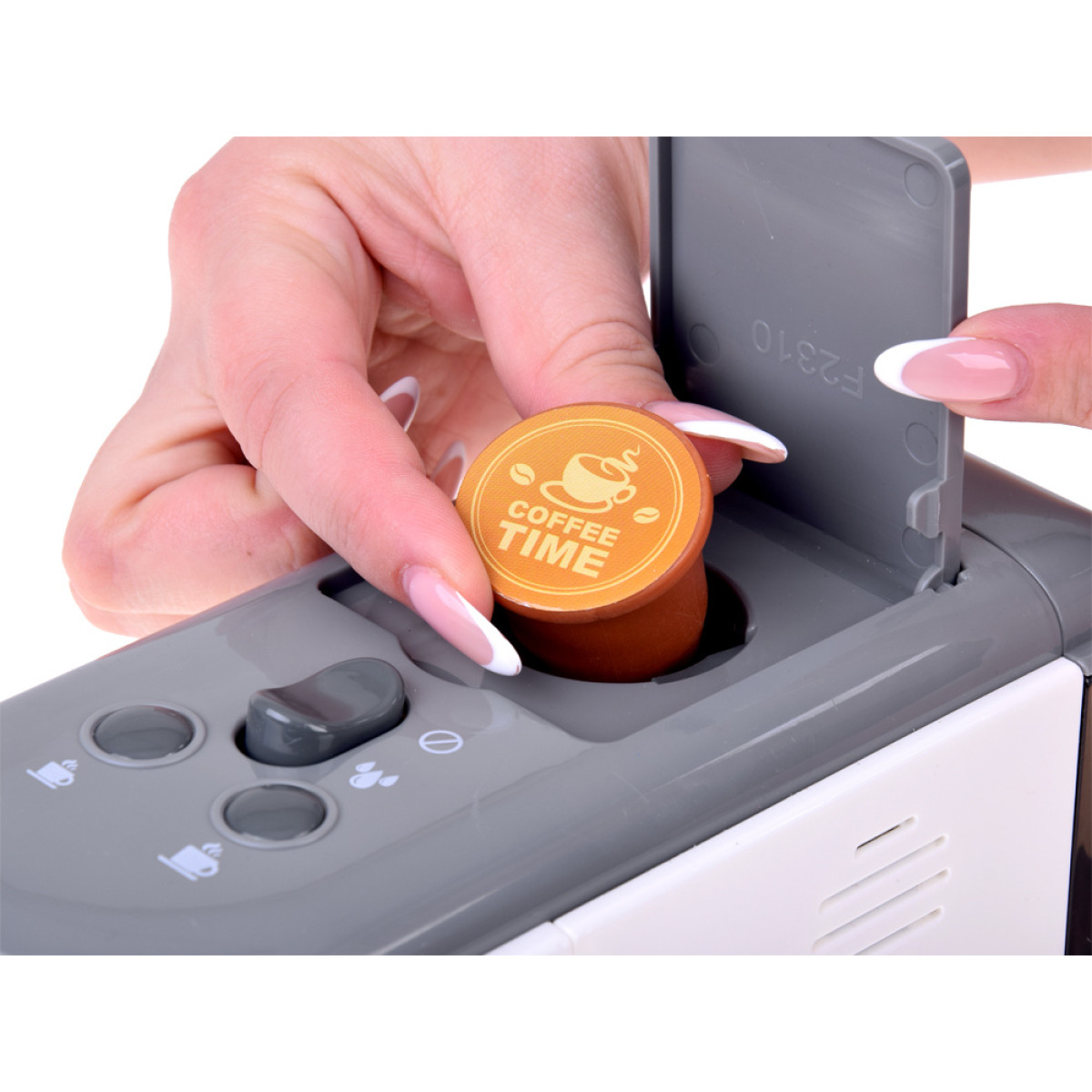 elegantiškas kapsulinis kavos aparatas su vandens pylimo funkcija suteikia dar daugiau džiaugsmo žaidžiant. galinėje dalyje yra mažas skaidrus vandens rezervuaras. pakėlus dangtelį galima įpilti vandens ir vėl uždaryti. tada atidaromas viršutinis dangtelis, įdedama kapsulė ir pasirenkamas veikimo režimas bei gėrimo dydis.