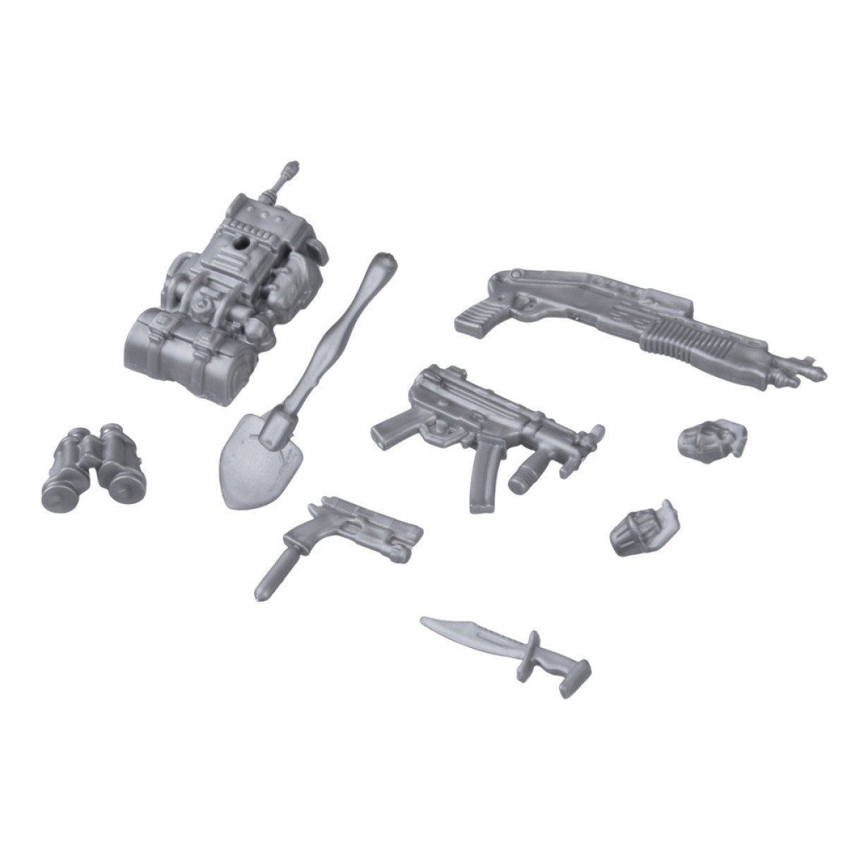 - Aksesuarai: taktinė kuprinė su radijo stotele, šautuvai, pistoletas, granatos, peilis, kastuvas – papildomos dalys žaidimo įvairovei.