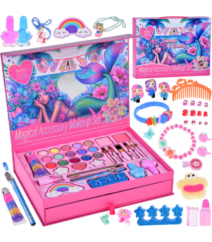 didelis grožio rinkinys undinėlė – tai spalvingas ir pilnas grožio lagaminėlis, kuriame kiekviena mergaitė ras daug makiažo priemonių, plaukų aksesuarų ir papuošalų. Su šiuo rinkiniu lengva kurti mielas šukuosenas, žaismingą makiažą ir smagiai leisti laiką kuriant savo stilių.
