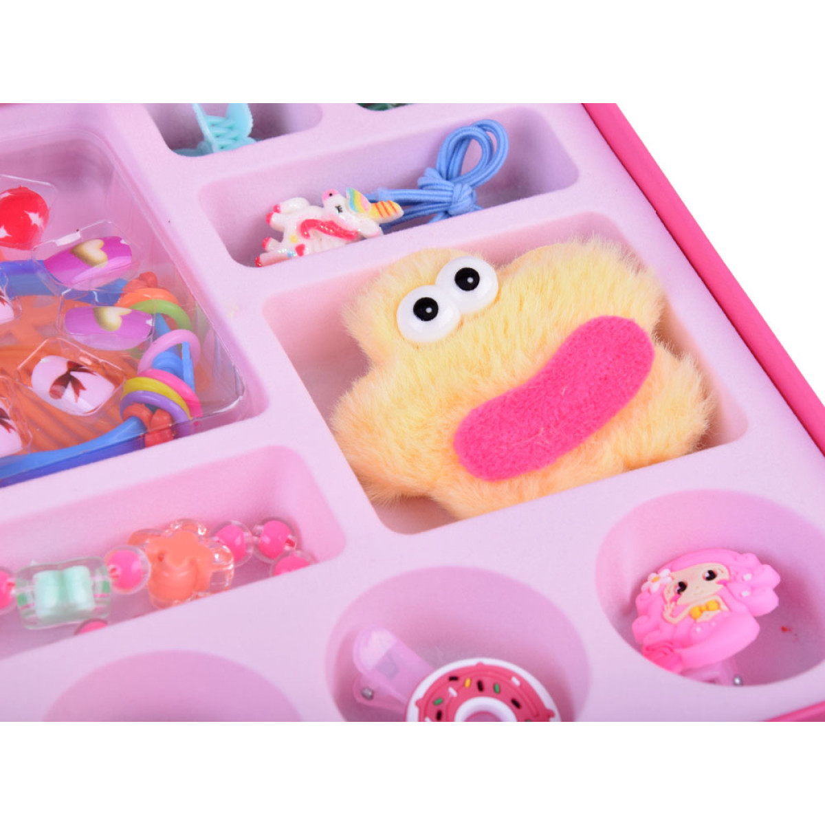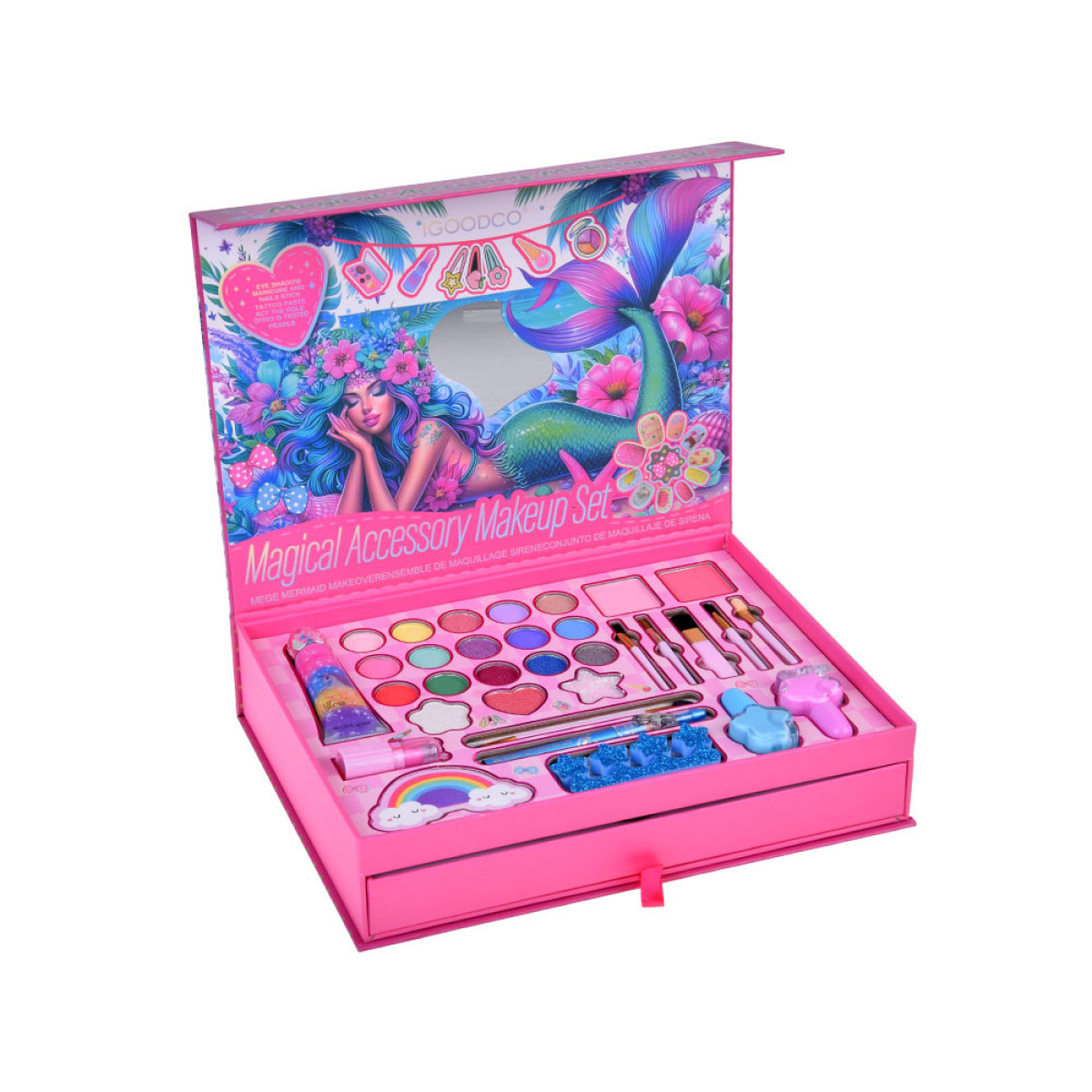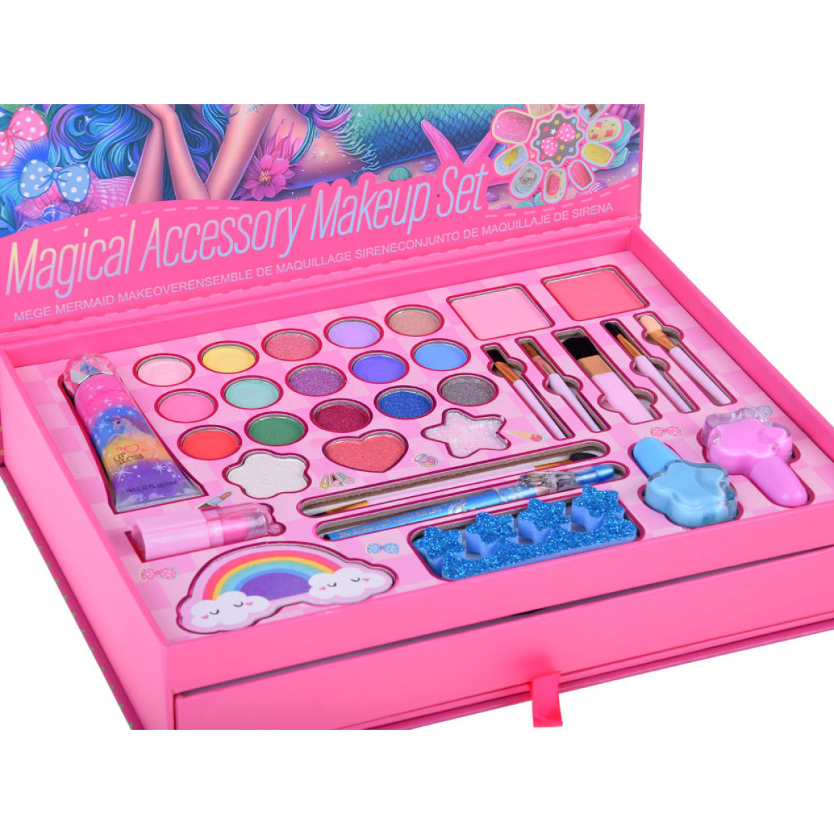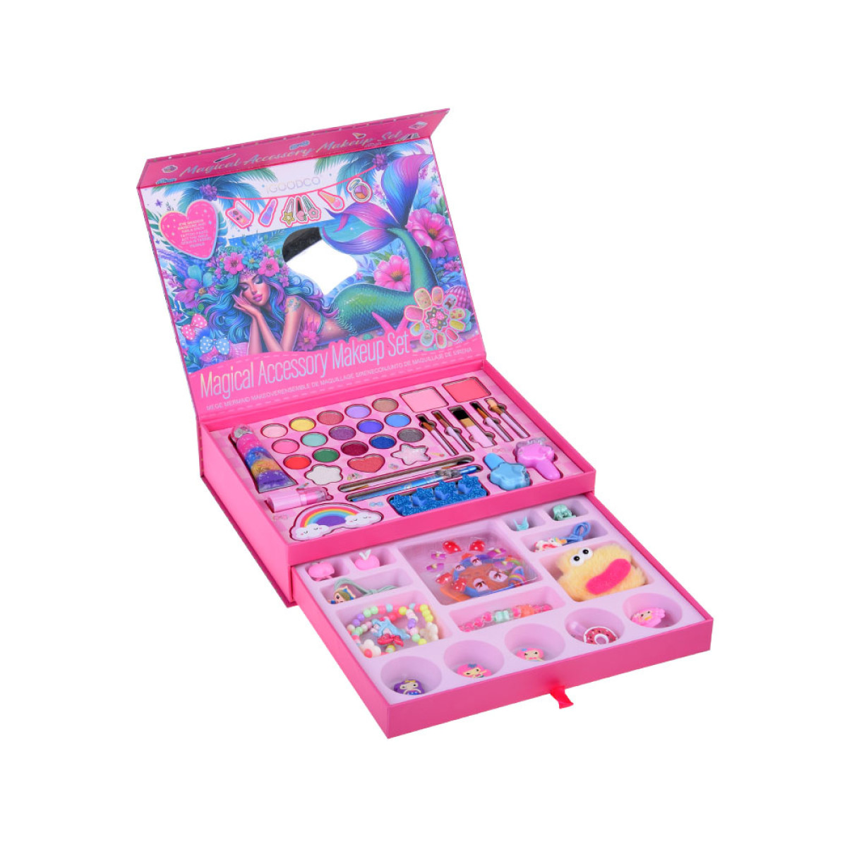 atidarius lagaminėlį viduje laukia dar daugiau staigmenų. Čia rasite ne tik makiažo priemones, bet ir ištraukiamą stalčiuką su plaukų aksesuarais bei papuošalais. Daugelis detalių papuoštos undinėlės motyvais arba elementais, susijusiais su žaismingu mergaitišku pasauliu.