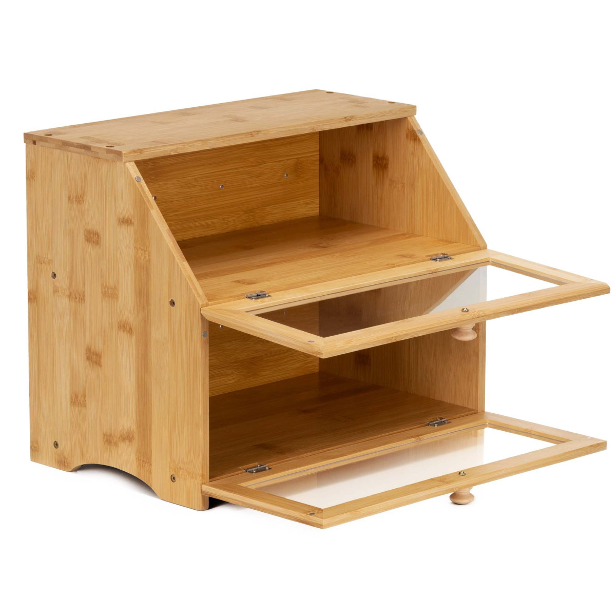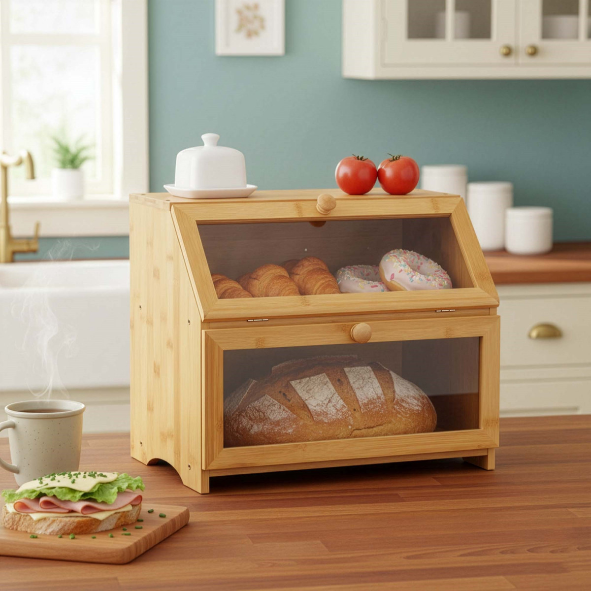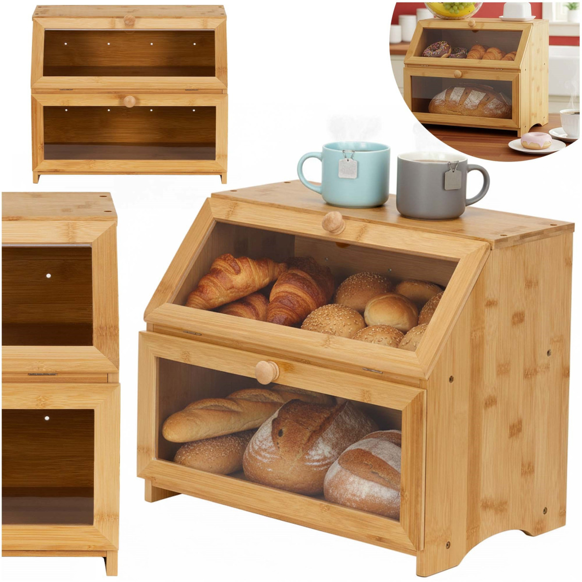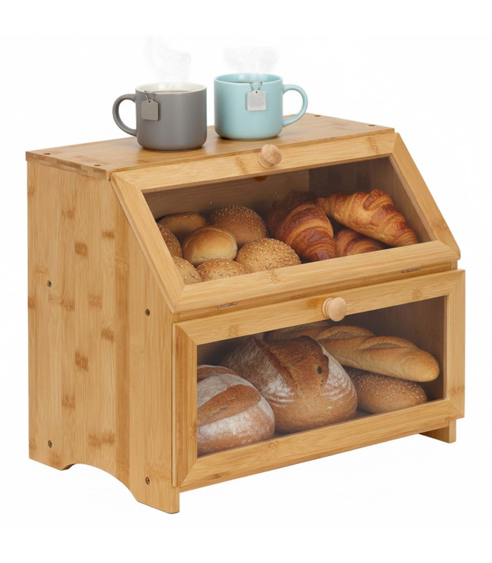 Ši dviaukštė bambukinė duonos dėžė sujungia natūralaus medžio estetiką ir patogų duonos laikymą dviejuose lygiuose. Dėžės dizainas leidžia atskirai laikyti skirtingus kepinius, palengvinant tvarkos palaikymą ir greitą reikiamo produkto suradimą. Bambuko medžiaga suteikia dėžei vizualinį lengvumą ir harmoningą charakterį, kuris puikiai dera tiek su moderniu, tiek su klasikiniu virtuvės dizainu. Uždara priekinė dalis apsaugo duoną nuo šviežumo praradimo ir sumažina oro patekimą, užtikrinant ilgalaikį saugojimo laiką.