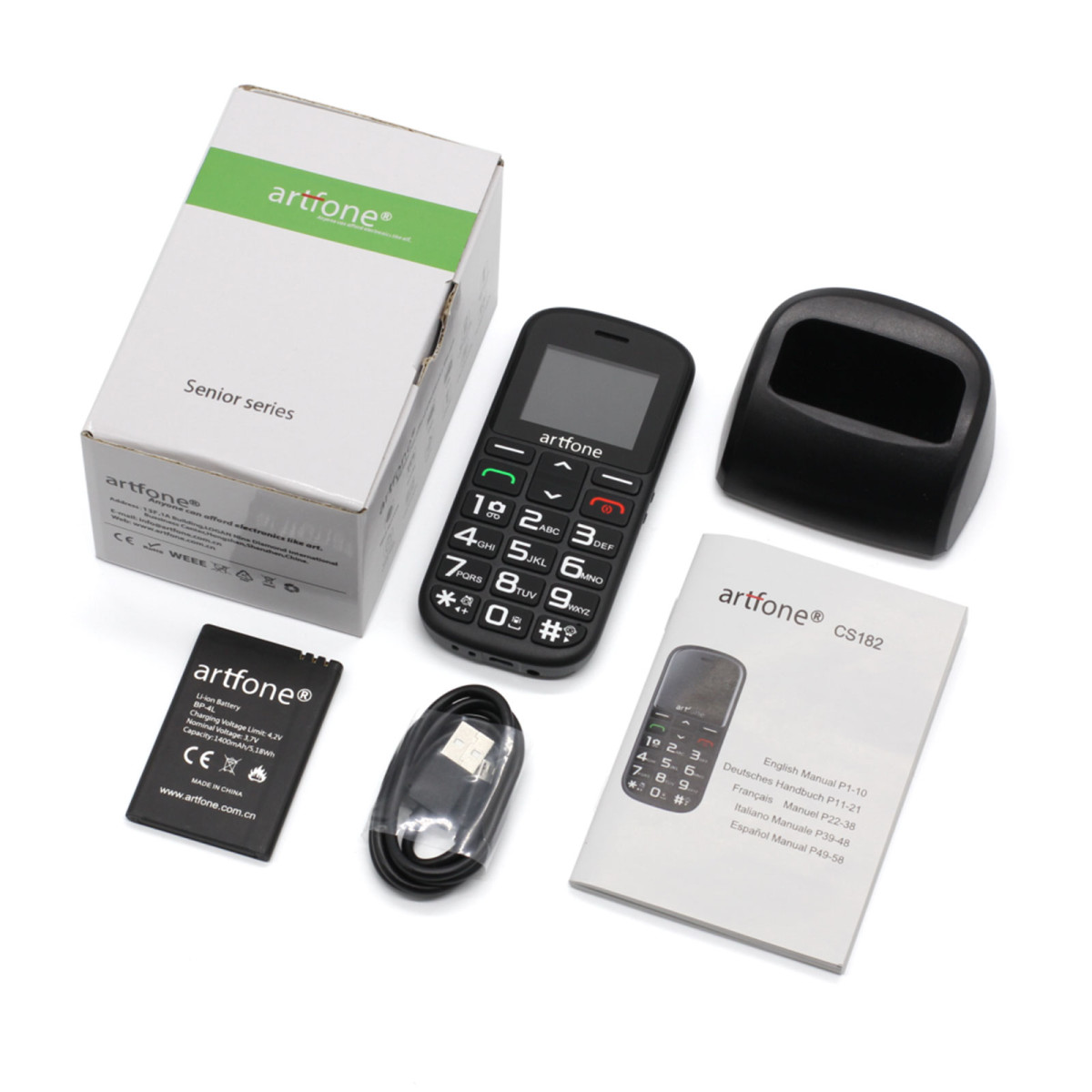 Mygtukinis mobilusis telefonas Arftone CS-182 – išmaniai paprastas ir saugus pasirinkimas vyresnio amžiaus žmonėms.