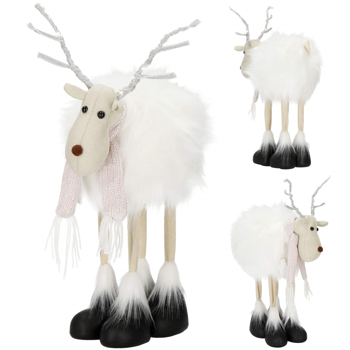 Šis elegantiškas dekoratyvinis elnias yra puikus akcentas jūsų namų interjere. Jo aukštis su ištiestais ragais siekia 48 cm, plotis - 15 cm, o ilgis - 24 cm. Unikalūs bruožai apima veidą su akimis, ausimis ir nosimi, ragus, pūkuotą kūną, siauras kojas, juodus kuplus batus ir rožinį šaliką. Pagamintas iš poliesterio ir plastiko, šis elnias pasižymi kokybe ir patvarumu. Spalvų variacijos apima baltą, smėlio, juodą ir sidabrinę. Papildomas privalumas - aplink ragus apvyniota maža LED lempučių girlianda, suteikianti švelnų apšvietimą.