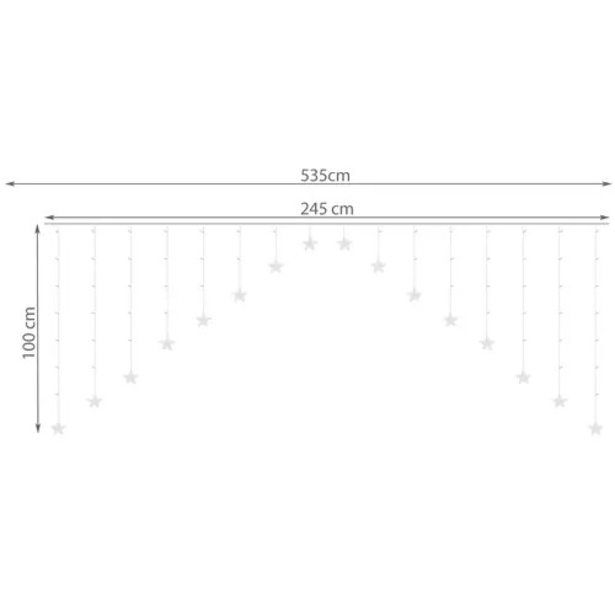 • Techninės specifikacijos: 8 režimai; LED apšvietimas; šviesos spalva: šiltai balta; laidų spalva: skaidri; diodų skaičius: 136; atsparumo vandeniui klasė: IP44; nuotolinio valdymo pultas: taip; maitinimas: elektros tinklas; galia: 1,2 W; vienos žvaigždutės matmenys: 9 cm; bendras ilgis: 535 cm; snaigės ilgis: 100 cm; svoris: 0,388 kg; pakuotės svoris: 0,494 kg.