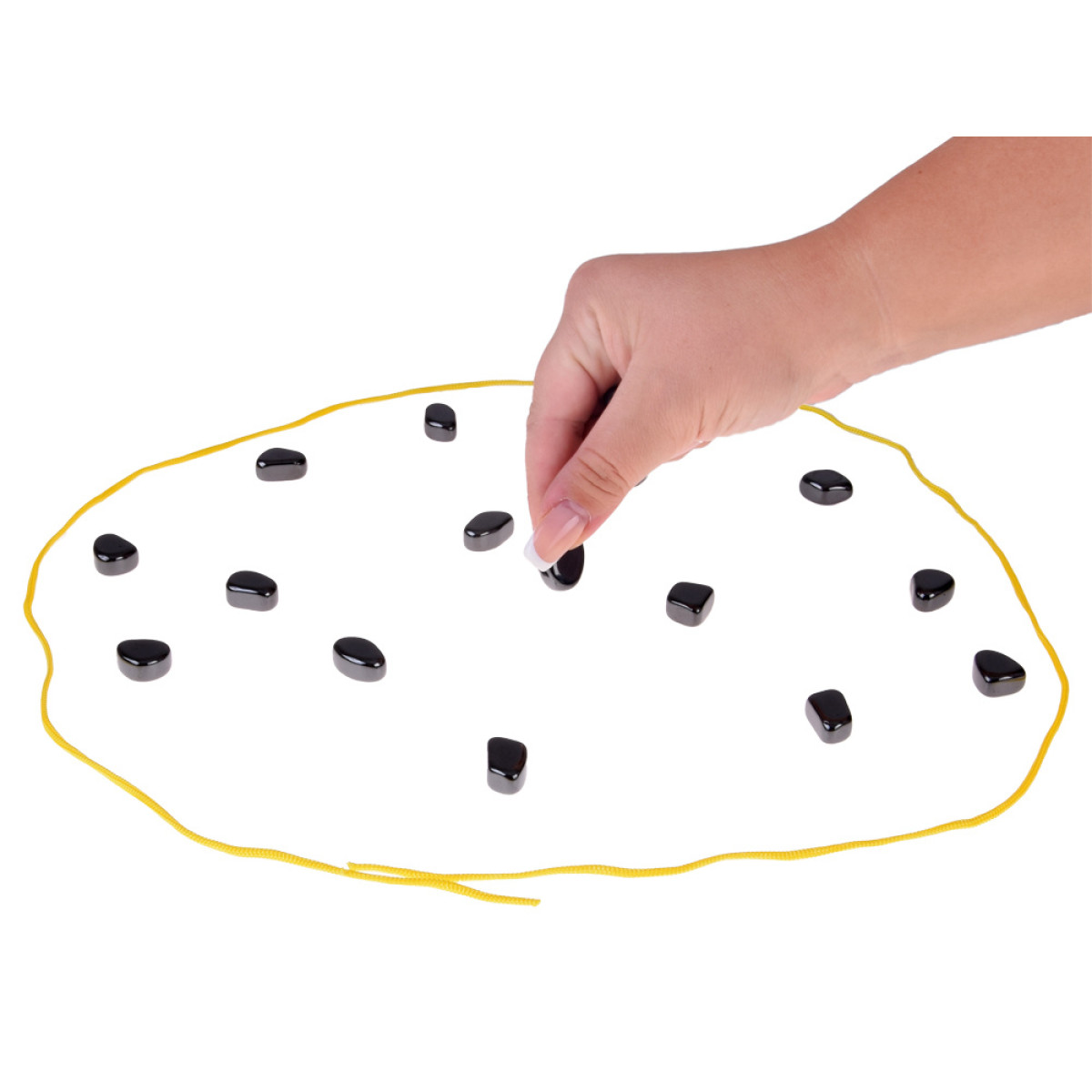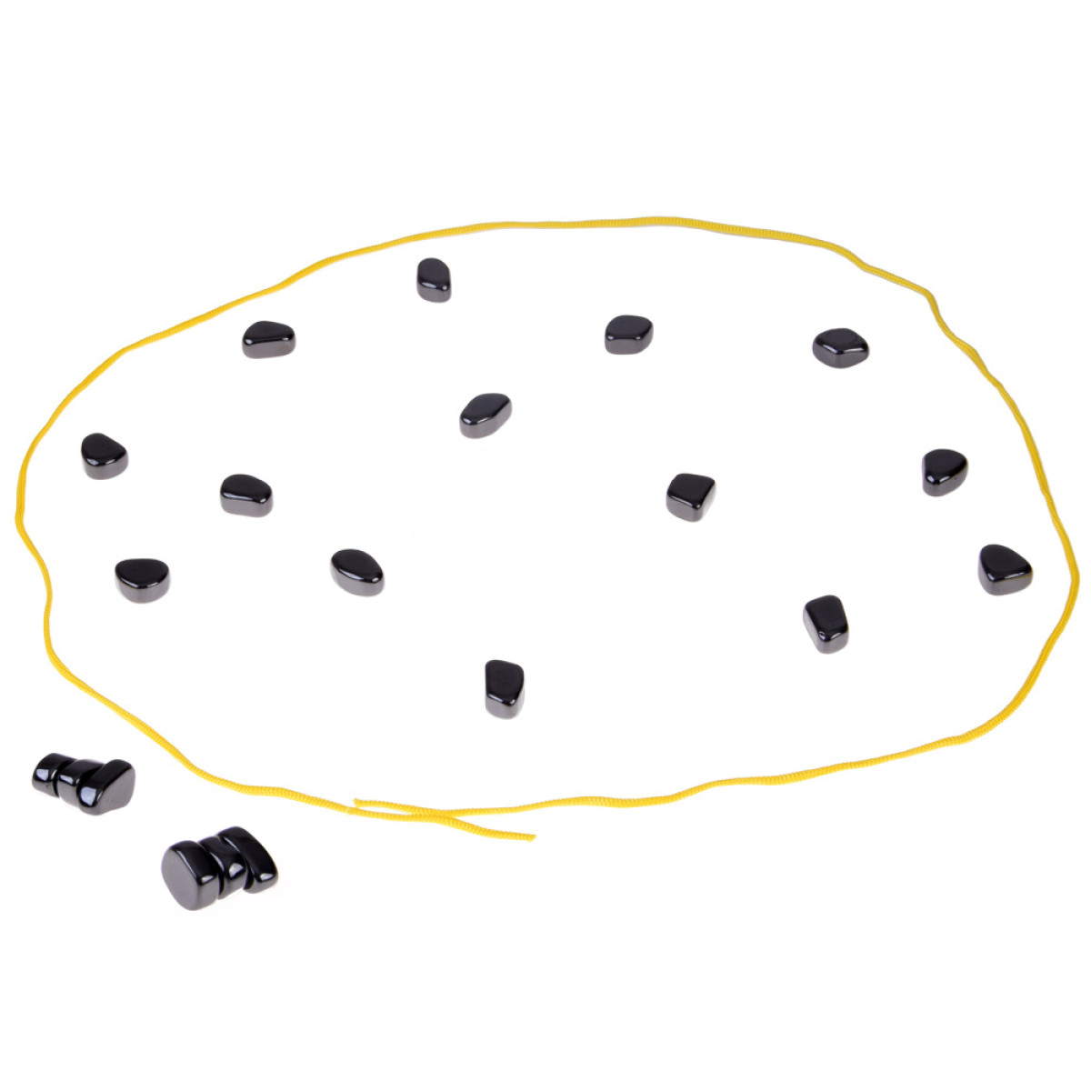 - Žaidėjai paeiliui deda savo magnetinius akmenukus ant pažymėto žaidimo paviršiaus, pavyzdžiui, virvelės ribose arba ant žaidimo linijos.