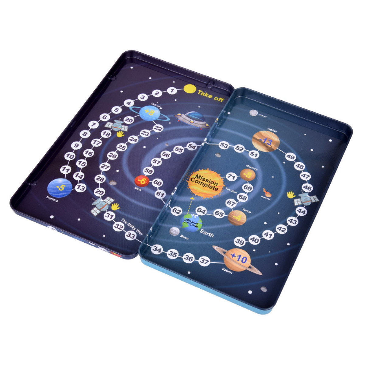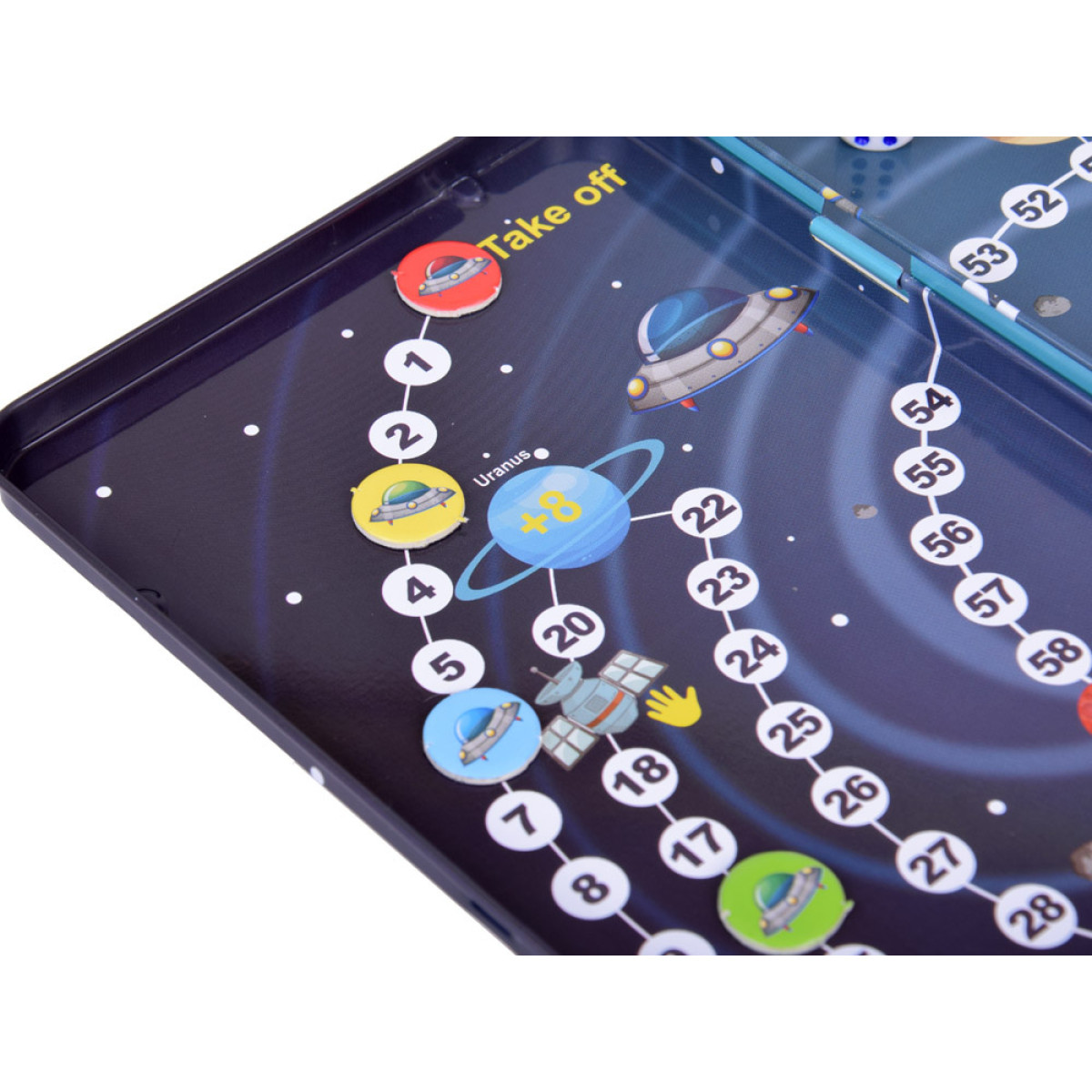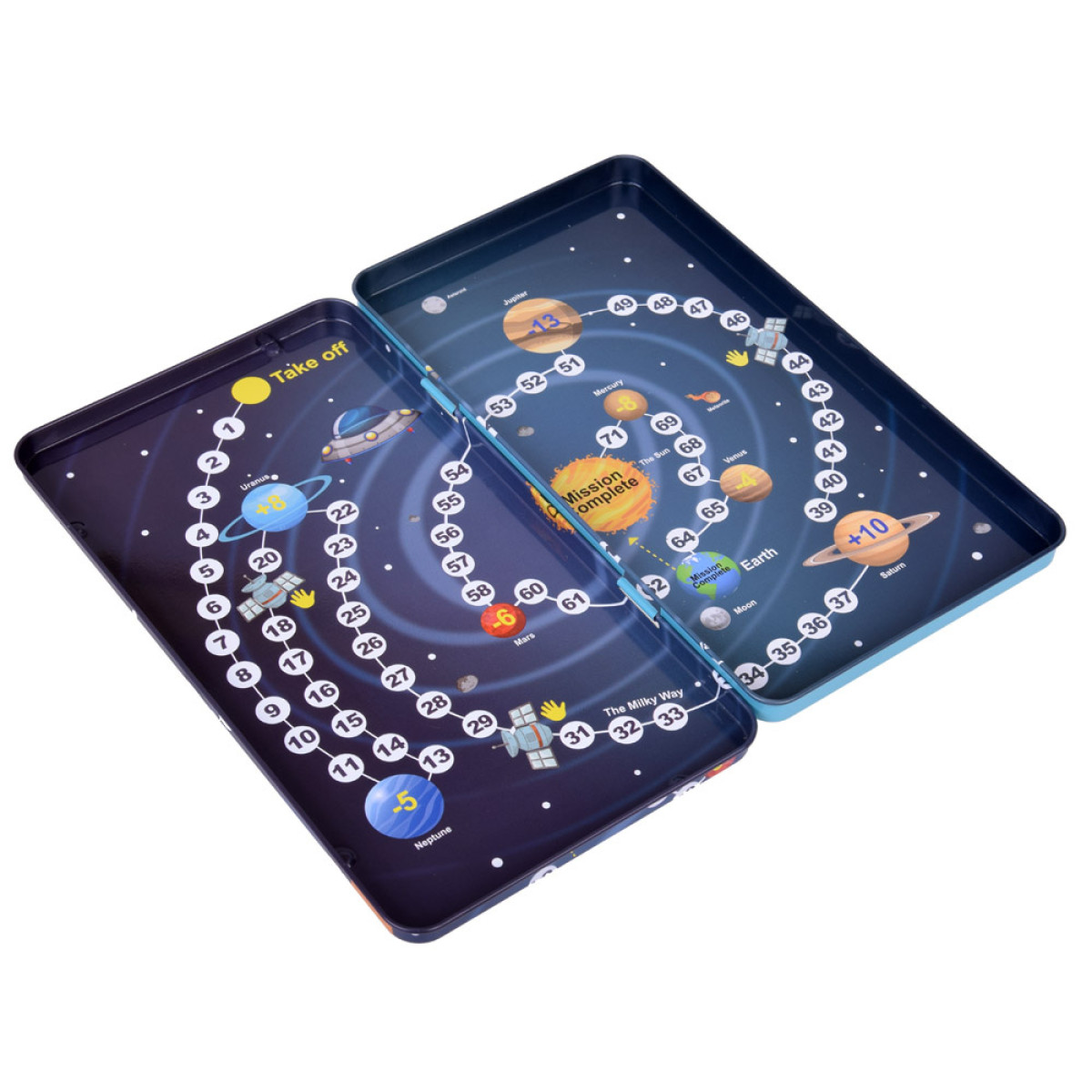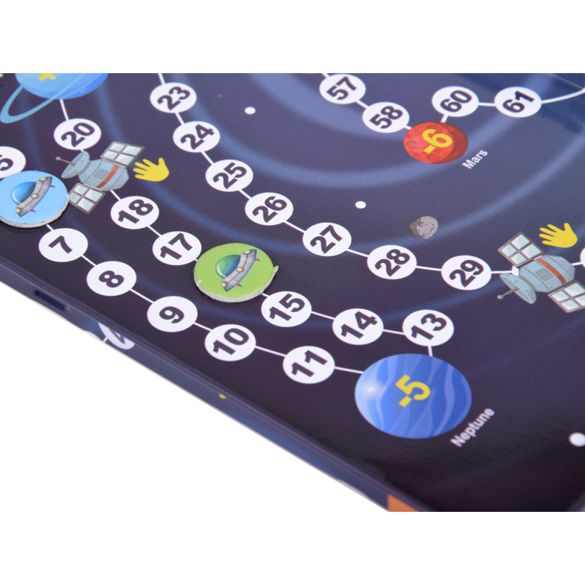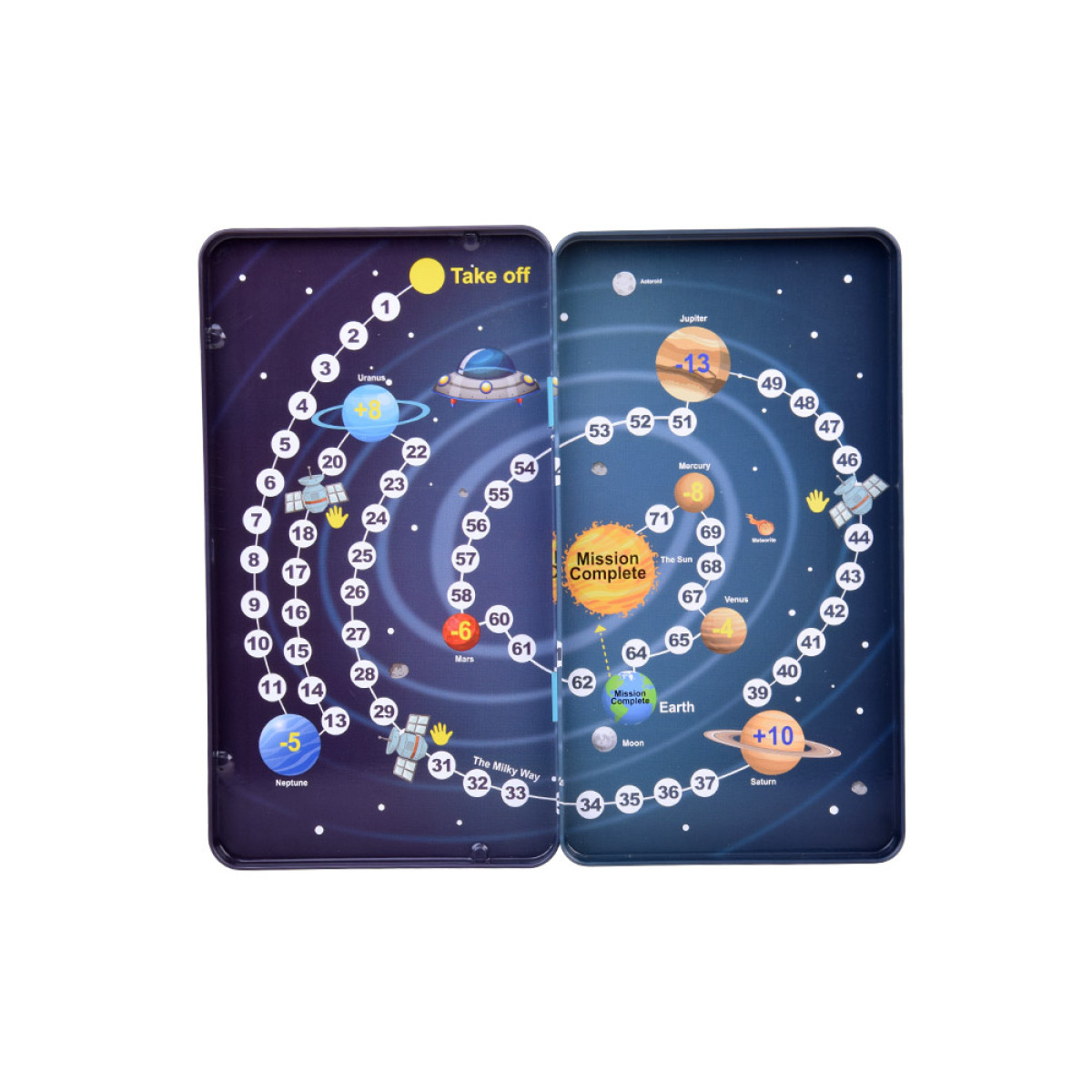 - Magnetinė lenta: 31 x 15 cm dydžio, vaizduojanti kosminę sistemą, planetas ir maršrutus.