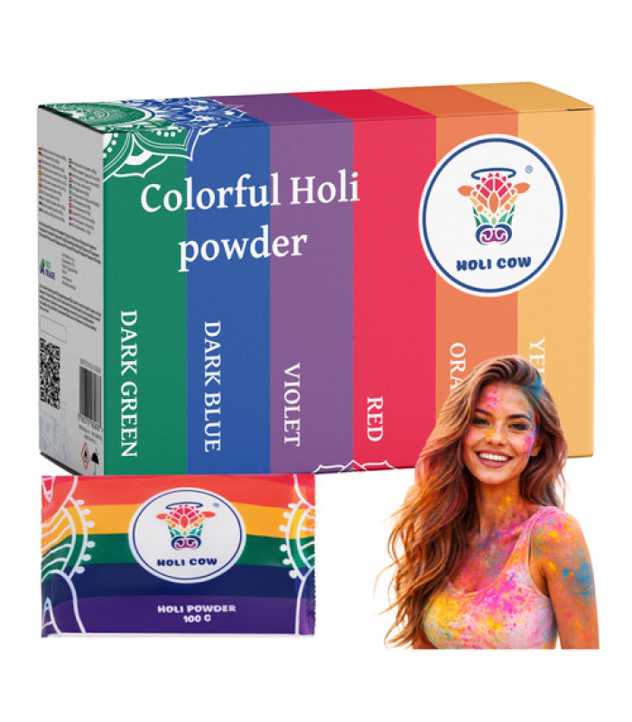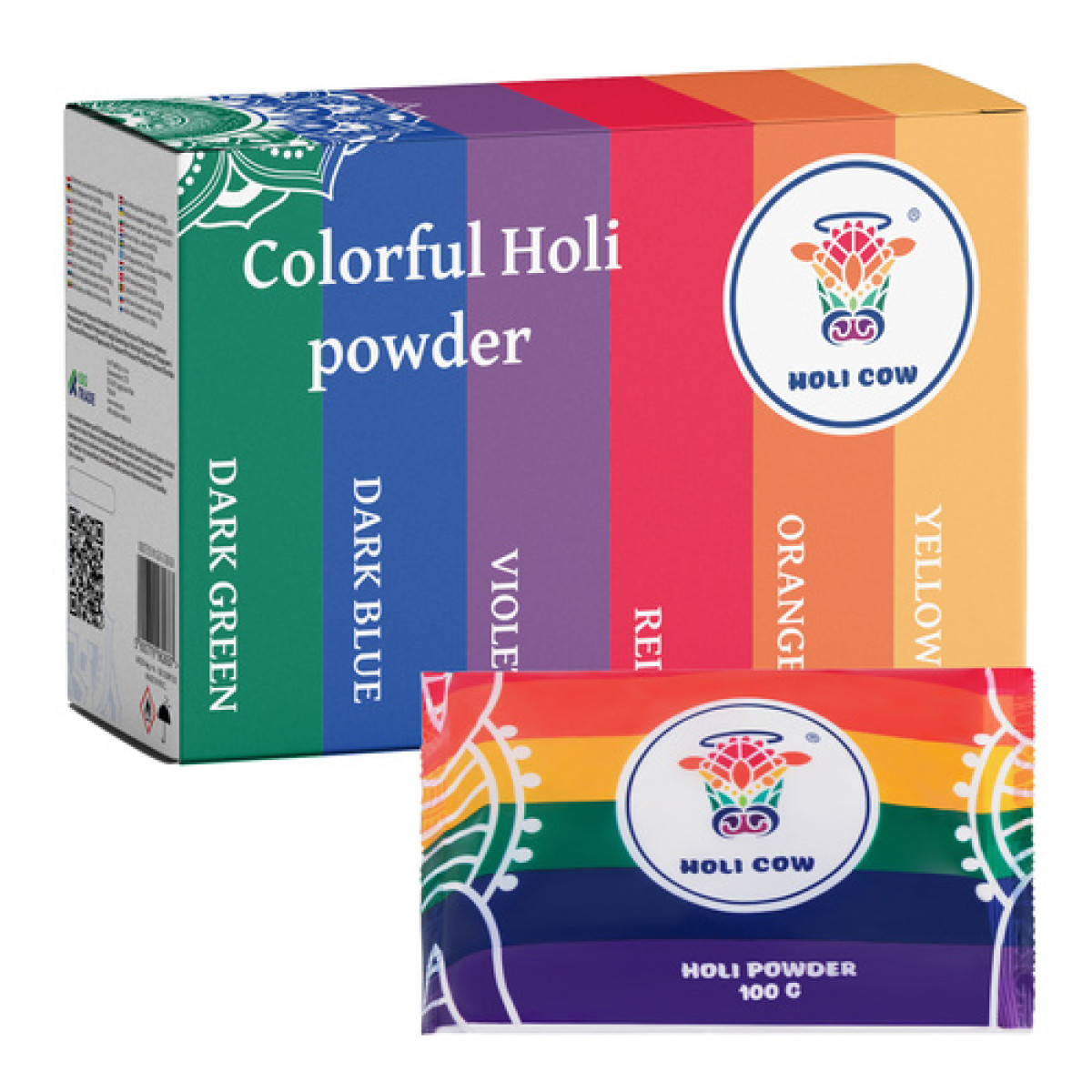 spalvotų holi miltelių rinkinys 6 x 100 g holi cow