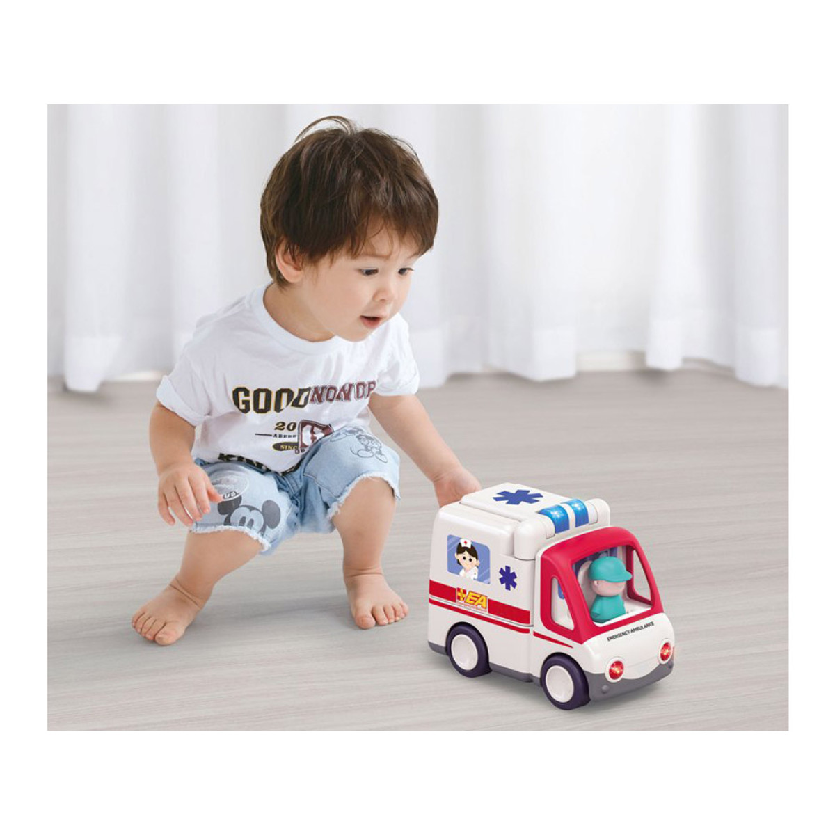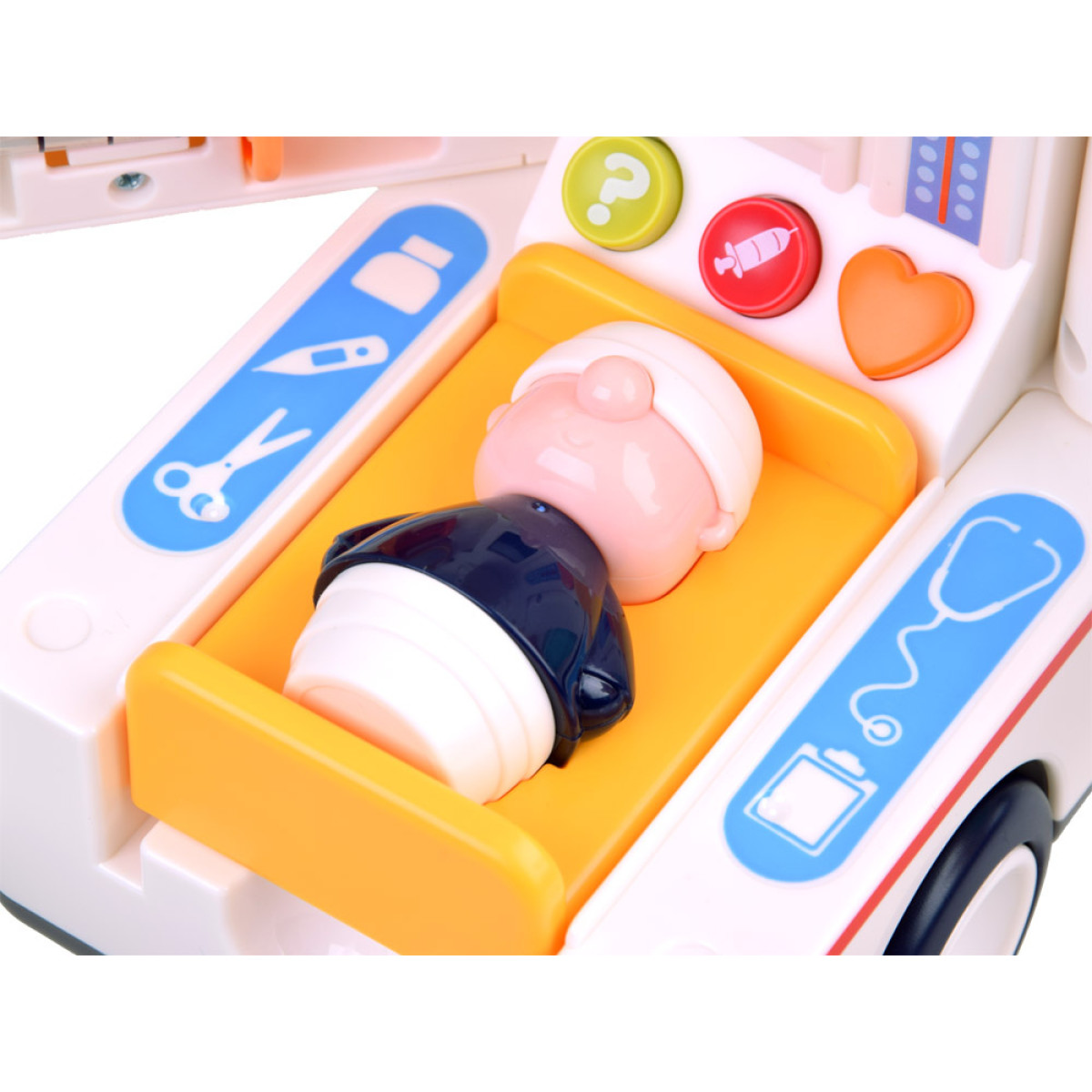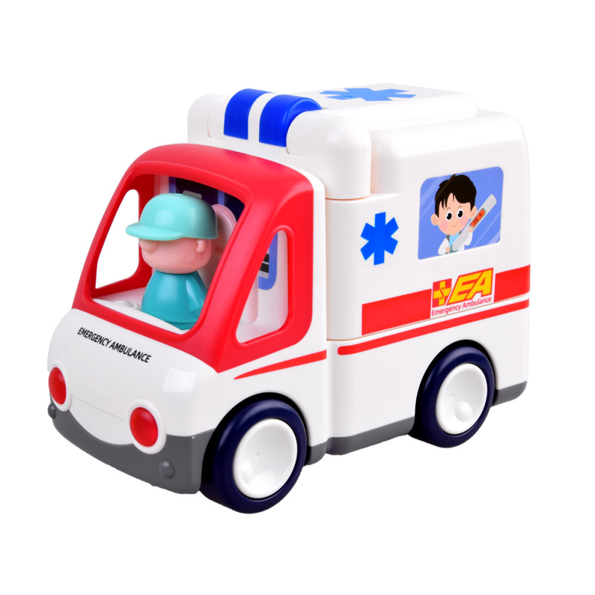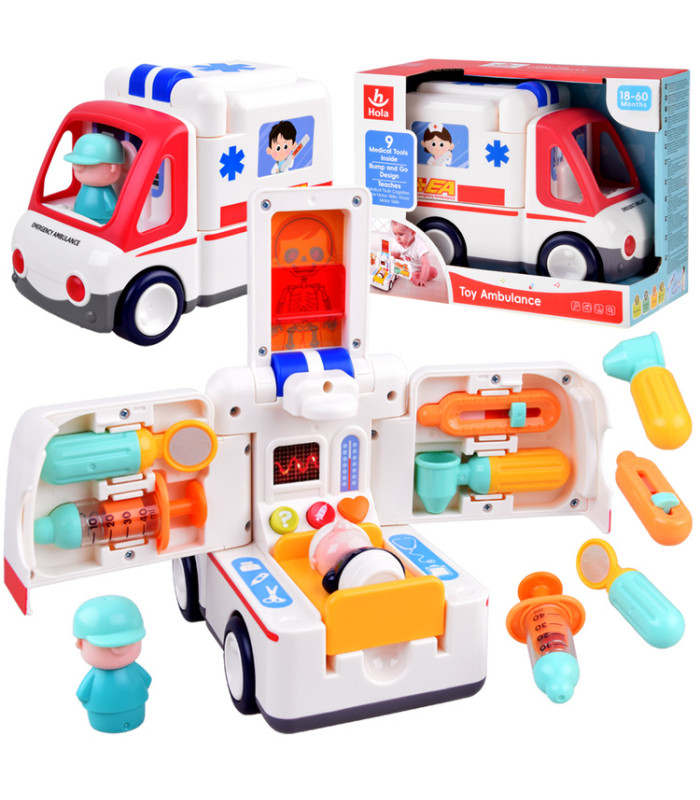 Šis žaislinis greitosios pagalbos automobilis yra puikus pasirinkimas kiekvienam mažajam medikui. Automobilis yra profesionaliai aprūpintas gelbėjimo įranga ir visada pasiruošęs padėti ten, kur reikia. Žaislas savarankiškai važiuoja, keisdamas kryptį sutikęs kliūtį. Važiuojant automobilis skleidžia garsus: variklio užvedimas, greitosios pagalbos sirena, garsinis signalas, groja linksma muzika ir net stabdymo garsas. Taip pat šviečia žibintai.