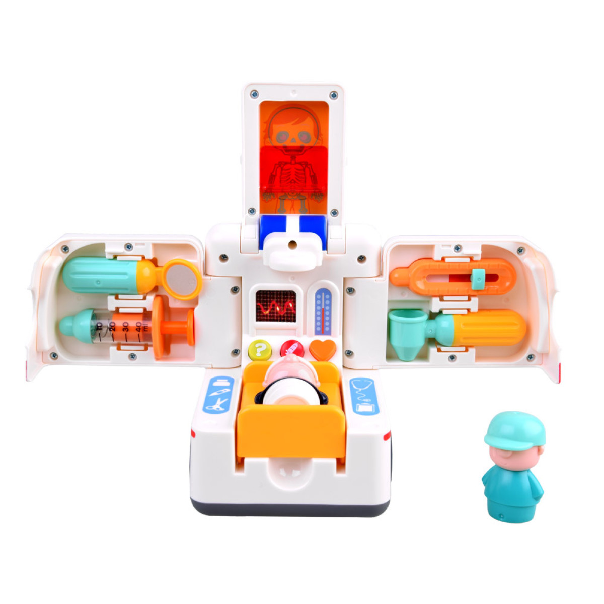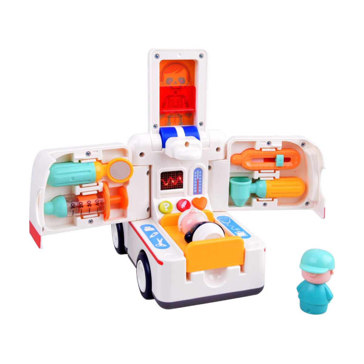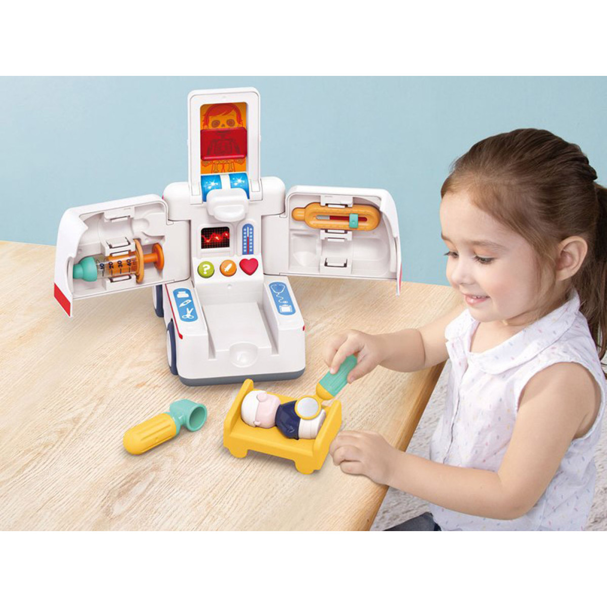 Šis žaislinis greitosios pagalbos automobilis yra puikus pasirinkimas kiekvienam mažajam medikui. Automobilis yra profesionaliai aprūpintas gelbėjimo įranga ir visada pasiruošęs padėti ten, kur reikia. Žaislas savarankiškai važiuoja, keisdamas kryptį sutikęs kliūtį. Važiuojant automobilis skleidžia garsus: variklio užvedimas, greitosios pagalbos sirena, garsinis signalas, groja linksma muzika ir net stabdymo garsas. Taip pat šviečia žibintai.