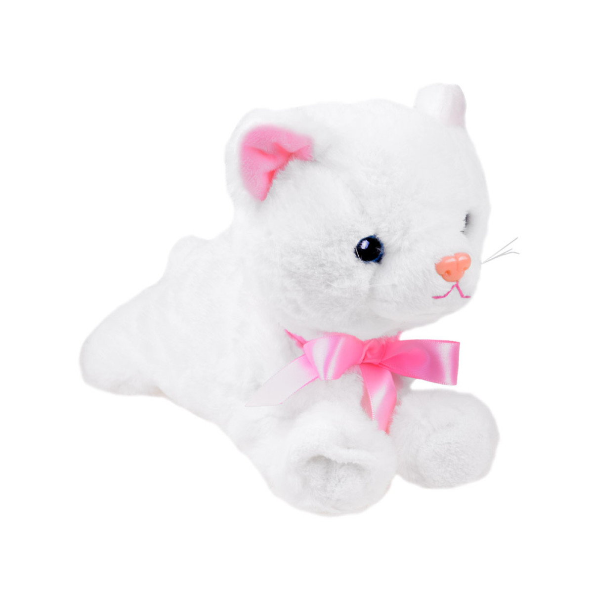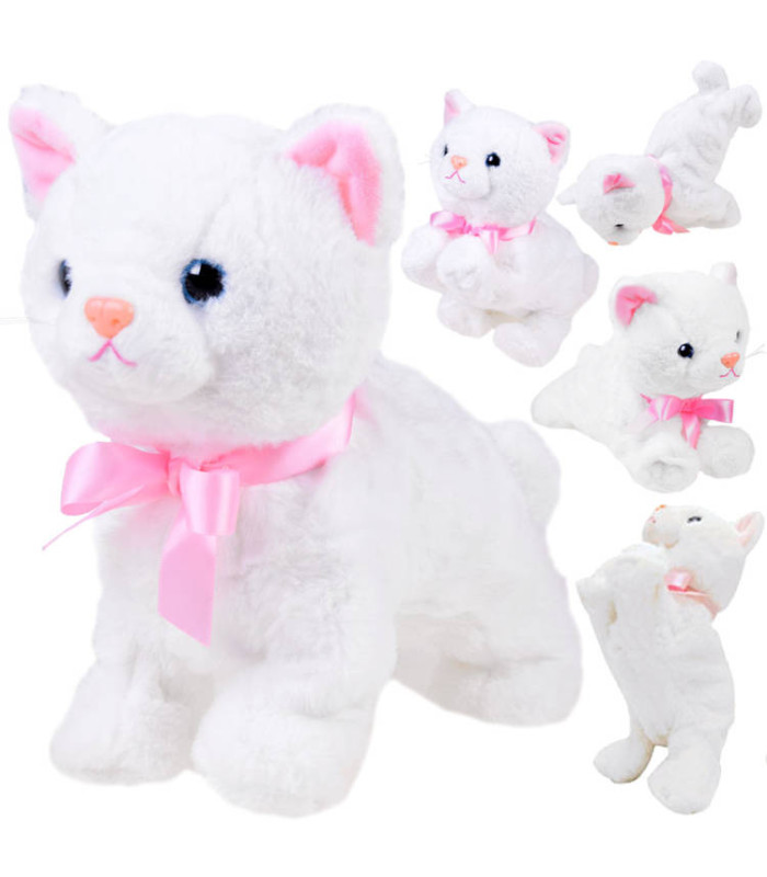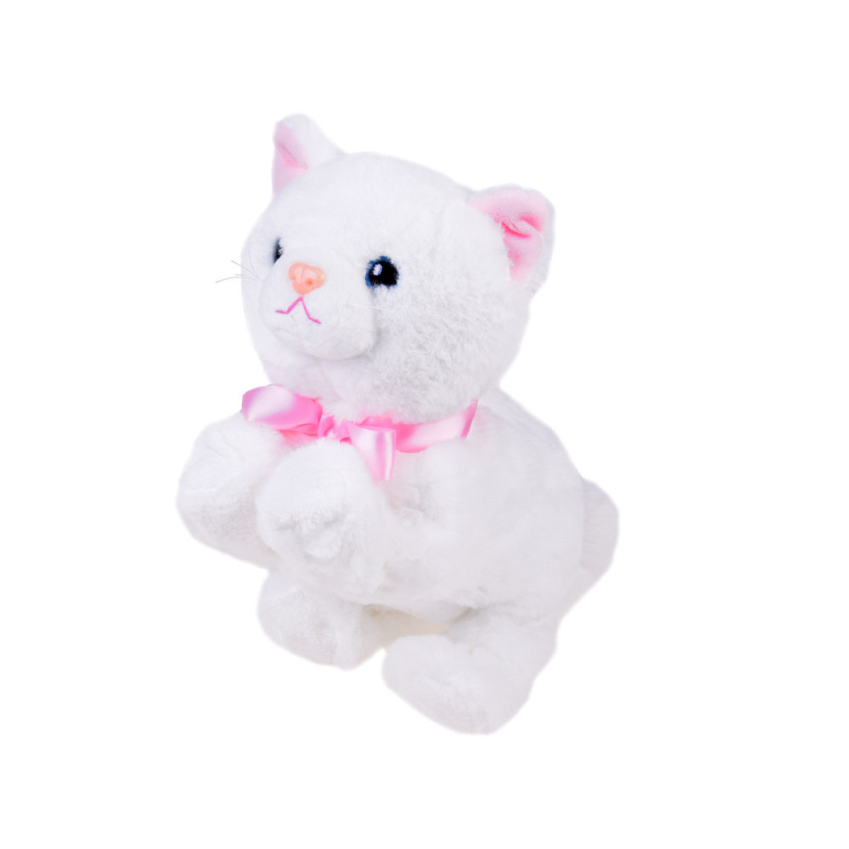 Mažas mielas interaktyvus katinukas su rožiniu kaspinu gali tapti kiekvieno vaiko draugu. Mažas baltas išdykėlis, kai paliečiamas ranka ar suplojama rankomis, leidžia kačių garsus bei atlieka akrobatinius judesius. Juk kiekvienas mažylis svajoja apie keturkojį draugą, su kuriuo galėtų žaisti. Tačiau sunku patenkinti visus mūsų vaikų norus, ypač jei jie svajoja apie tikrą keturkojį, o mes neturime galimybės tokio gyvūno laikyti. Todėl, kad bent iš dalies, o gal net minimaliai išpildytume jų norus, siūlome šį žavų pliušinį katinuką psotuką. Katinukas yra padengtas pliušiniu minkštu kailiuku, turi žavų rožinį plastikinį nosytę ir linksmas plastikines mėlynas akutes.