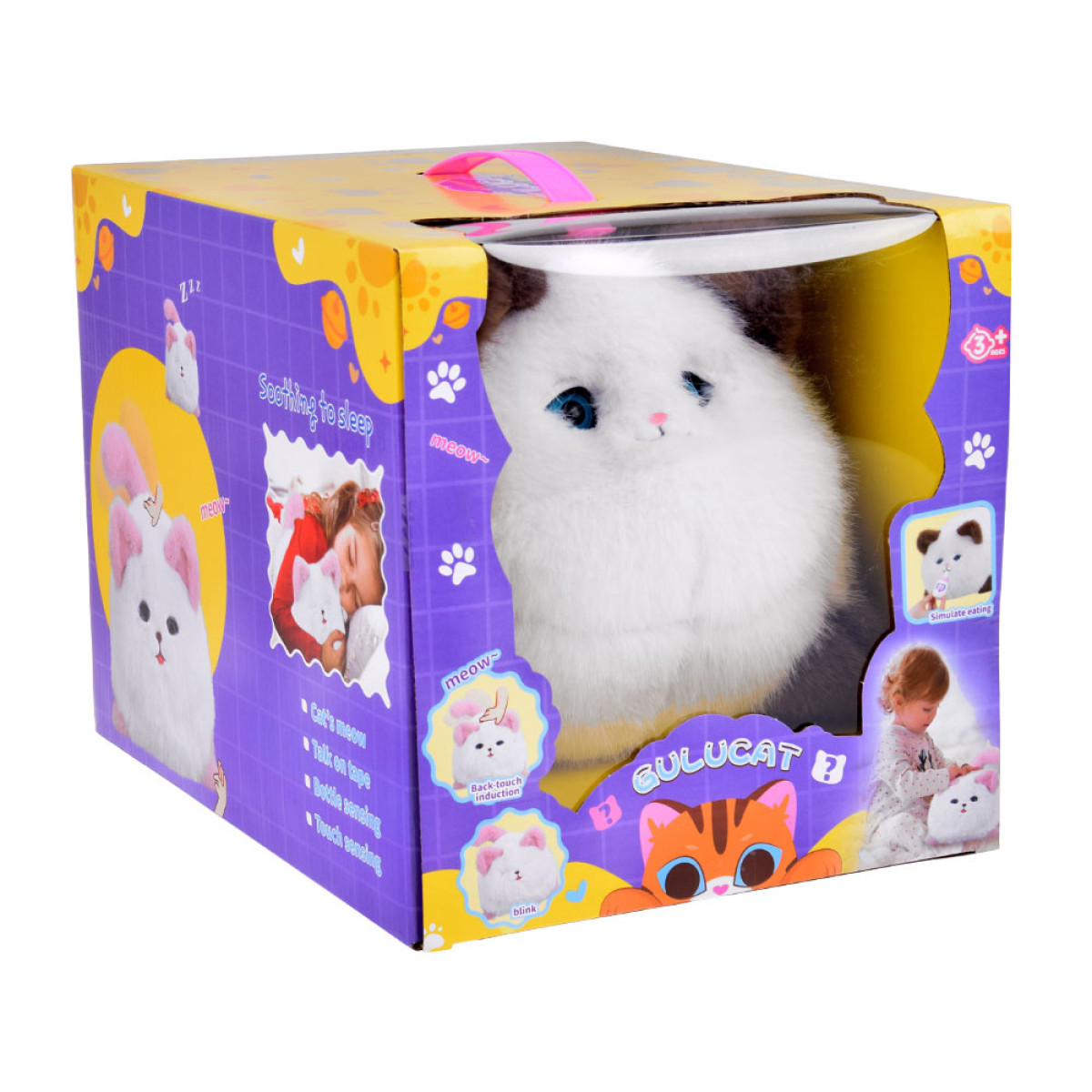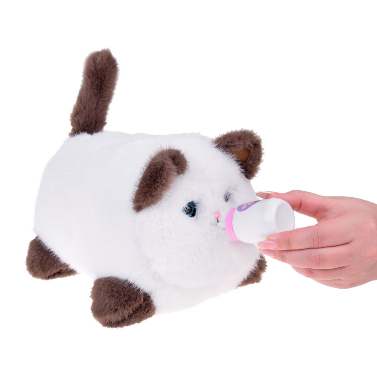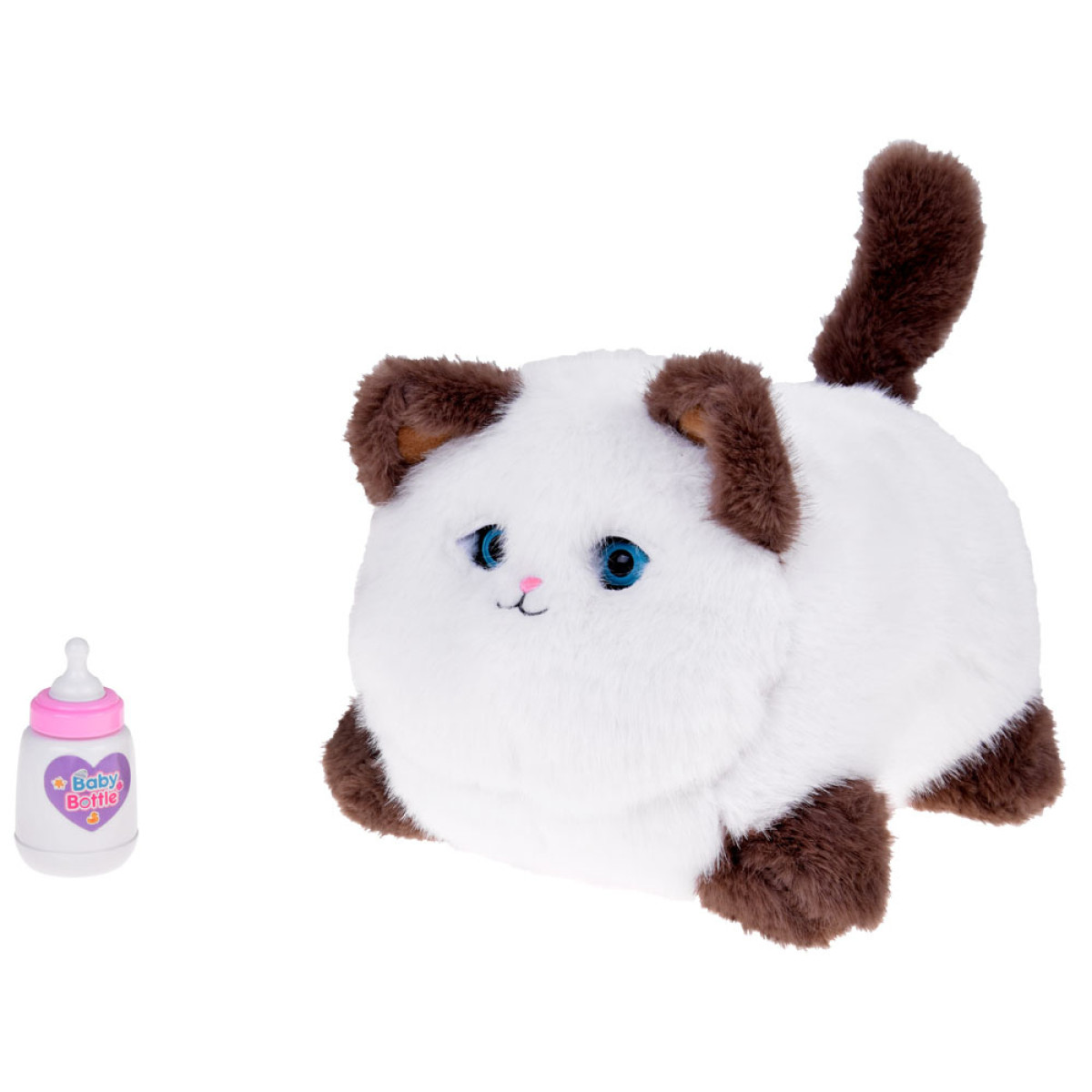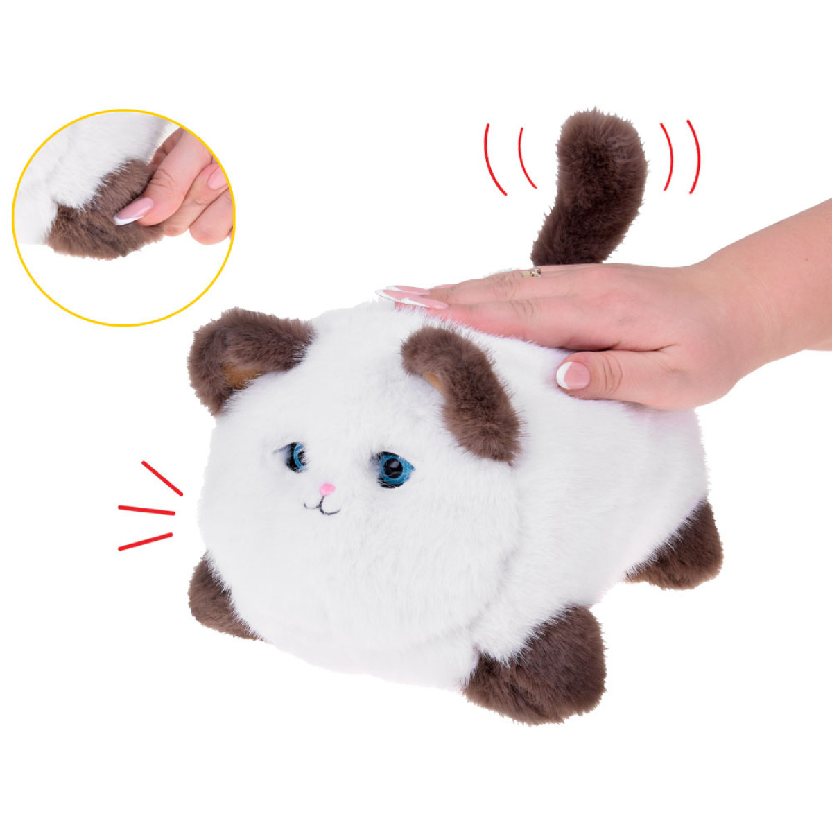 Šis pūkuotas, minkštas žaislas reaguoja į prisilietimus - turi garso efektus ir judesius. Paglostytas ant nugaros, kačiukas leidžia įvairius miaukimo ir murkimo garsus, judina uodegą ir mirksi akimis - kaip tikras katinas!