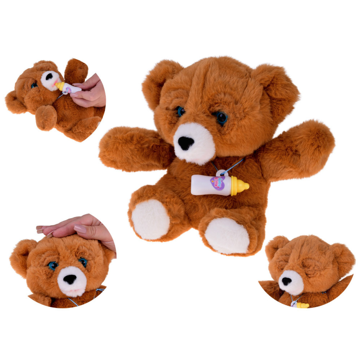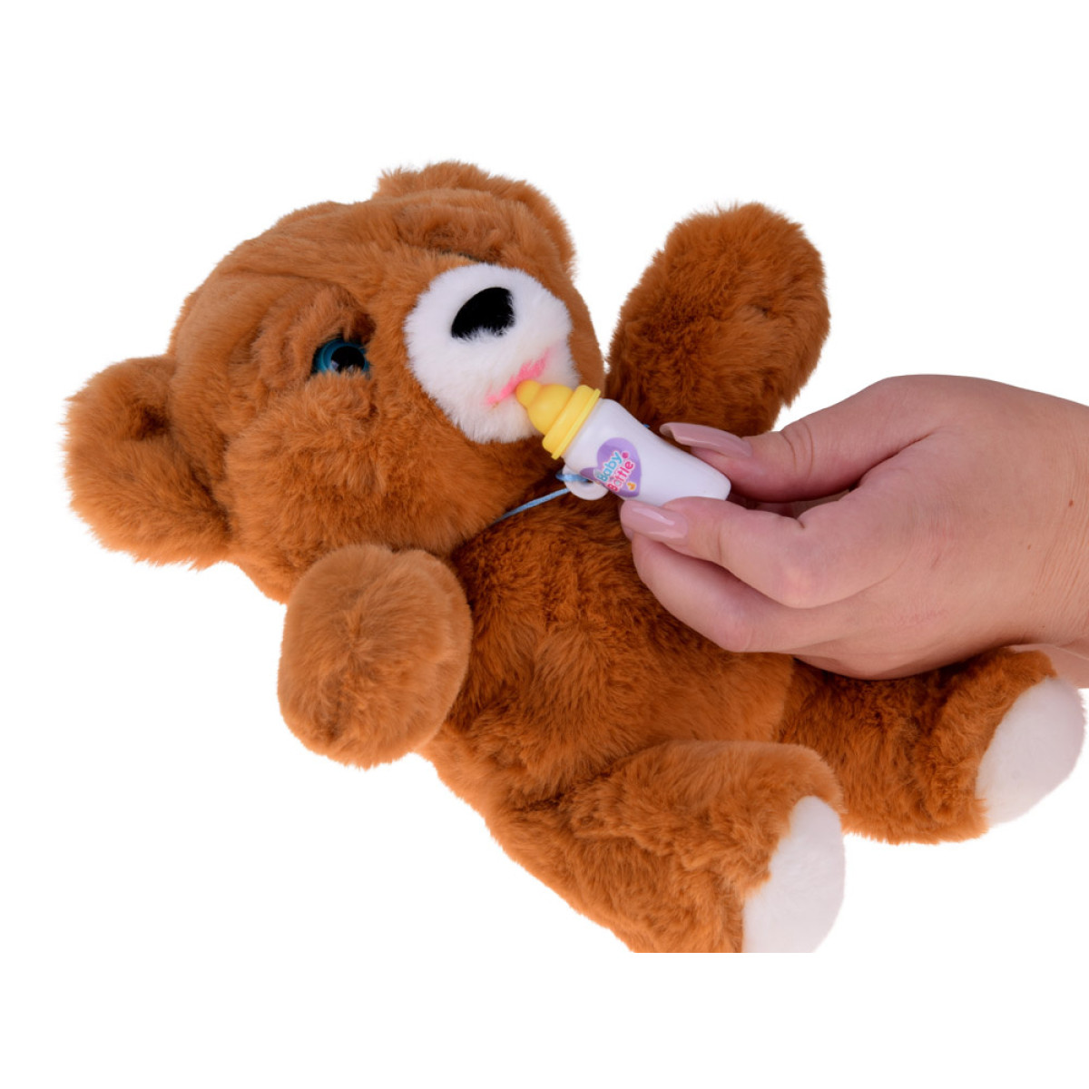 Susipažinkite su žaviu interaktyviu meškiuku su buteliuku, kuris sužavės kiekvieną vaiką! Šis minkštas žaislas ne tik atrodo mielai, bet ir reaguoja kaip tikras kūdikis – skleidžia valgymo garsus, juokiasi, verkia, niurzgia, siunčia bučinius ir judina akytes. Rinkinį sudaro buteliukas, kurio dėka mažylis gali „pamaitinti“ savo naują draugą ir rūpintis juo kaip tikru vaiku.