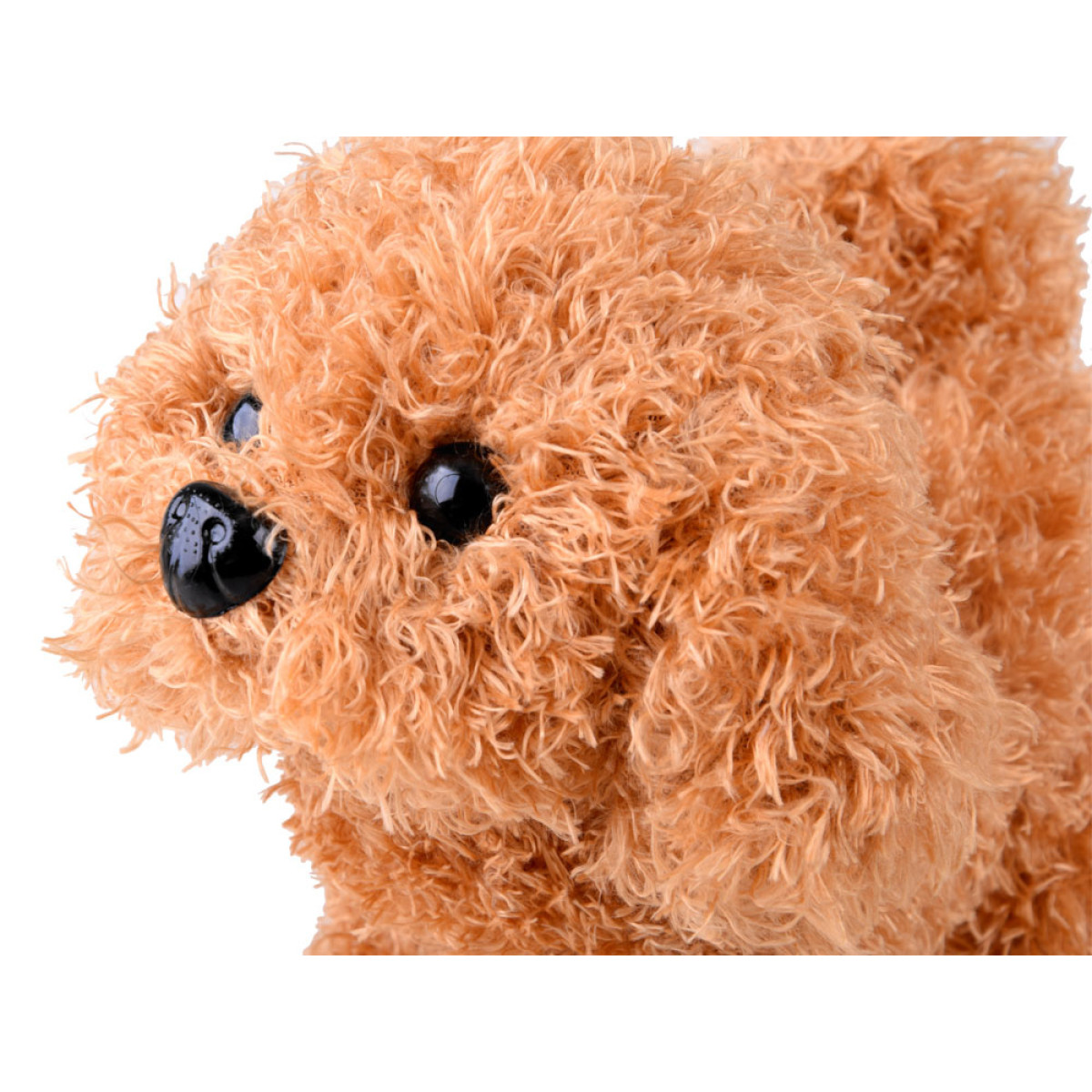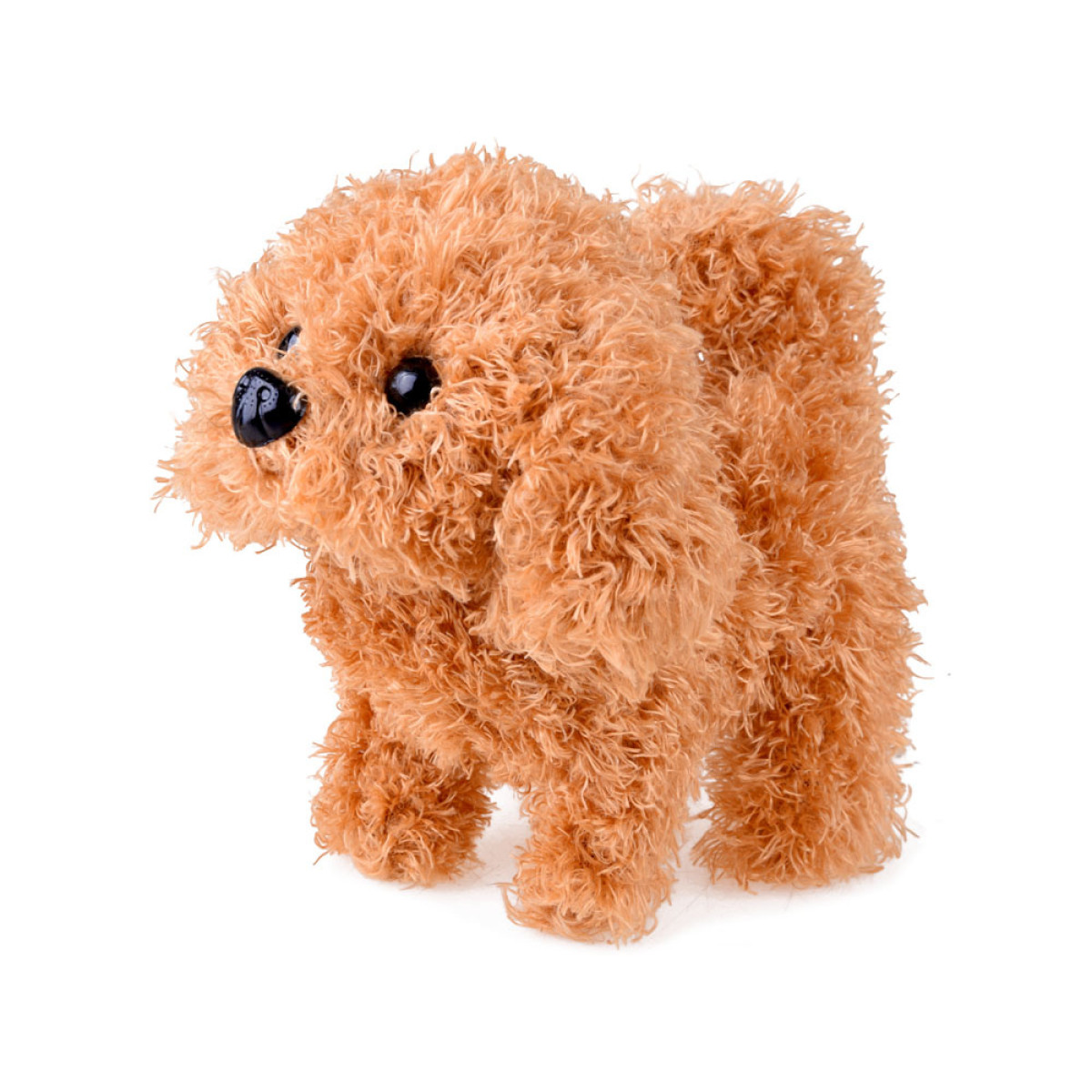 - Karamelinės spalvos pliušinis šuniukas su garbanotu kailiu, juodomis akimis ir nosimi