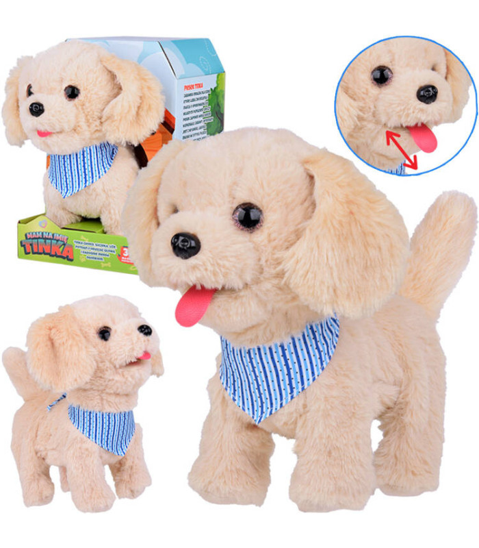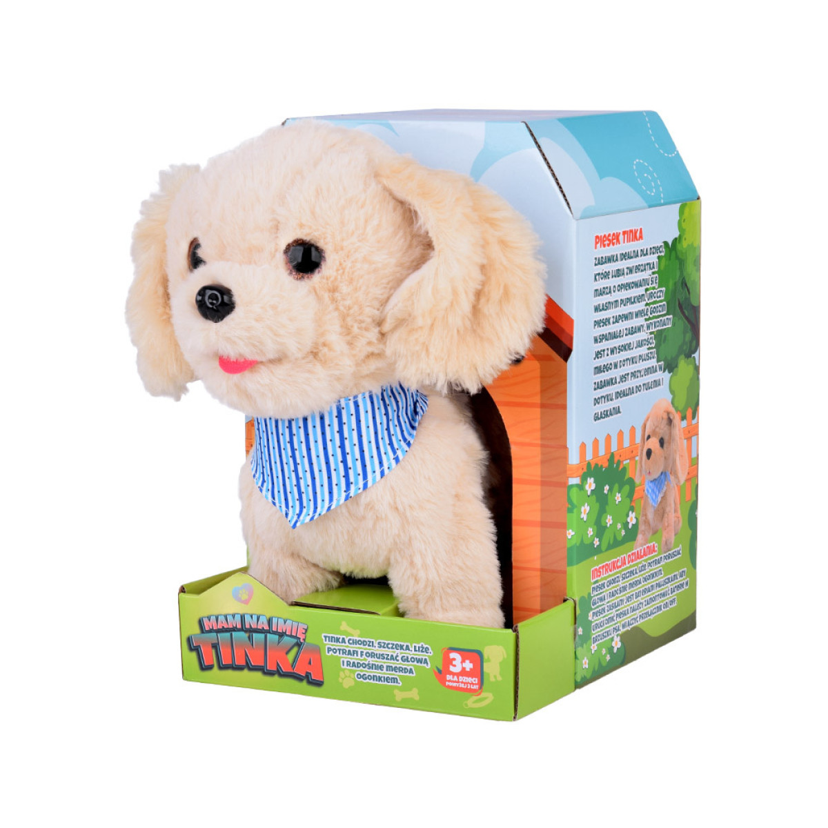 Susipažinkite su Tinka – mielu, interaktyviu šuniuku, kuris puikiai tinka kiekvienam mažam gyvūnų mylėtojui. Šis šuniukas, apsirengęs dailia mėlyna skarele, užtikrins valandų valandas smagaus žaidimo ir apkabinimų.