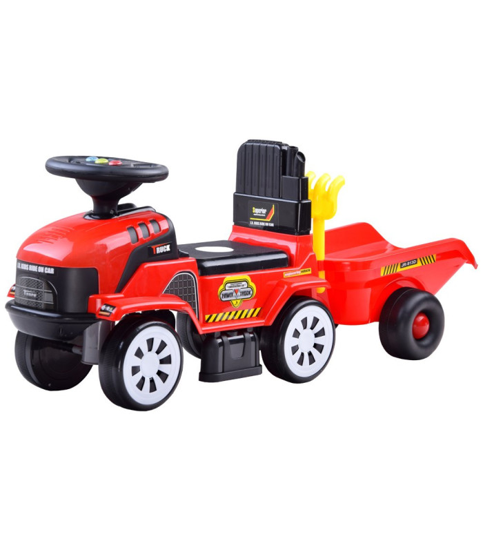 Traktoriukas pagamintas iš lengvos plastikinės konstrukcijos ir turi ergonomišką formą. Automobilis su vairu yra skirtas tiems, kuriems svarbiausia yra vaikų saugumas. Žaidimas per sportą skatina mūsų vaikų tinkamą vystymąsi.