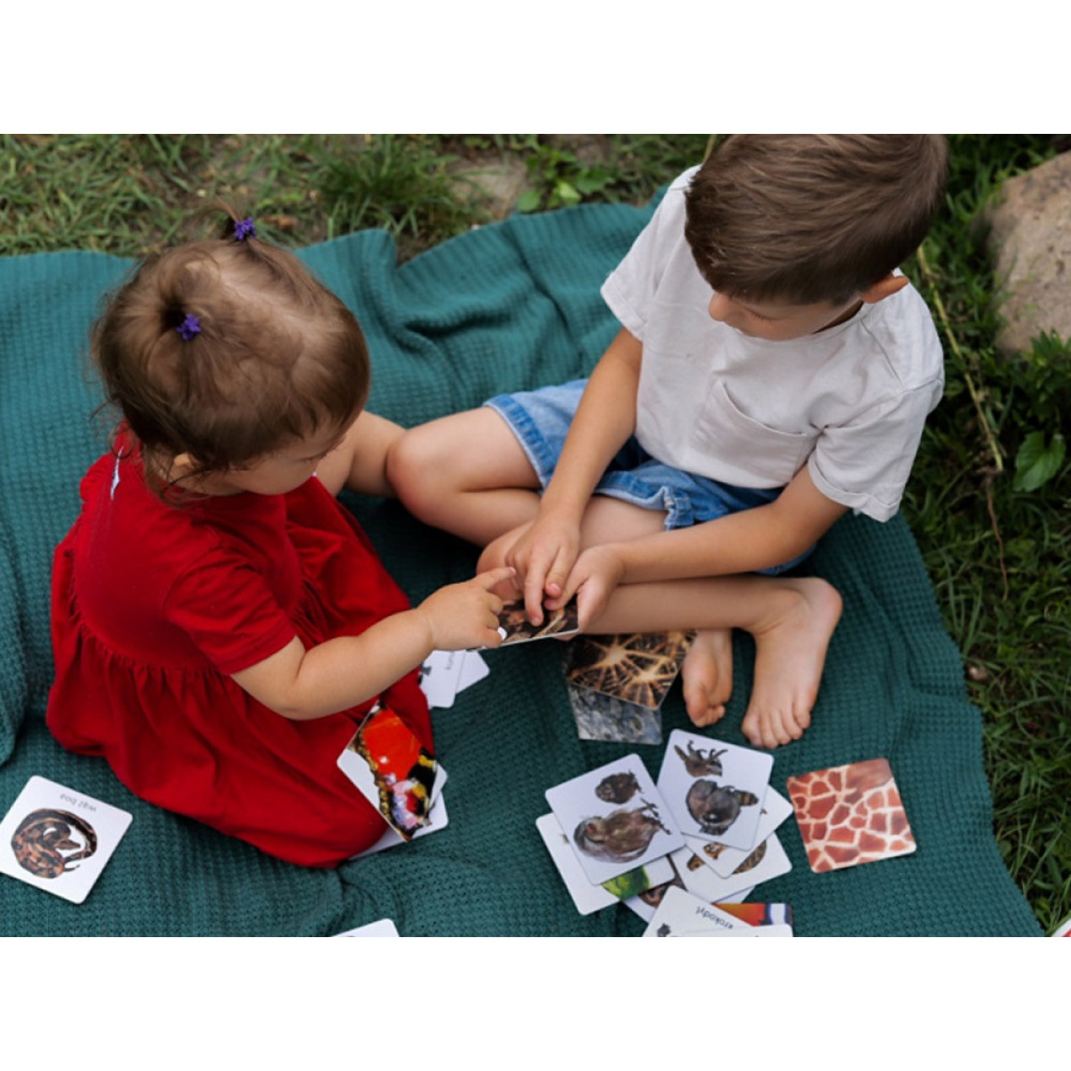 Montessori tikėjo, kad vaikai mėgsta būti arti gamtos. Todėl skatinkime juos susitikti su gamta, kuri įtrauks regos, lytėjimo, klausos ir uoslės pojūčius, bei žaisti su priemonėmis, tokiomis kaip šios kortelės. Ant jų pateiktos realistiškos iliustracijos yra puikus papildymas žinioms apie aplinkinį pasaulį.