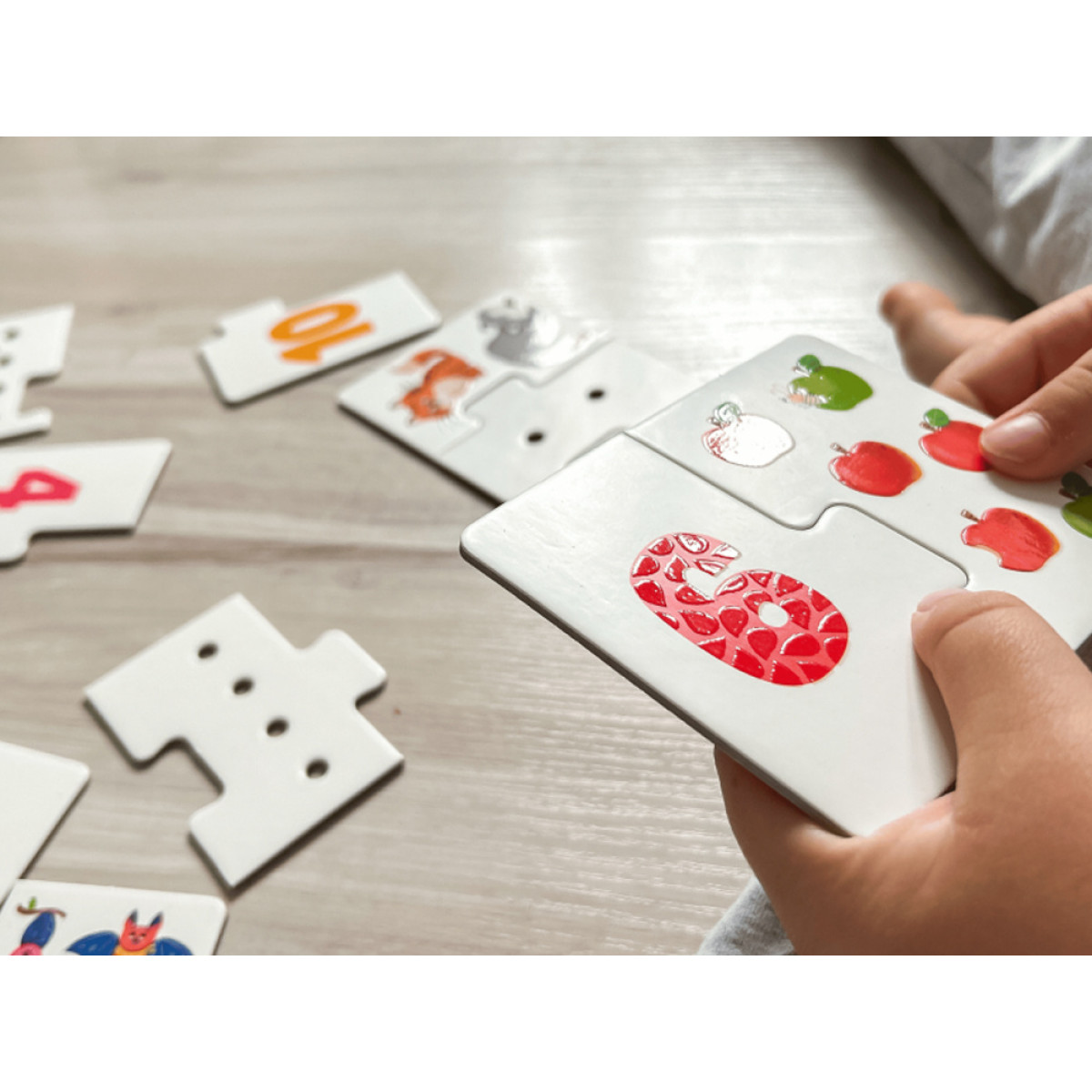 „1“ kaip vienas obuolys, „5“ kaip penkios žuvytės – su šiomis dėlionėmis skaičių mokymasis tampa puikiu žaidimu! Rinkinyje yra 10 trijų dalių dėlionių (iš viso 30 dalių), kurios padeda pažinti skaičius nuo 0 iki 9 ir suprasti jų reikšmę.