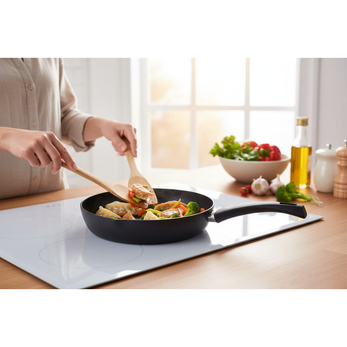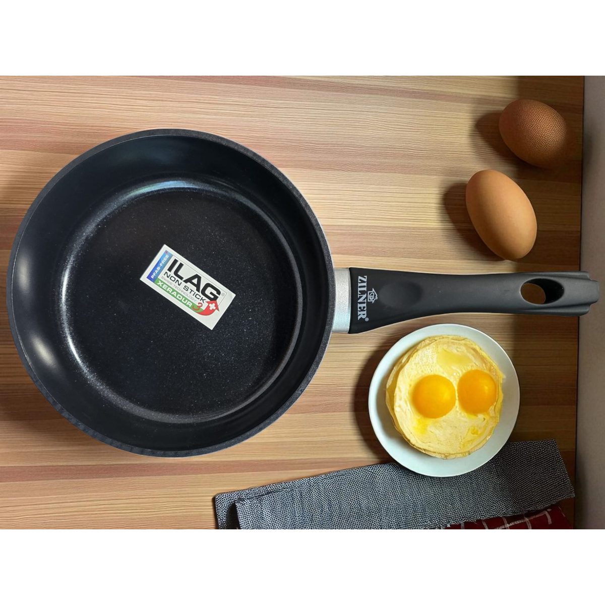 Ergonomiška rankena iš karščiui atsparaus plastiko užtikrina patogų ir saugų naudojimą, o sustiprintas dugnas leidžia keptuvei greitai įkaisti ir tolygiai paskirstyti šilumą.