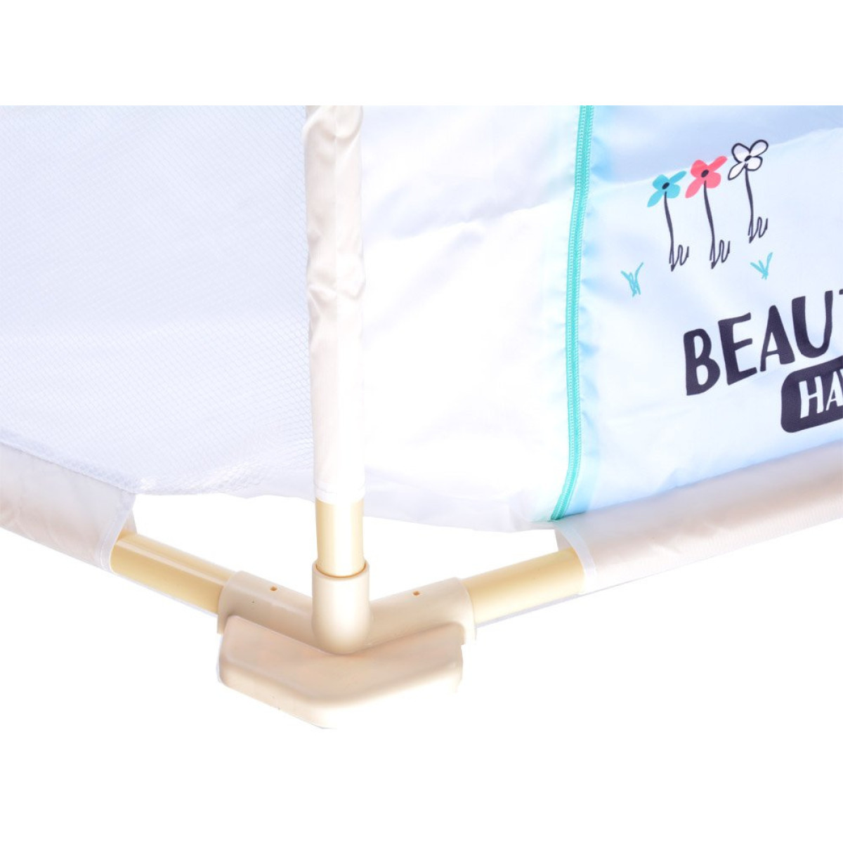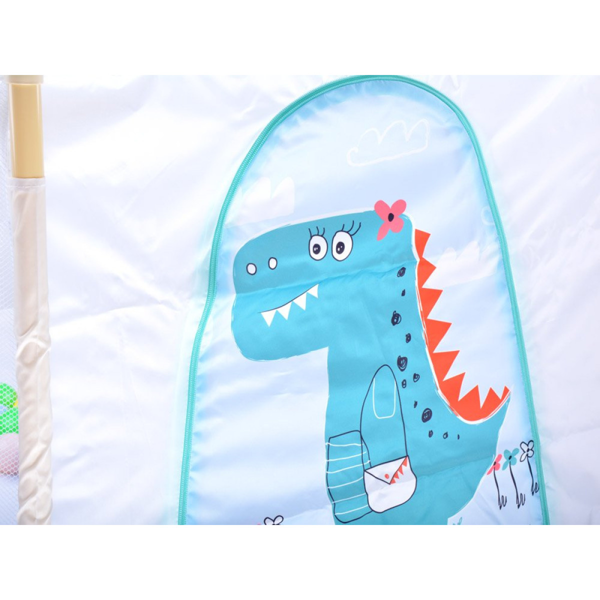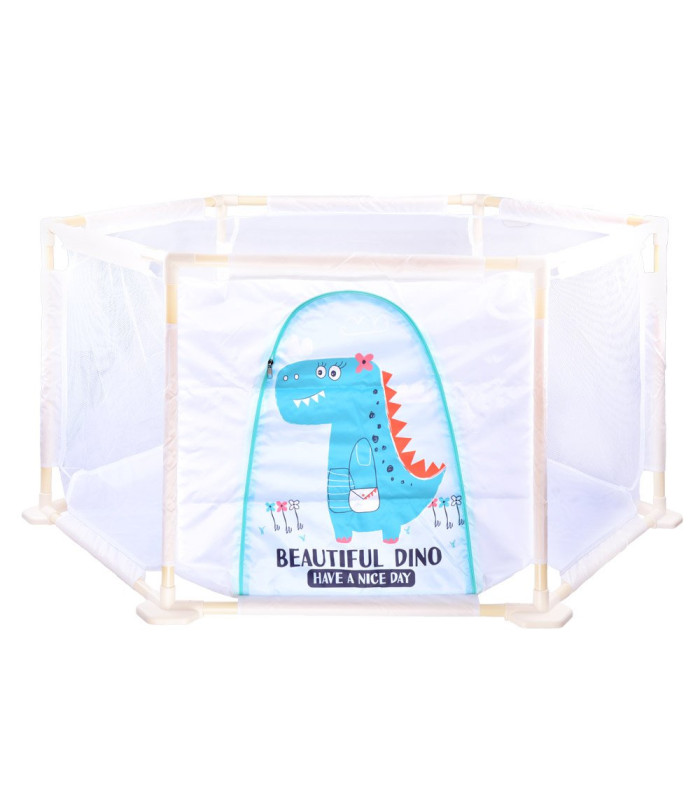 Maniežo konstrukcija pagaminta iš plastikinių vamzdžių, kurie lengvai susijungia tarpusavyje. Medžiaga su dinozauro atvaizdu yra maloni liesti ir lengvai valoma.