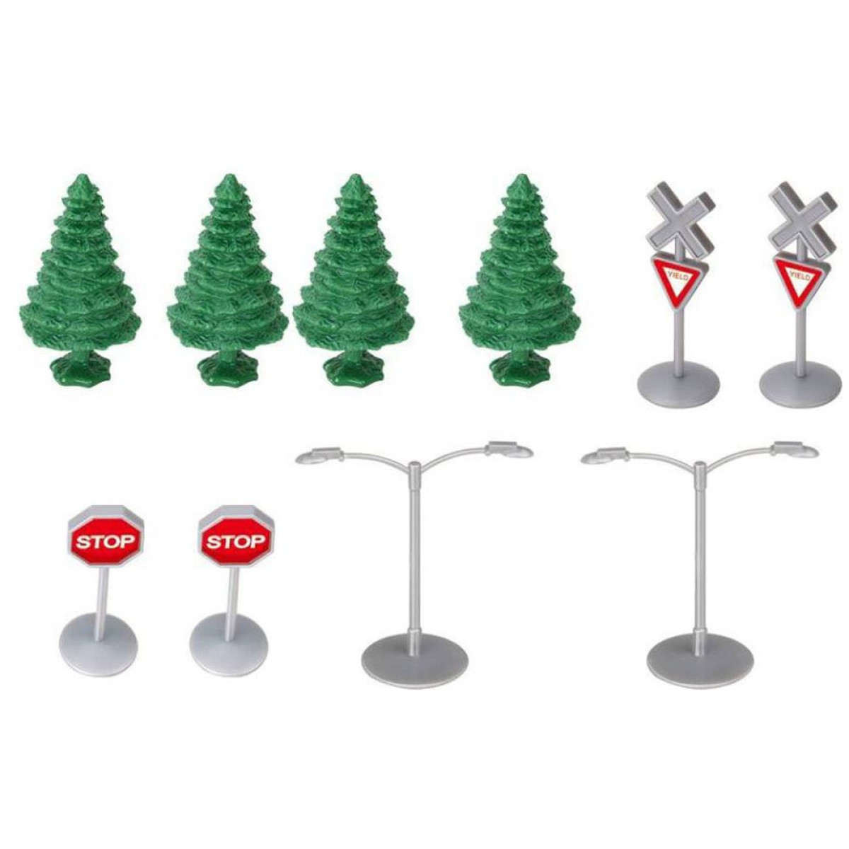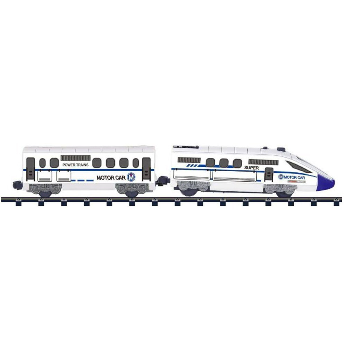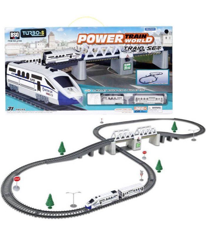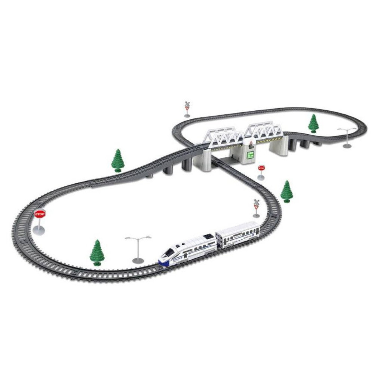 - Traukinį varo modernus lokomotyvas su šviesa priekyje. Komplekte be lokomotyvo rasite keleivinį vagoną. Trasa yra aštuoniukės formos su tiltu.