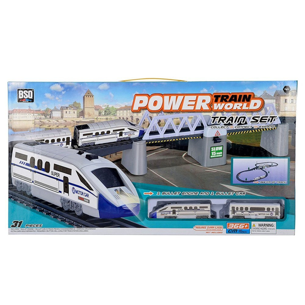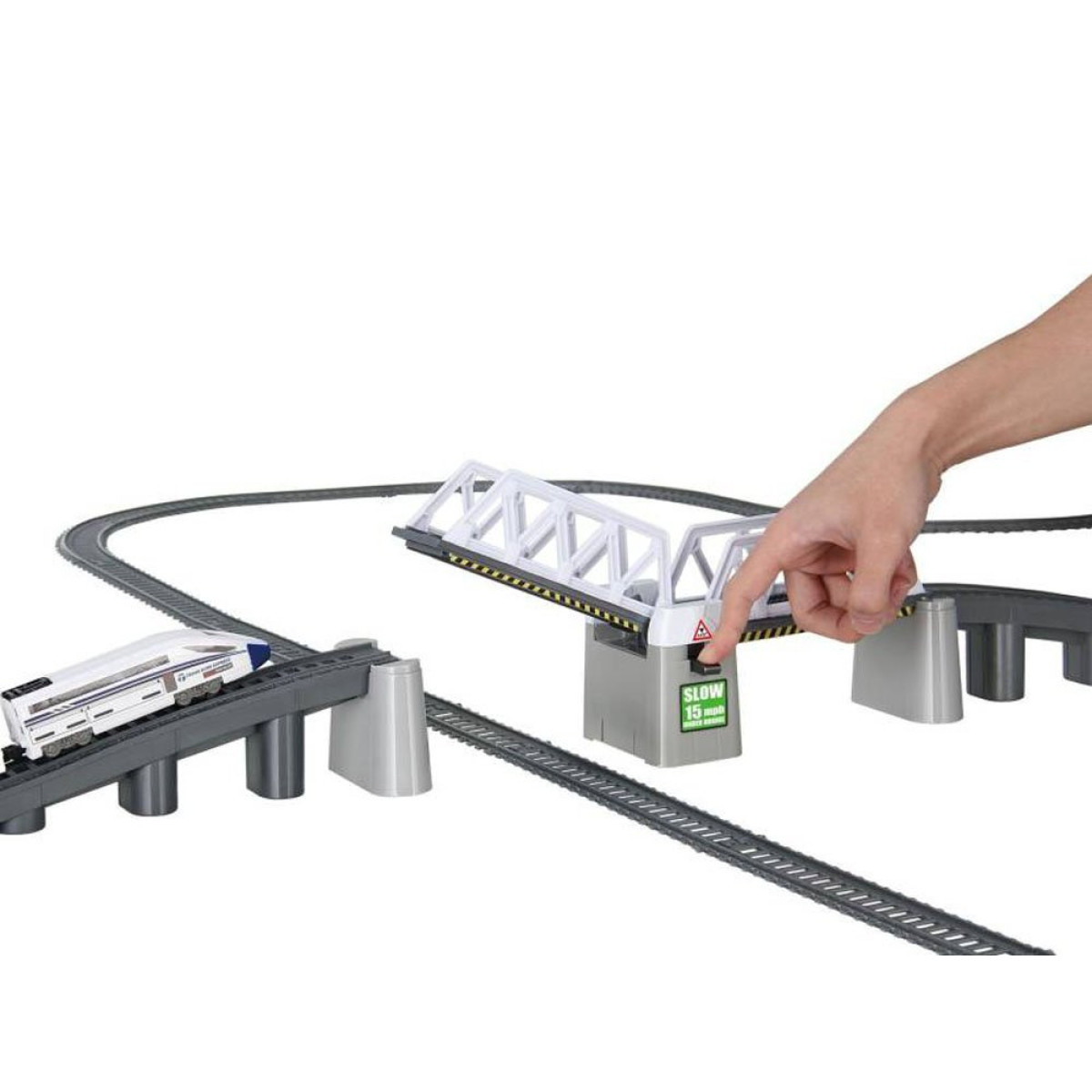 Elektrinis keleivinis traukinys su atrakcija - pakeliamu tiltu - yra puikus pasirinkimas kiekvienam mažam mašinistui. Tiltas pakeliamas mygtuko paspaudimu. Modernus traukinys yra kruopščiai sukurtas ir saugus žaislas. Traukinį varo modernus lokomotyvas, kuris važiuojant šviečia raudona šviesa. Žaislas taip pat turi greičio reguliavimo funkciją. Baterijos įmontuotos lokomotyvo viduje.