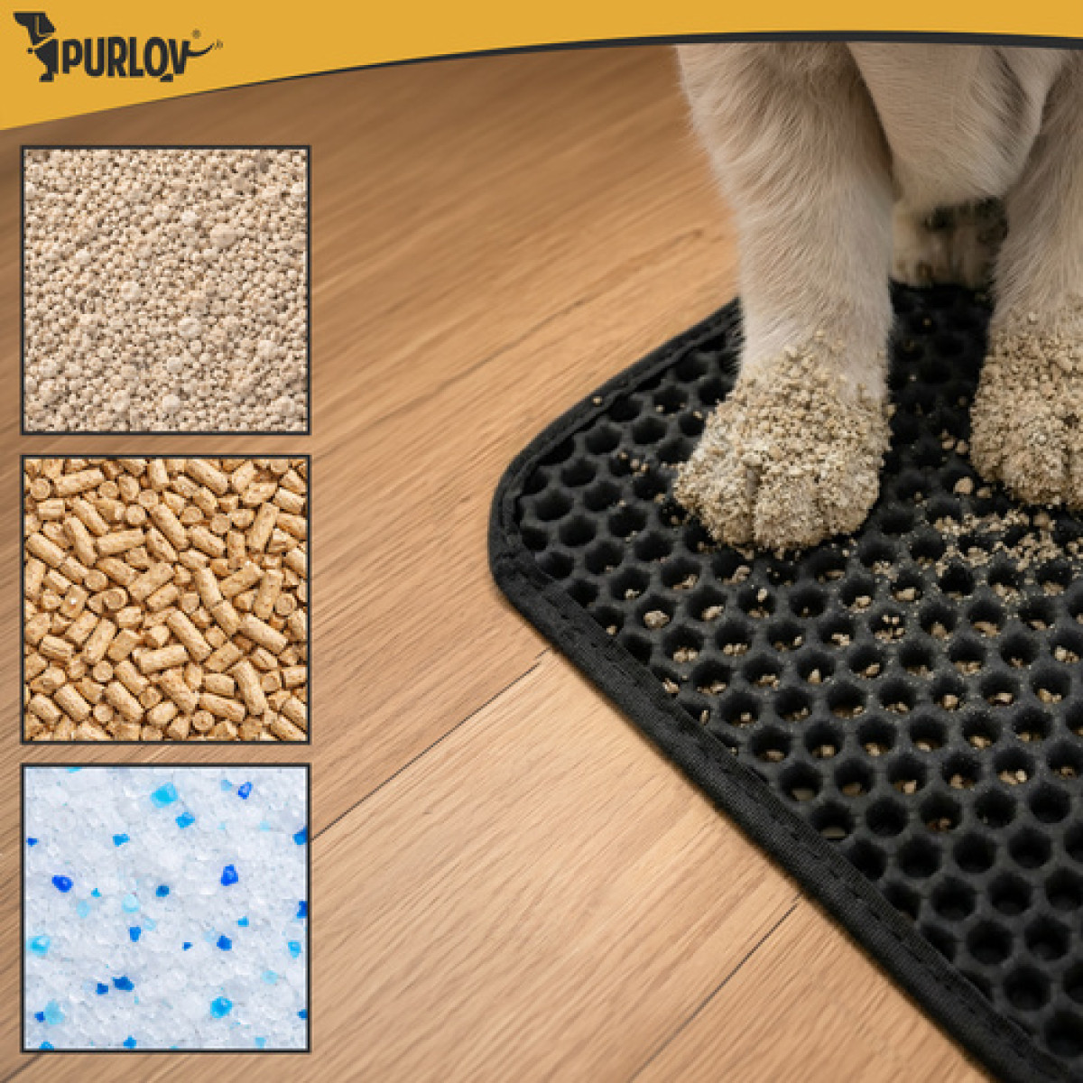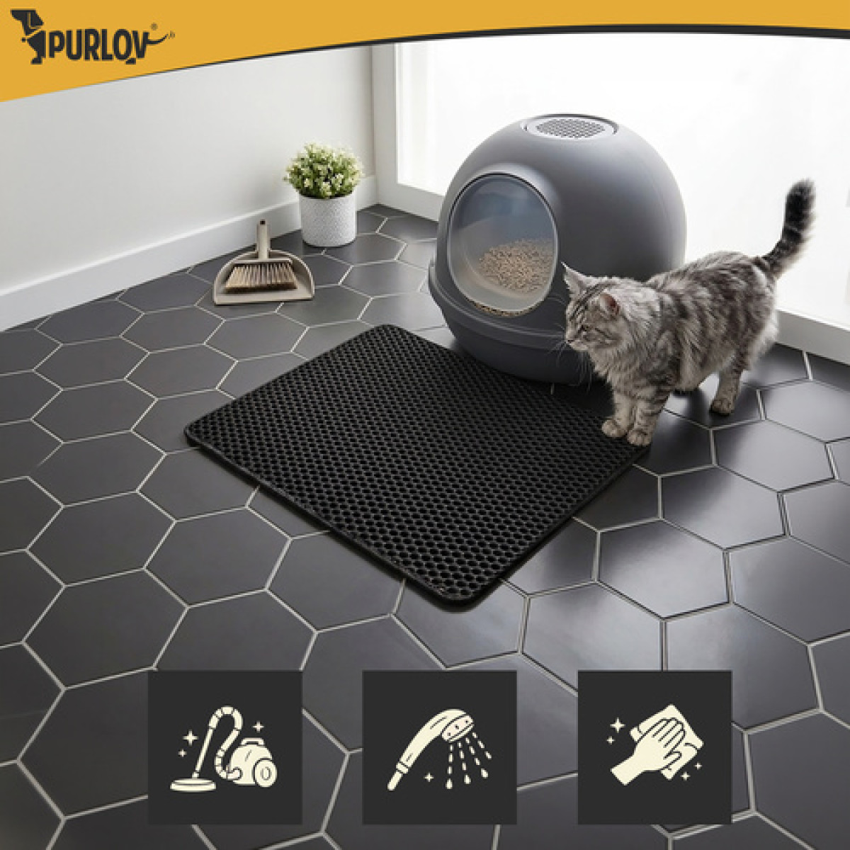 Ar pavargote nuo kraiko, kurį katė po kiekvieno apsilankymo tualete išnešioja po namus? Purlov kilimėlis po kačių tualetu 60 x 45 cm surenka kraiko granules nuo letenėlių ir padeda palaikyti švarą aplink tualetą be kasdienio šlavimo.