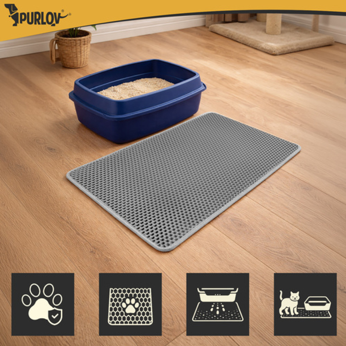 Pavargote nuo po visus namus išnešiojamo kraiko po kiekvieno katės apsilankymo kraiko dėžėje? Purlov kraiko surinkimo kilimėlis padeda sulaikyti kraiko granules nuo letenėlių ir palaikyti švarą aplink kraiko dėžę be kasdienio šlavimo.