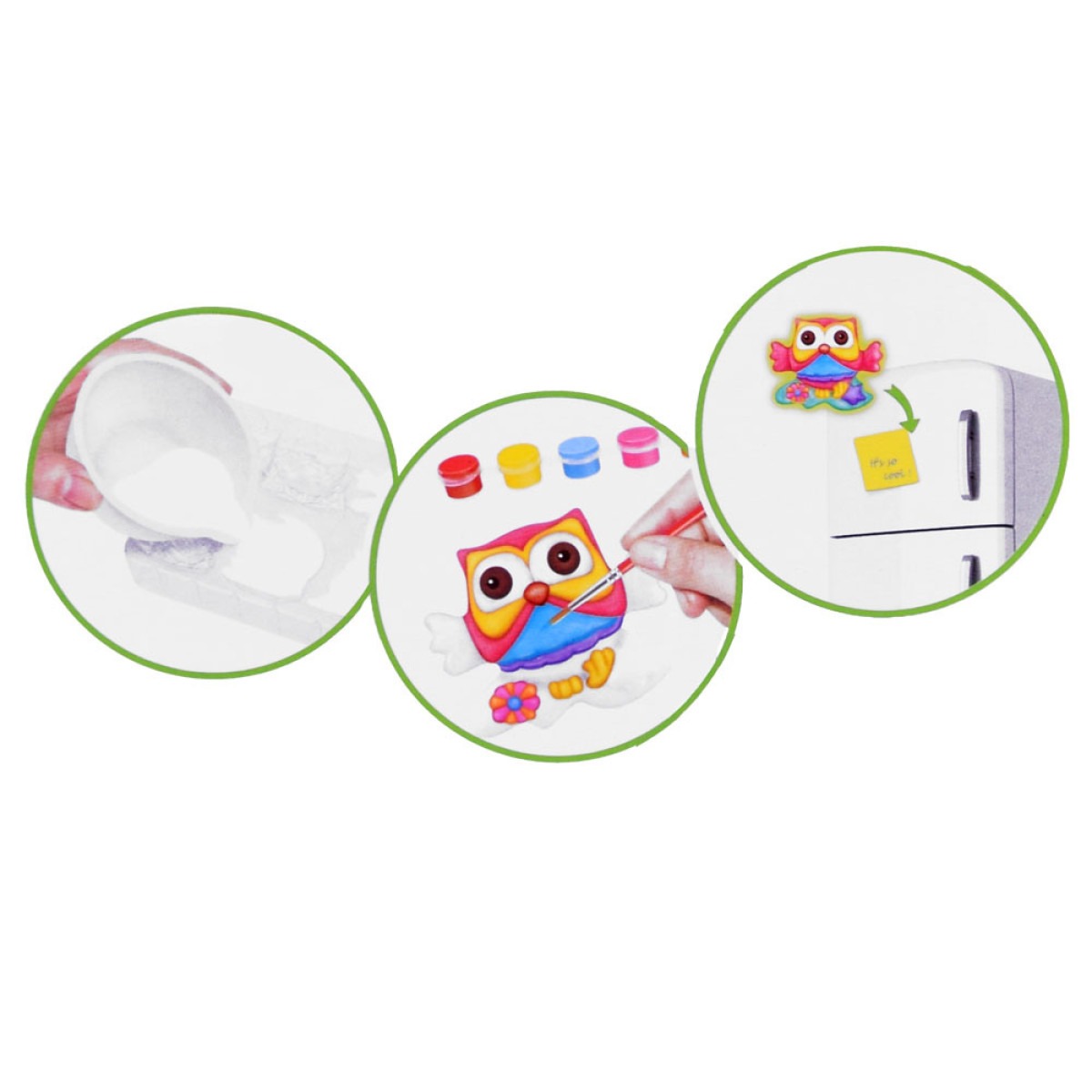 Kūrybinis magnetų komplektas vaikams yra ideali dovana kiekvienam vaikui, kuris turi menininko sielą. Žaidimas su gipsu yra puiki patirtis vaikui. Vaikai mėgsta kurti įvairias formas iš plastinės masės ir vėliau jas spalvinti pagal savo fantaziją. Tai yra rinkinys, skirtas kūrybiniam magnetų kūrimui šaldytuvui su mielų pelėdų forma. Vaikas turi pats paruošti liejinį, tada jį nudažyti pagal savo norus ir priklijuoti magnetinę juostelę.