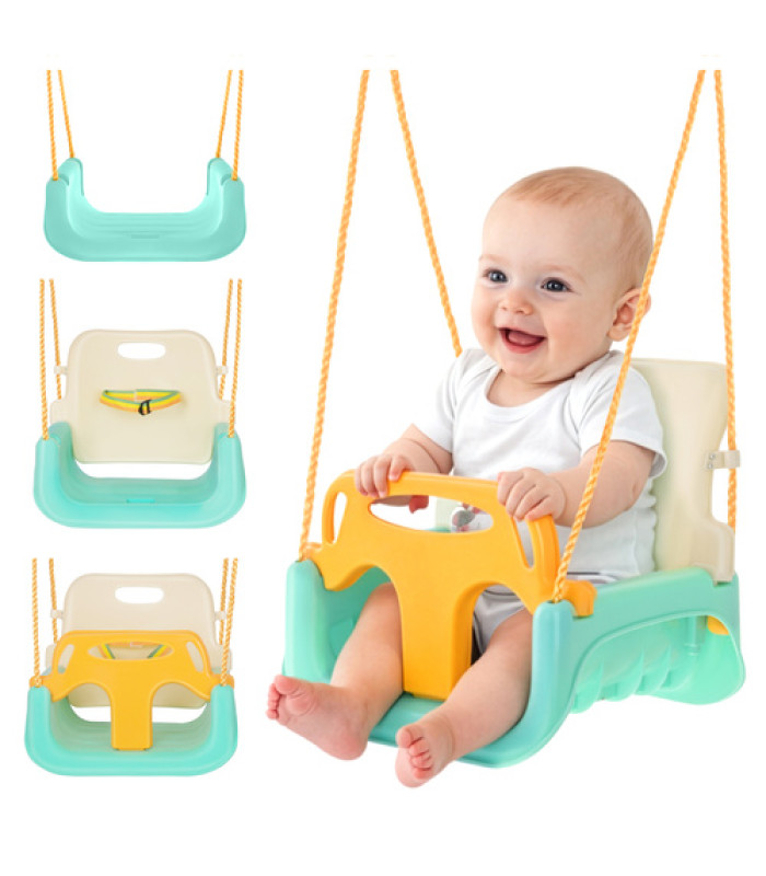 - konstrukcija 3in1 su nuimama barjerine ir atlošu - viena sūpynė, pritaikyta skirtingiems vaiko vystymosi etapams, nereikalaujant naujos pirkimo kiekvieną sezoną