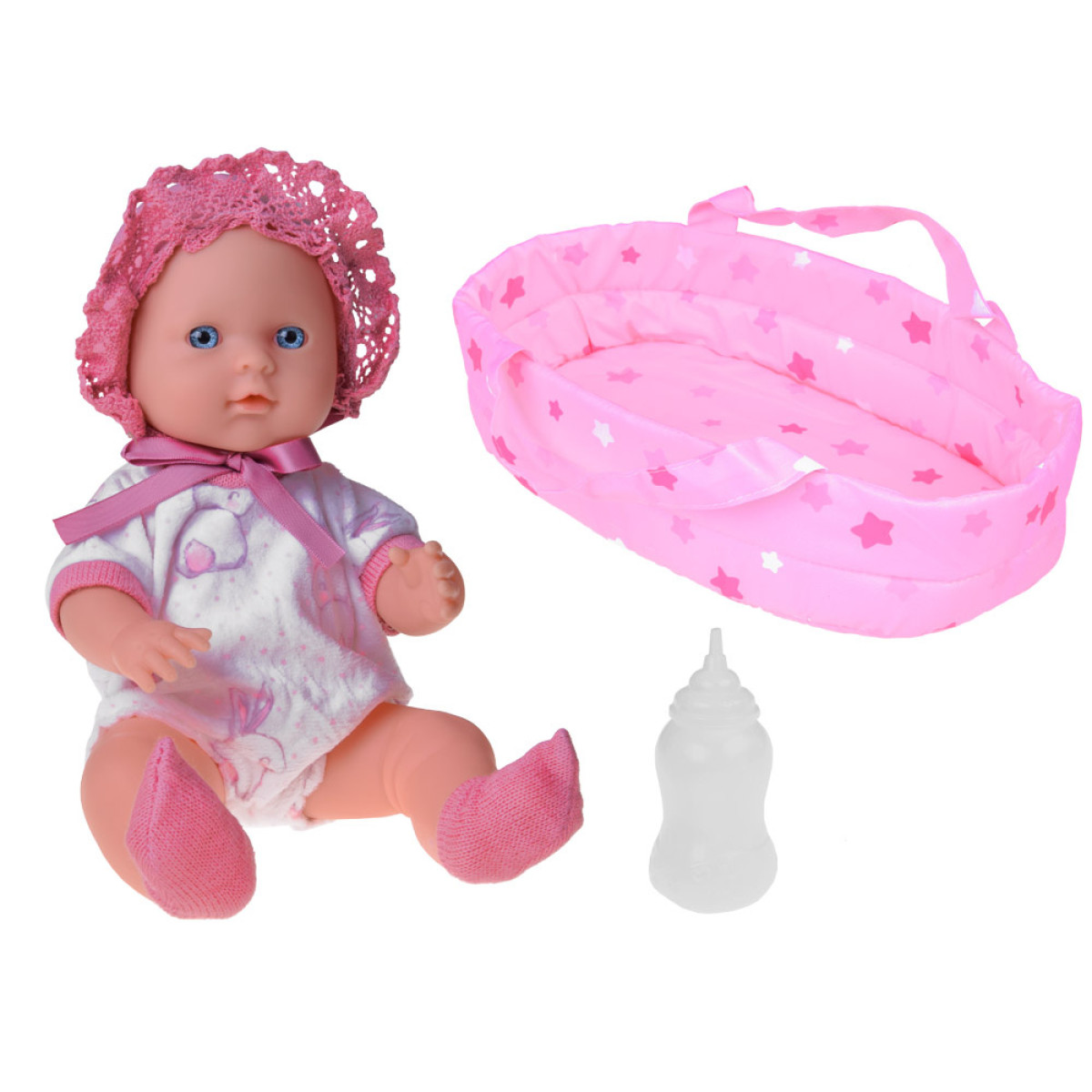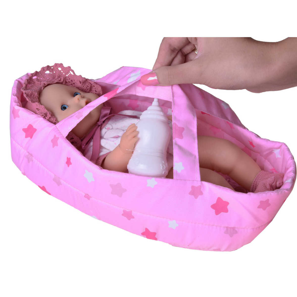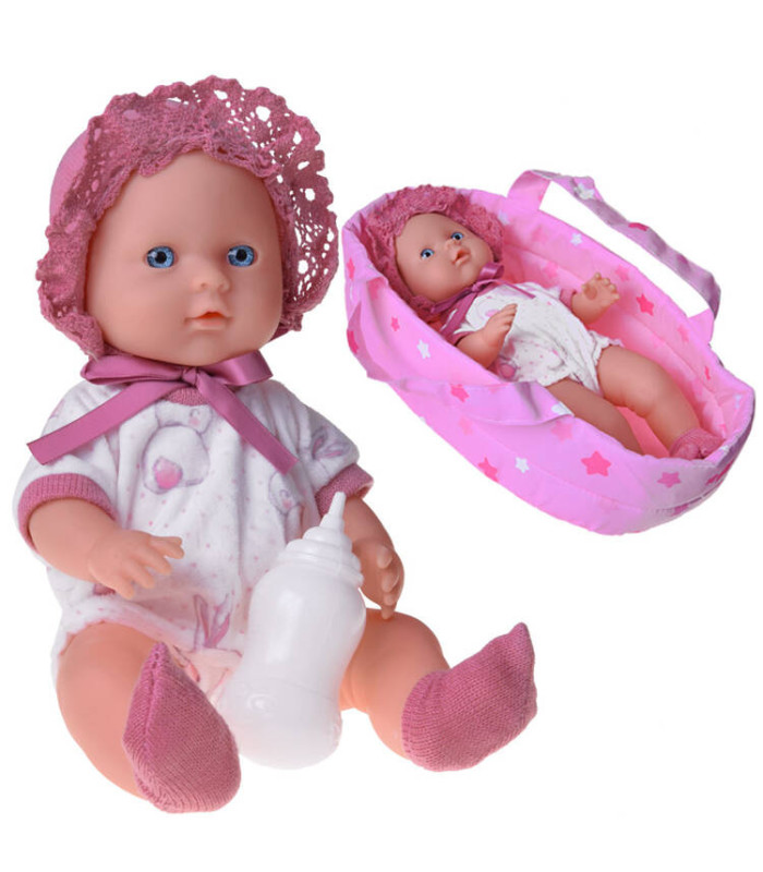 Rinkinys lėlė ir nešynė yra idealus pasirinkimas mažiesiems mamoms ir tėveliams. Puikiai tinka kelionėms ir pasivaikščiojimams. Šis rinkinys su priedais yra svajonė kiekvienai mamai ir būsimam tėveliui. Žavinga lėlė su nuostabiomis mėlynomis akimis, rožine kepurėle ir baltu drabužiu su triušiukais. Po pagirdymo ji dar ir šlapinasi. Visa lėlė pagaminta iš gumos, o jos galūnės yra judrios. Nešynė pagaminta iš aukštos kokybės medžiagų. Ant nešynės pritvirtintos dirželiai, kurie palengvina lėlės transportavimą. Rinkinyje taip pat yra priedai lėlės maitinimui. Kompaktiškas rinkinys puikiai tiks net ir mažose vaikų kambariuose. Nešynė yra pakankamai didelė, kad talpintų lėles iki 30 cm aukščio!