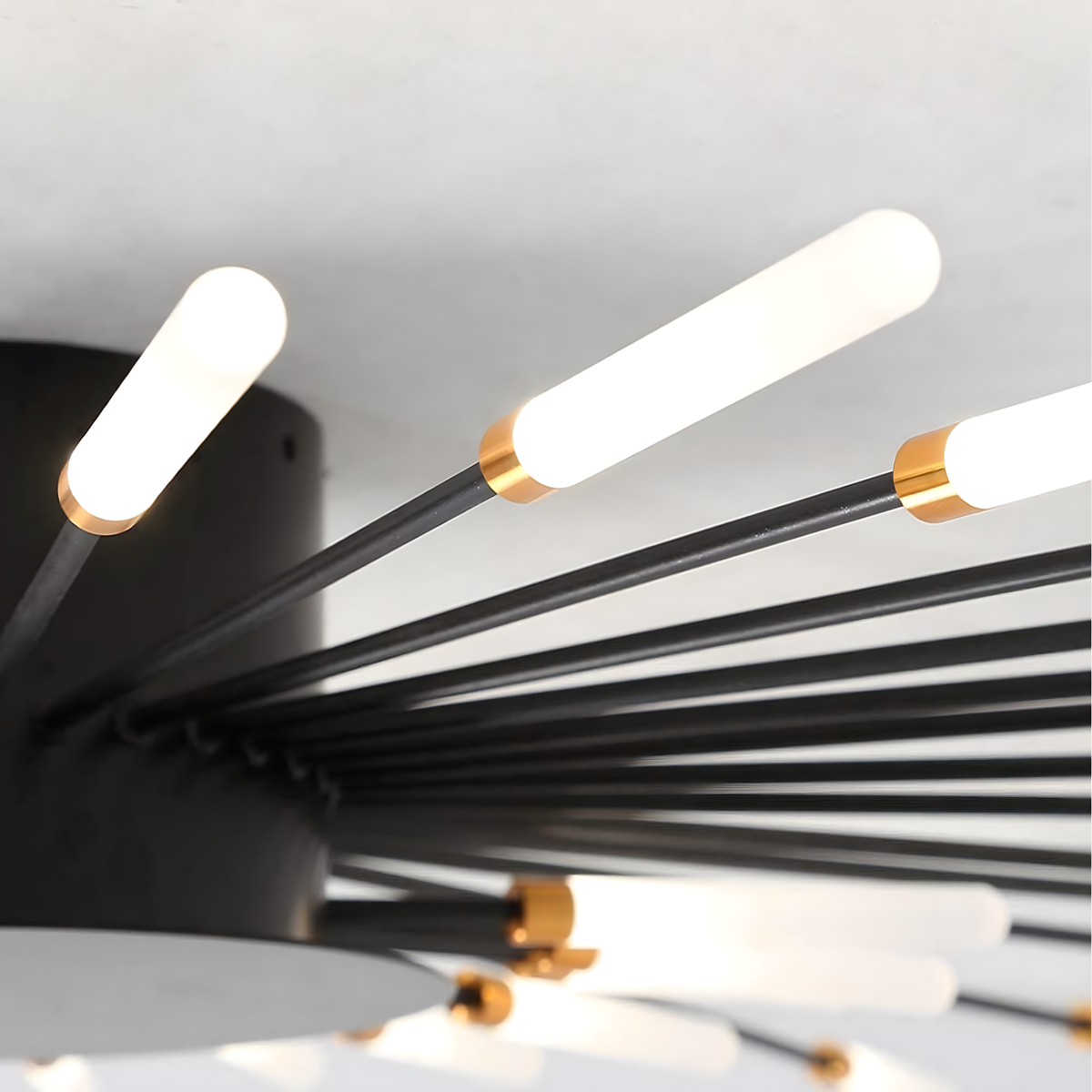 Efektingas šviestuvas su 12 rankomis, matine juoda spalva su aukso akcentais. Integruoti LED šaltiniai užtikrina ryškų, energijos taupymo apšvietimą. Idealus pasirinkimas svetainei, valgomajam ar šiuolaikiniam interjerui.