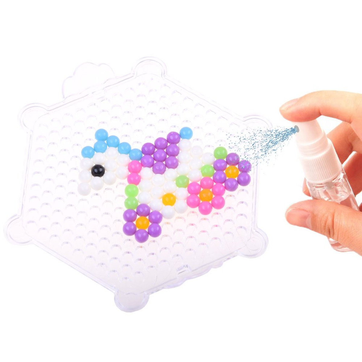 3. Po visų karoliukų sudėliojimo, pripildykite purkštuvą vandeniu ir kelis kartus purkškite karoliukus iš maždaug 10 cm atstumo. Jei karoliukai nebus pakankamai sudrėkinti, jie nesulips.
