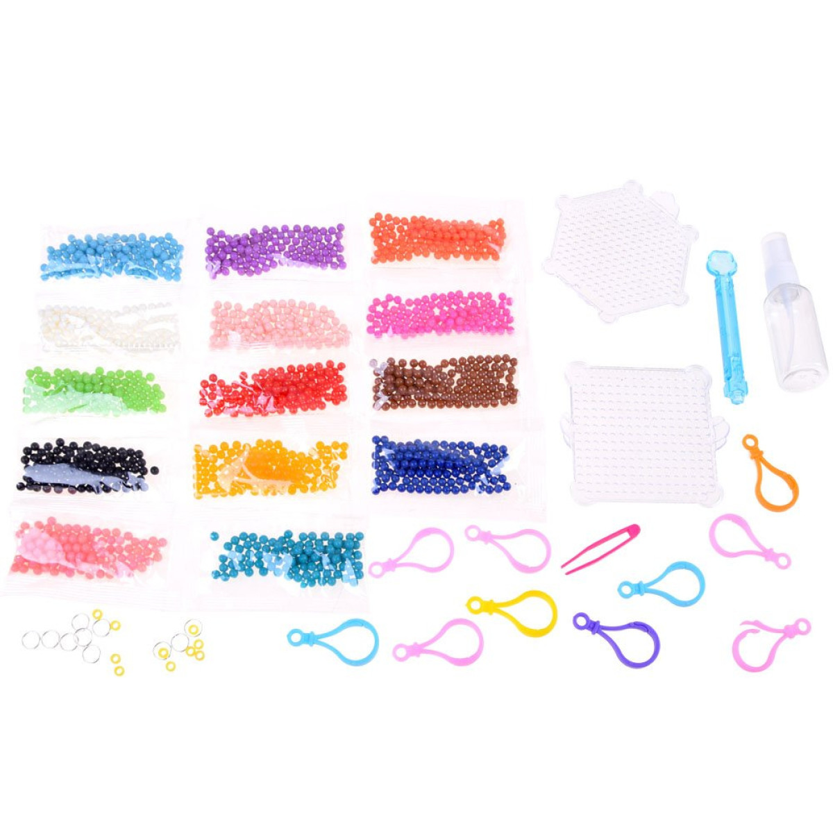- 14 maišelių su karoliukais (spalvos: oranžinė, mėlyna, žalia, ruda, raudona, geltona, šviesiai rožinė, tamsiai rožinė, pudros rožinė, juoda, tamsiai mėlyna, turkio, violetinė)