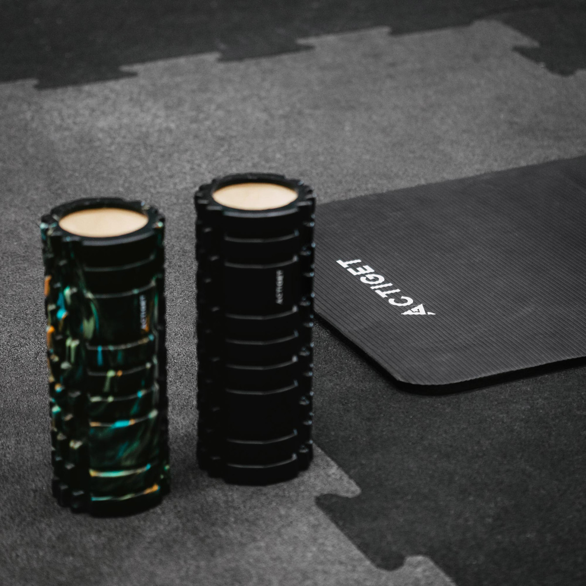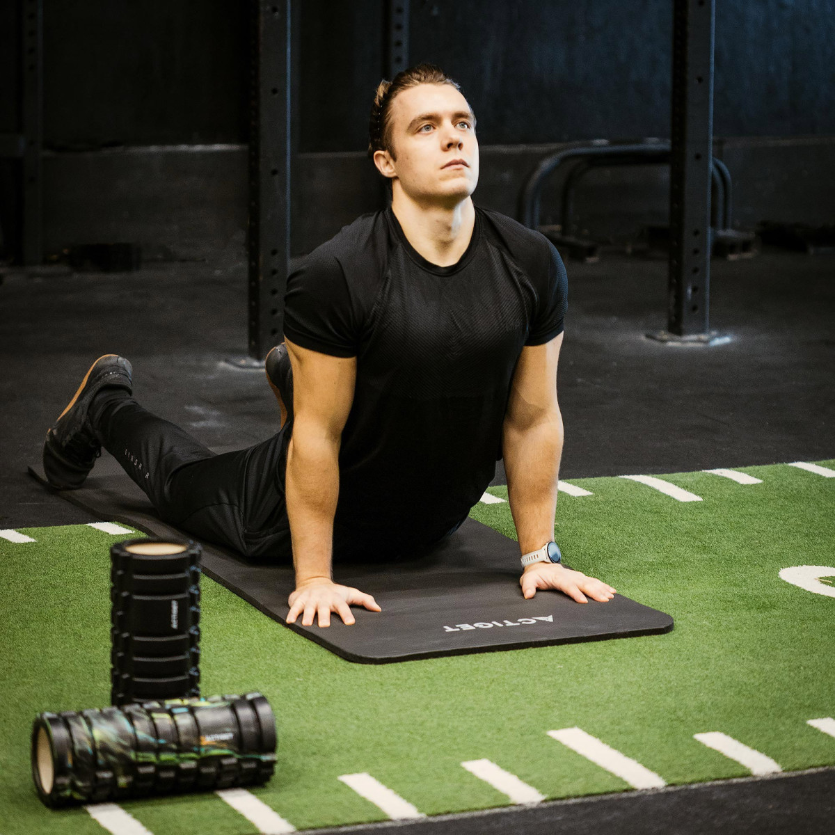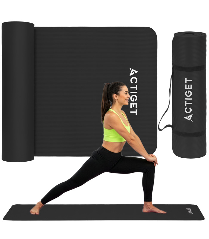 Komplekte yra elastingas diržas, skirtas patogiam kilimėlio transportavimui.
