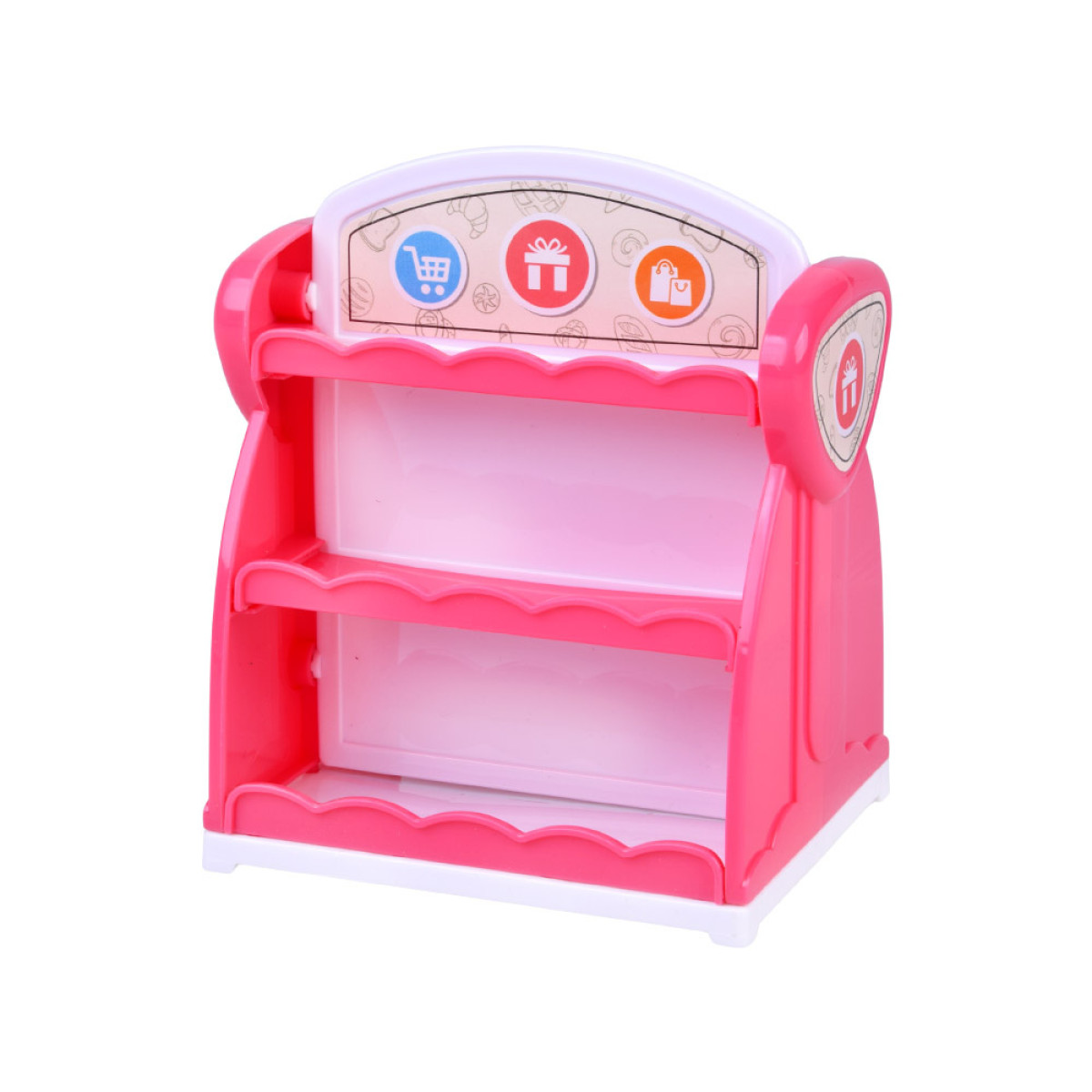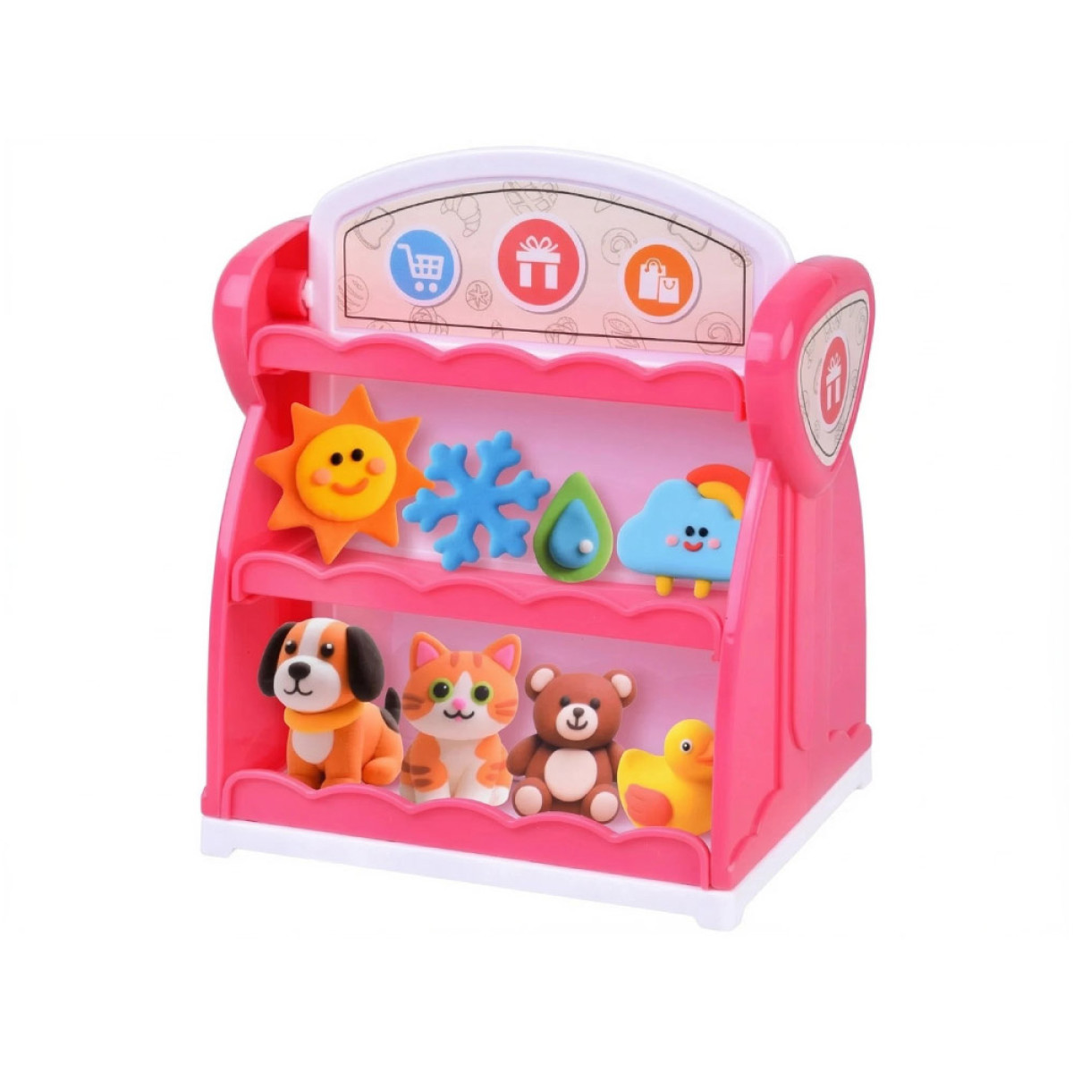 rinkinyje yra rausva dvipusė ekspozicinė lentyna, primenanti mažą parduotuvę. Iš abiejų pusių yra po tris lentynas, ant kurių galima sudėti sukurtas figūrėles. Taip vaikas gali ne tik lipdyti modelius, bet ir juos pristatyti tarsi tikroje vitrinoje. Spalvinga lentyna žaidimą daro dar įdomesnį, o vaikas gali su pasididžiavimu rodyti savo darbus.