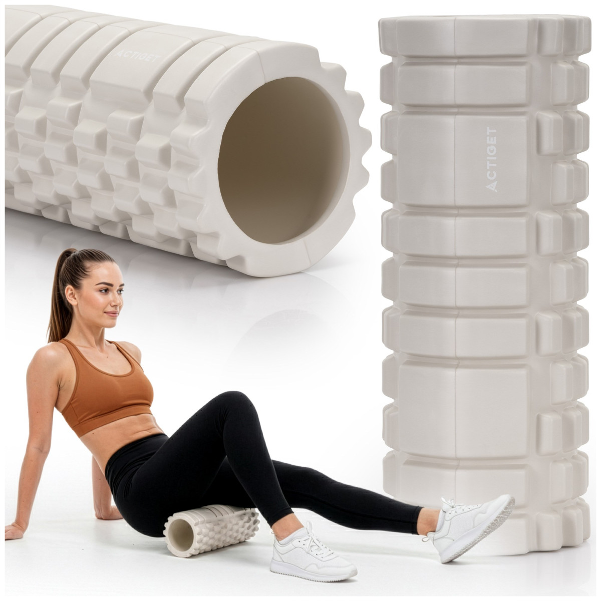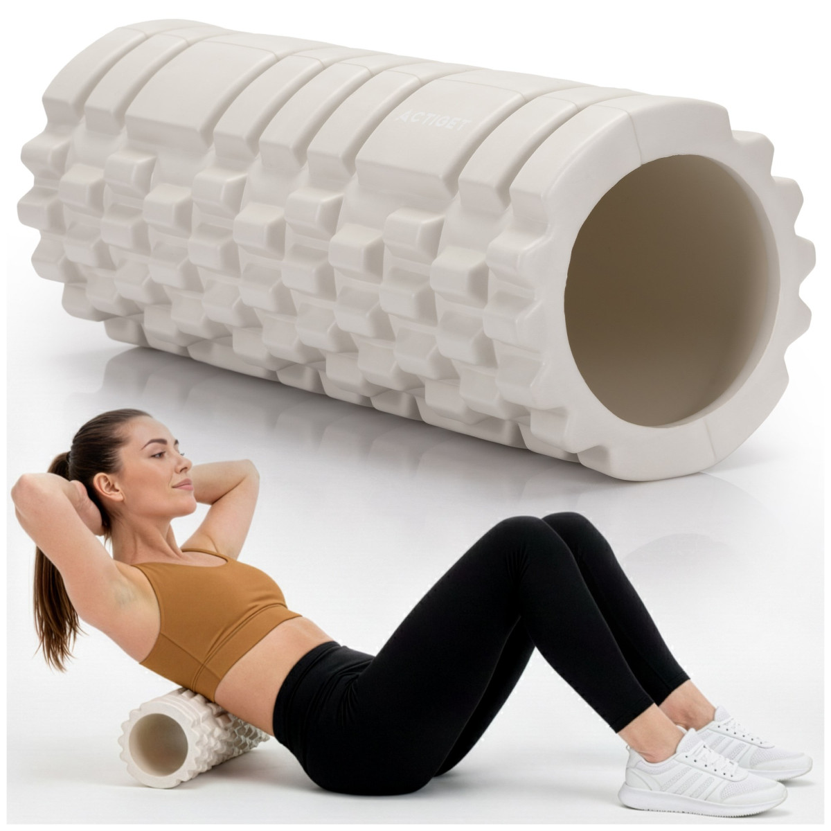 Prekės ženklas: Actiget® Serija moterims Spalva: šviesiai smėlinė Medžiaga: EVA putos, PVC Svoris: 825 g Maksimalus naudotojo svoris: 150 kg Vidutinio kietumo masažo volas (50° Shore A) Išmatavimai: Ilgis: 33 cm Išorinis skersmuo: 13,5 cm Vidinis skersmuo: 9,5 cm Putų storis: 2 cm Papildoma informacija: Gaminys pažymėtas Actiget® logotipu
