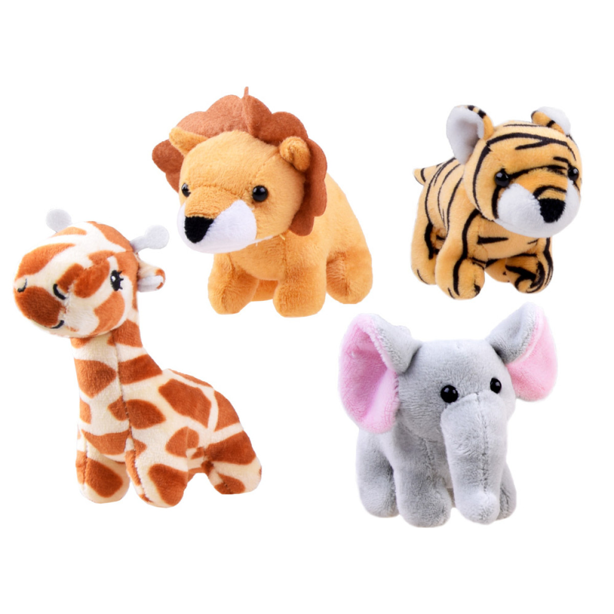 Pasiūlymas vaikams su safari dvasia! Plušinė safari žaislinė apima keturis mielus gyvūnus: dramblys, liūtas, tigras ir žirafa. Šie žaislai puikiai tiks vaikų rankoms, nes yra mažo dydžio ir itin švelnūs. Kiekvienas gyvūnas, paspaudus pilvą, išleidžia smagų garsą, kuris pritrauks mažylio dėmesį. Žirafa turi išsiuvinėtus akių ir nosies brėžinius, o dramblys, tigras ir liūtas - plastikines akis.